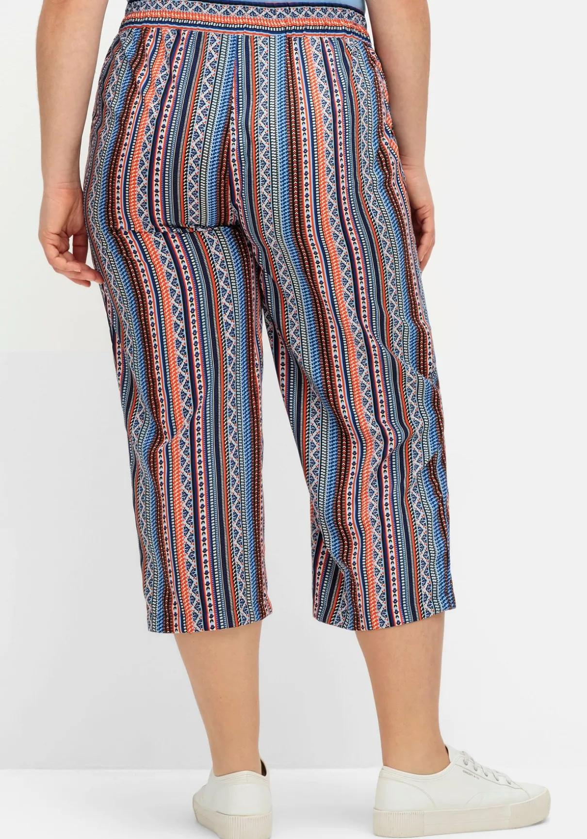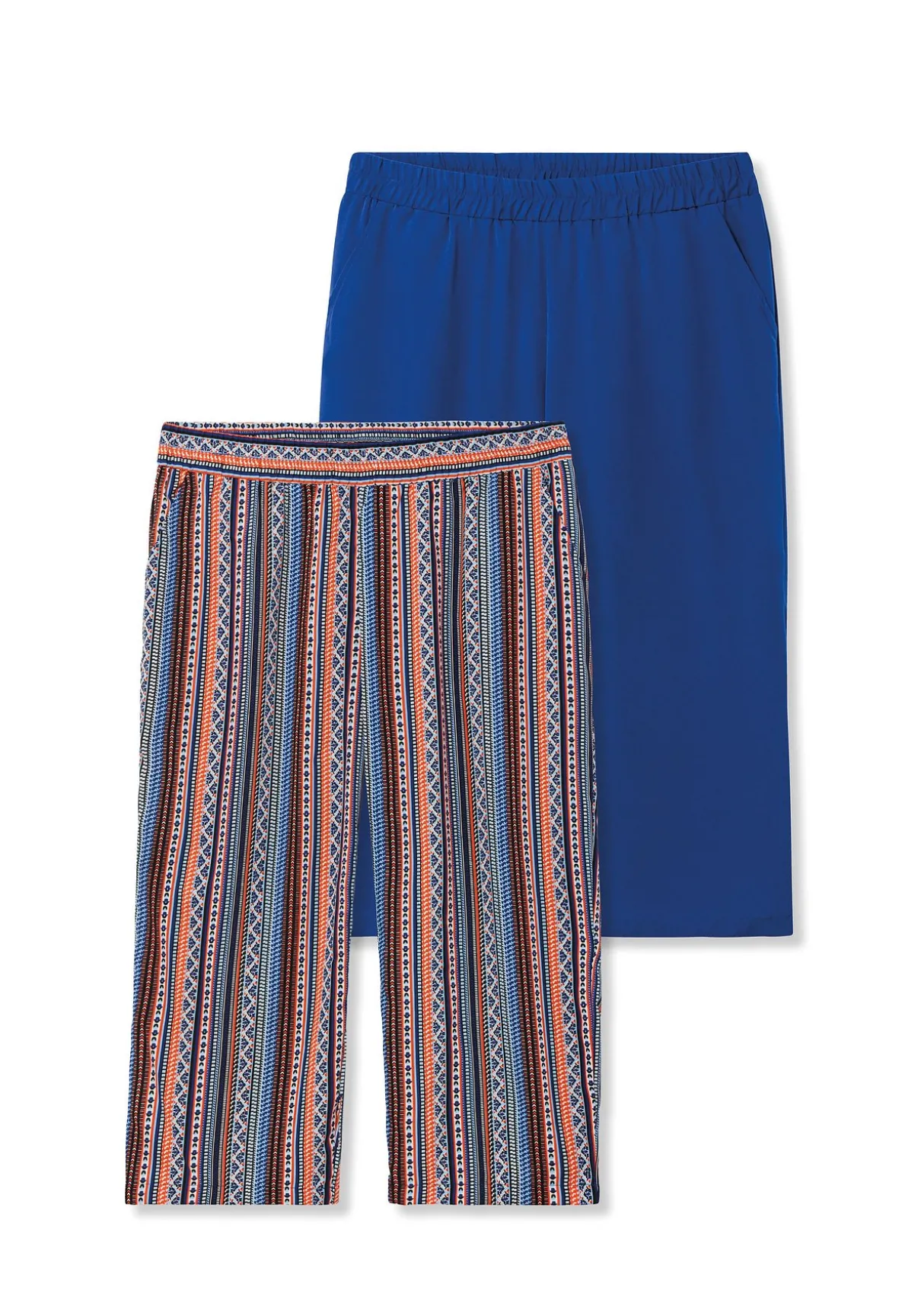 Schlupfhose im Doppelpack. Ob schlicht in Uni oder gestreift im Ethno-Look: Diese Hosen sind ideale Sommerbegleiter. Der elastische Bund trägt sich bequem, die weite und verkürzte Form sorgt für eine modische Silhouette. Praktische Eingrifftaschen ergänzen den Look.