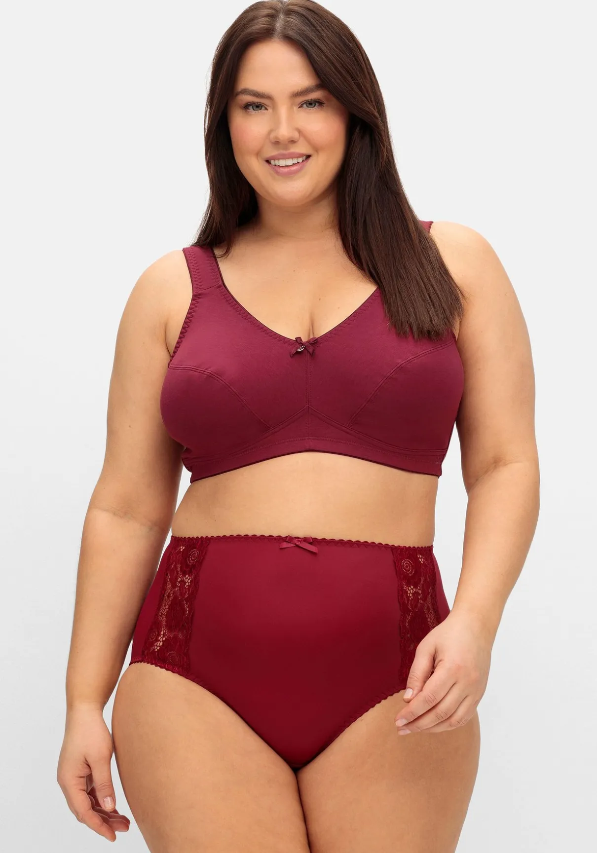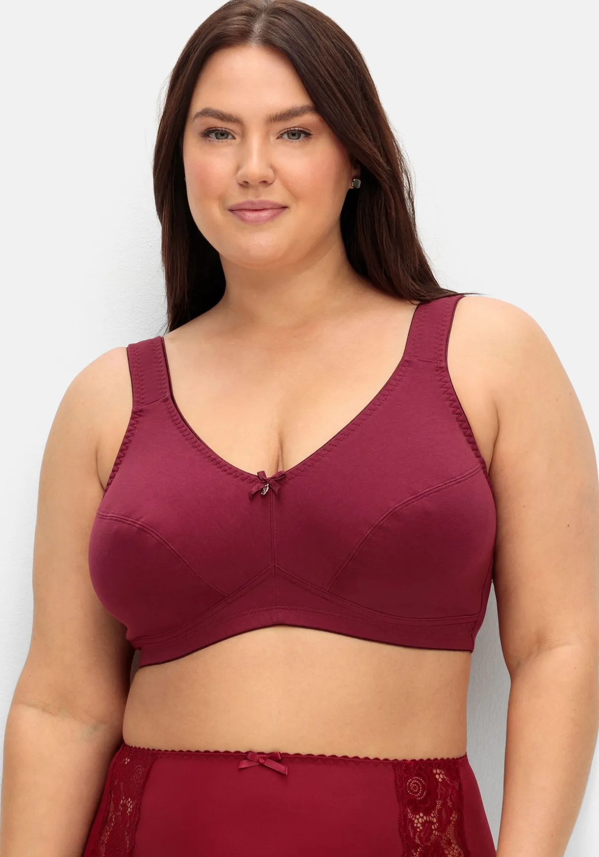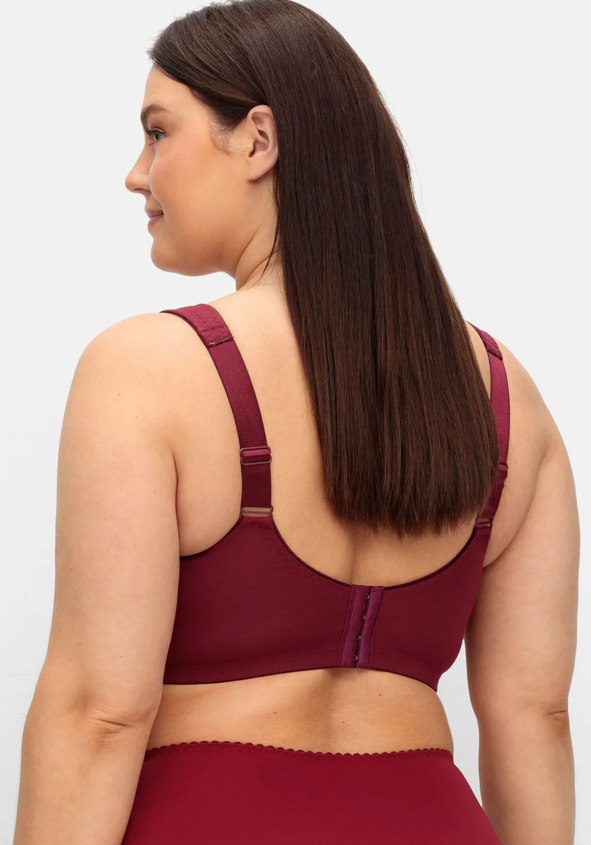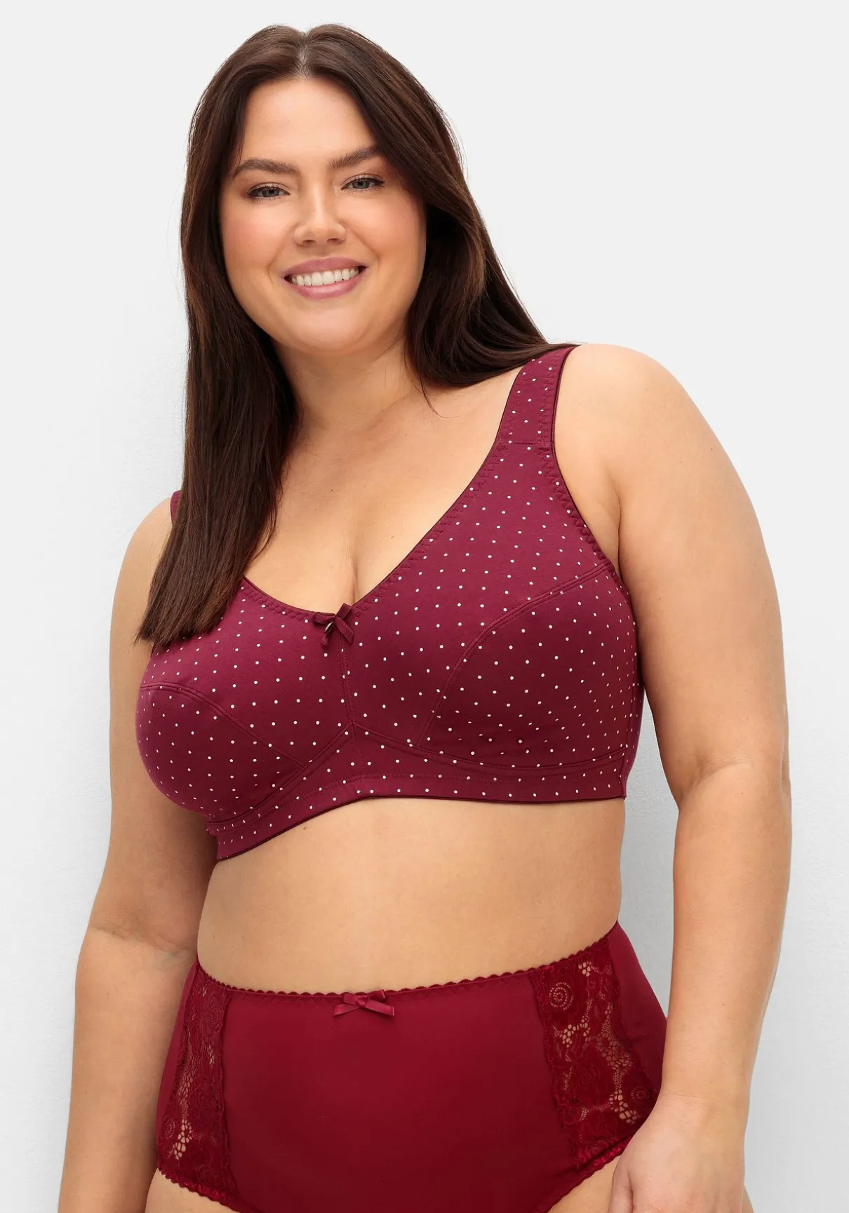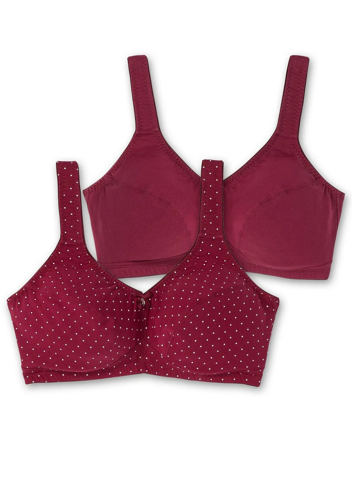 BH ohne Bügel im Doppelpack, 1 x unifarben und 1 x gepunktet. Breitere, wattierte Träger schneiden nicht ein, das breite Unterbrustband stützt die Brust. Auch die abdeckende Schnittform gibt zuverlässigen Halt und Komfort. Weitere praktische Eigenschaften sind die verstellbaren Träger sowie der verstellbare Rückenverschluss.