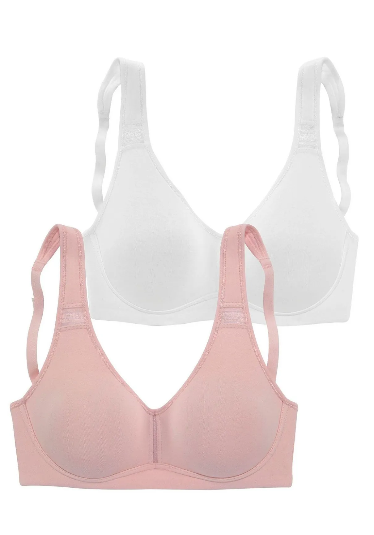 BH ohne Bügel von Petite Fleur im praktischen 2er-Pack. Nahtlos vorgeformte, unwattierte Cups. Breite, wattierte Träger für einen guten Halt. Träger und Rückenverschluss verstellbar. Aus 95% Baumwolle, 5% Elasthan. BHs sind nicht trocknergeeignet, da die Versteller und Ringe durch die Hitze beschädigt werden und brechen.