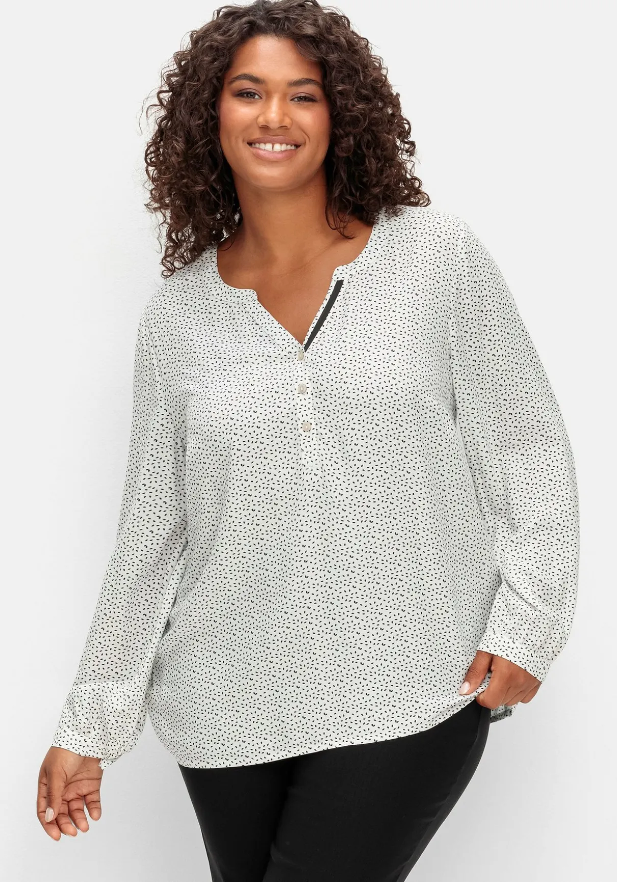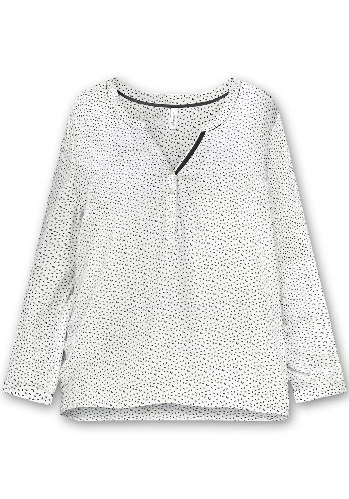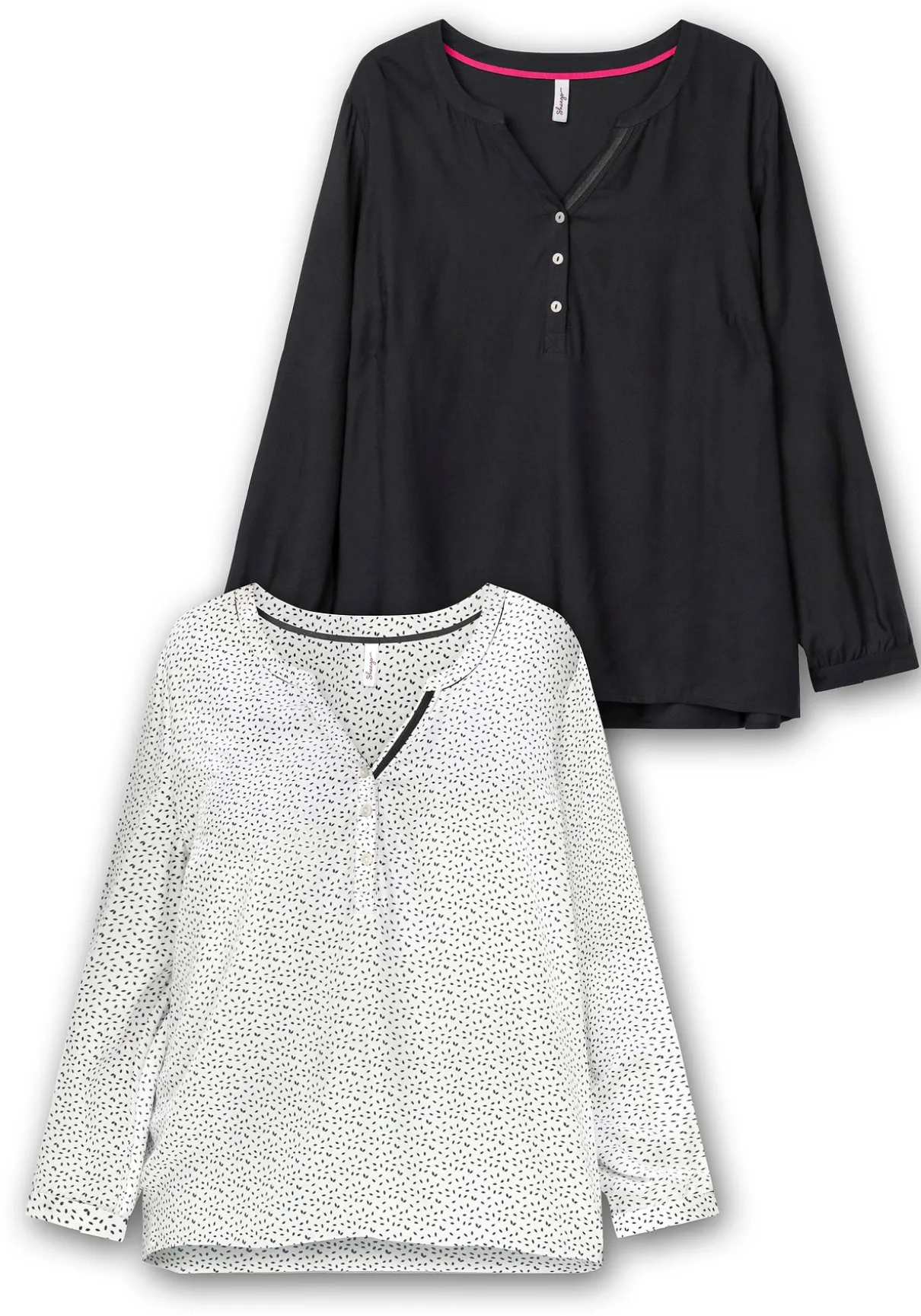 Tunika im Doppelpack, 1x unifarben und 1x mit Minimalprint. Der Rundhalsausschnitt geht in Schlitz und Knopfleiste über, die langen Ärmel enden mit Manschetten und Knopf.