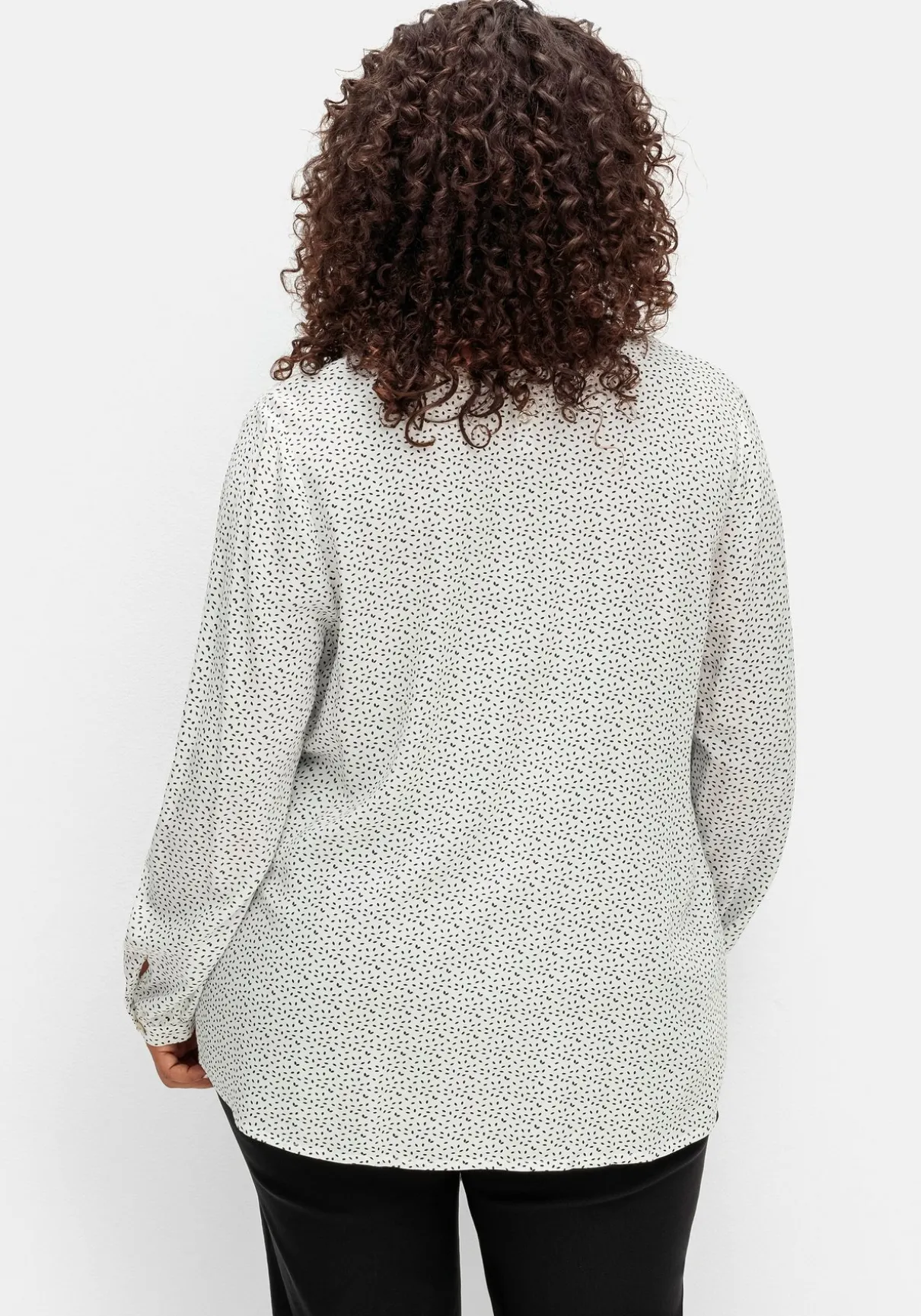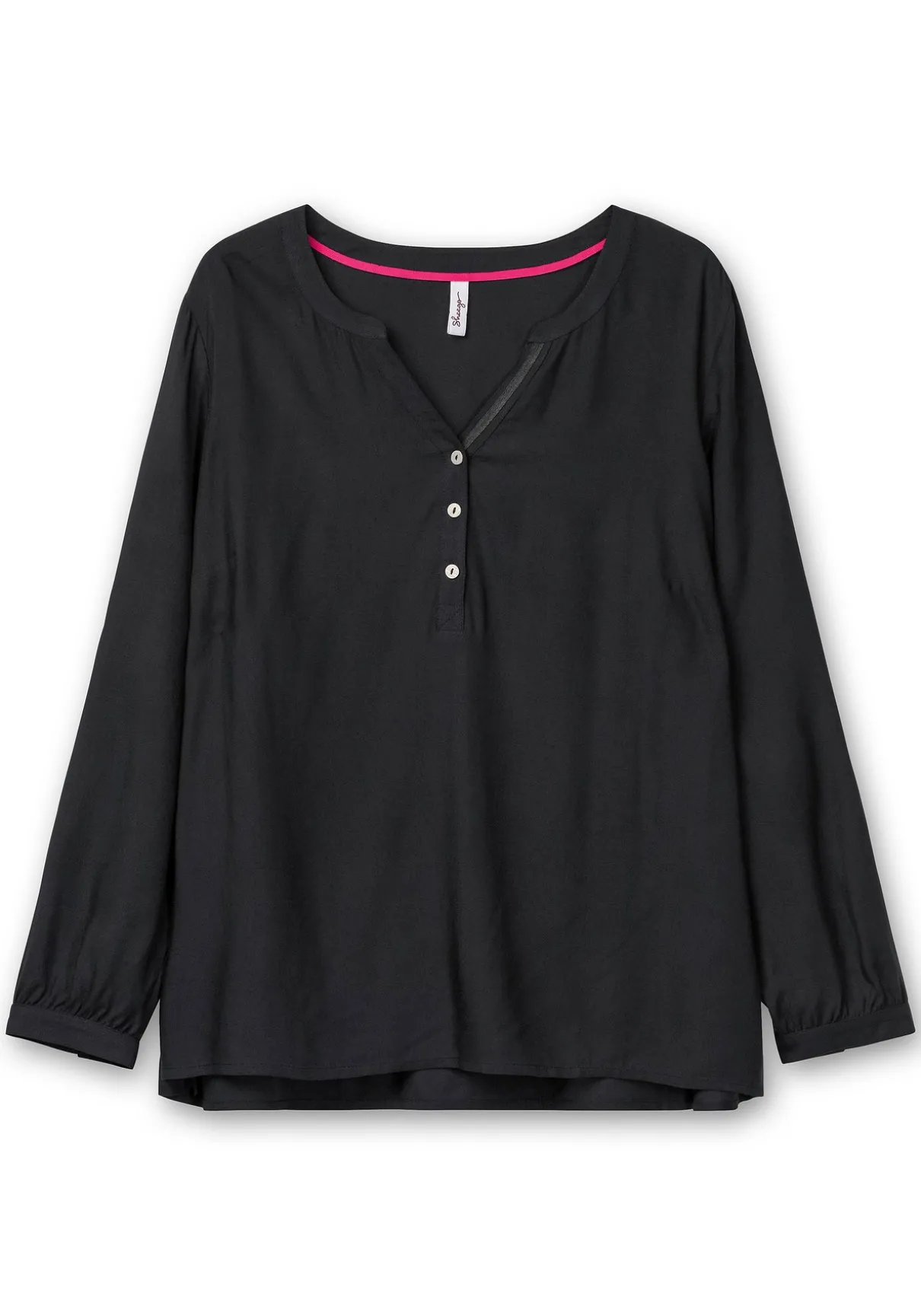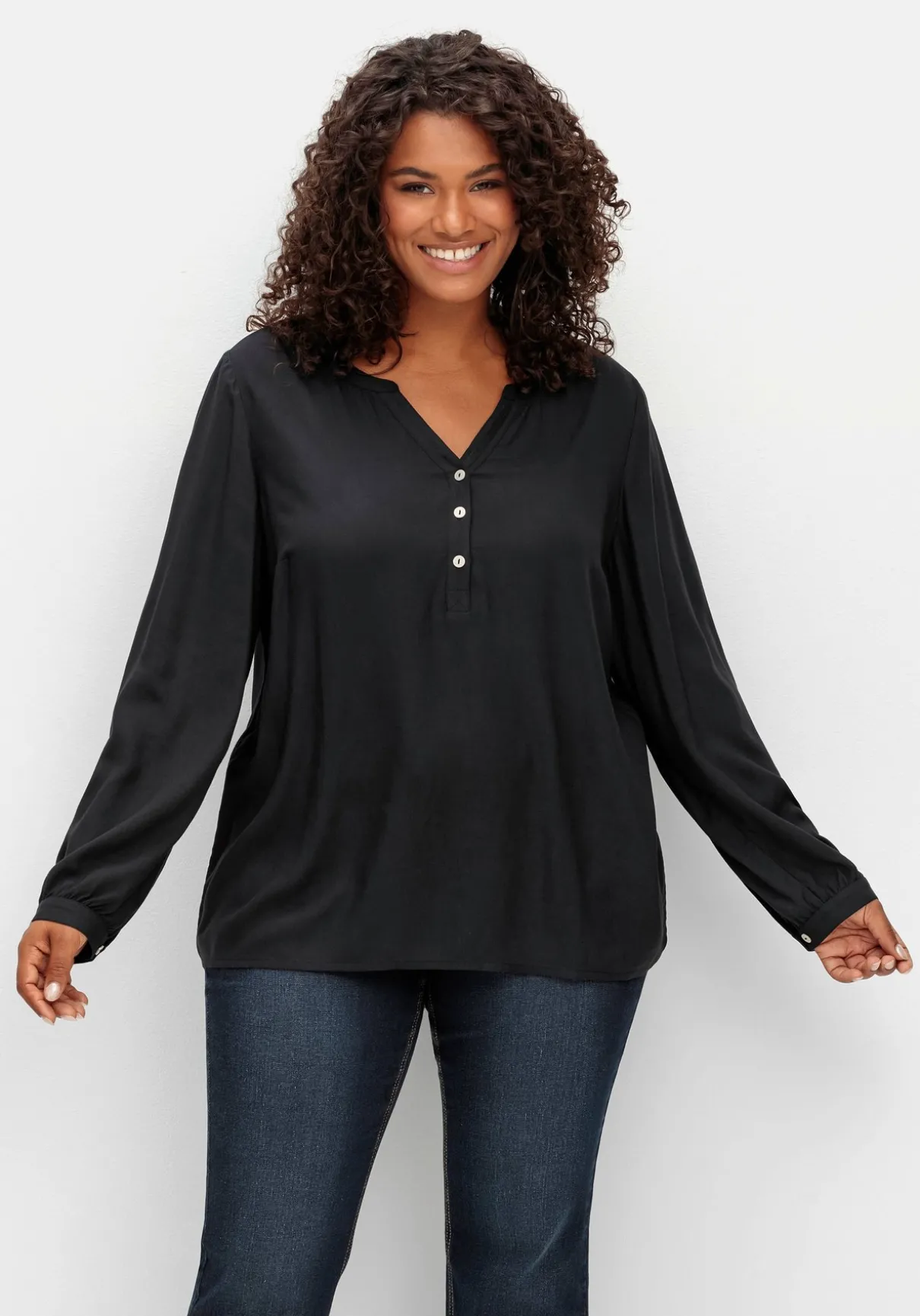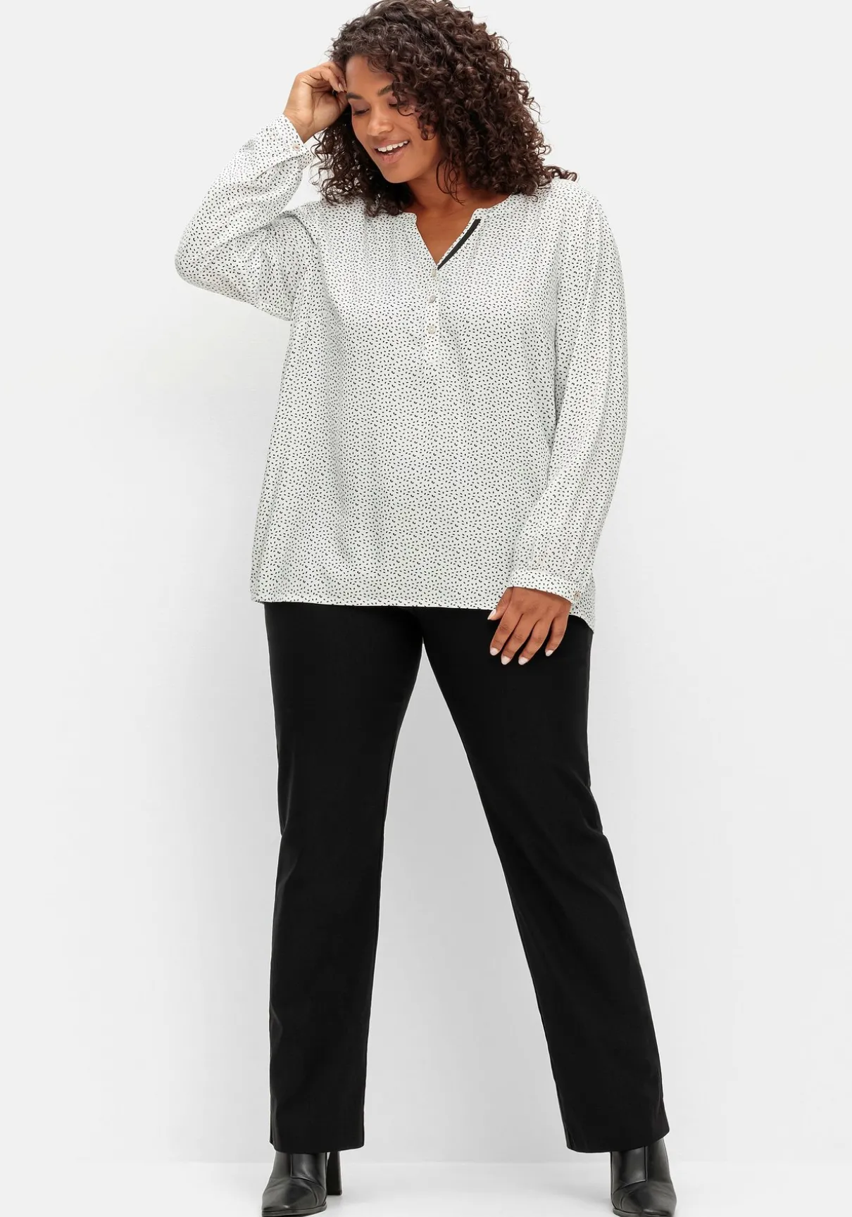 Tunika im Doppelpack, 1x unifarben und 1x mit Minimalprint. Der Rundhalsausschnitt geht in Schlitz und Knopfleiste über, die langen Ärmel enden mit Manschetten und Knopf.