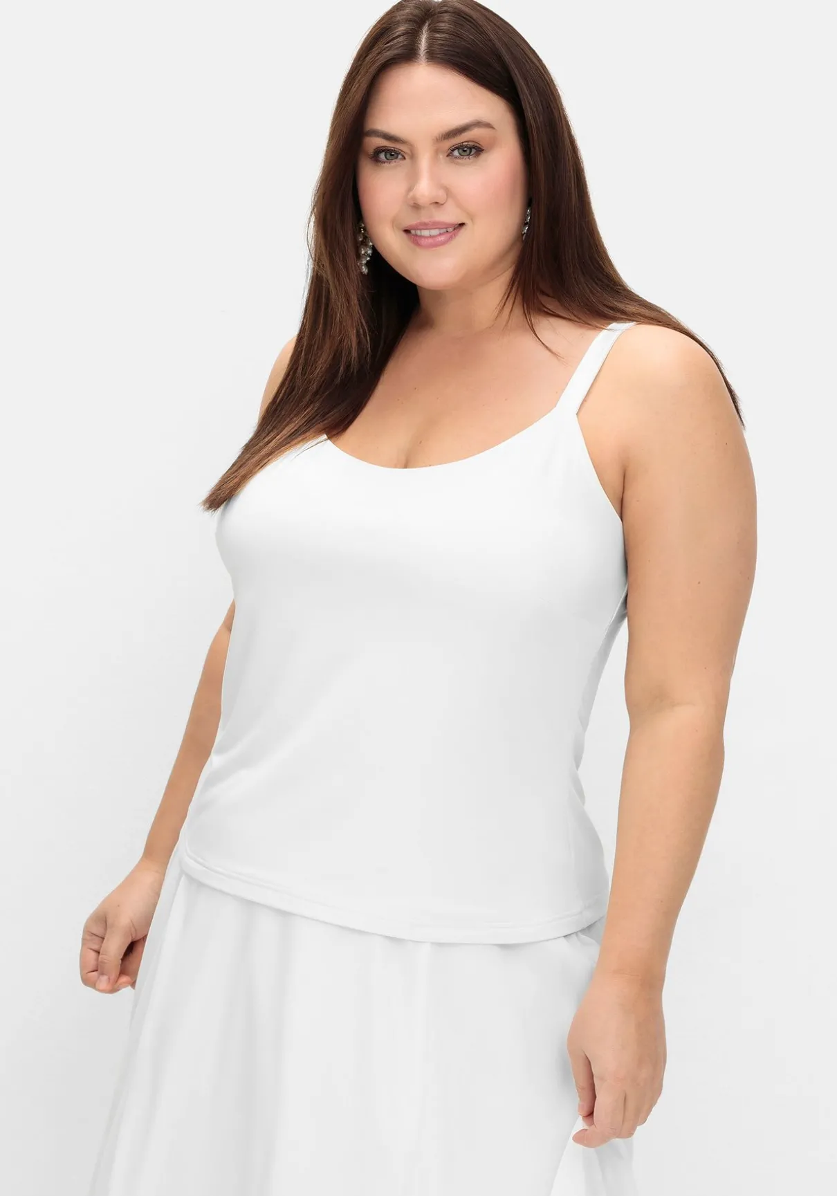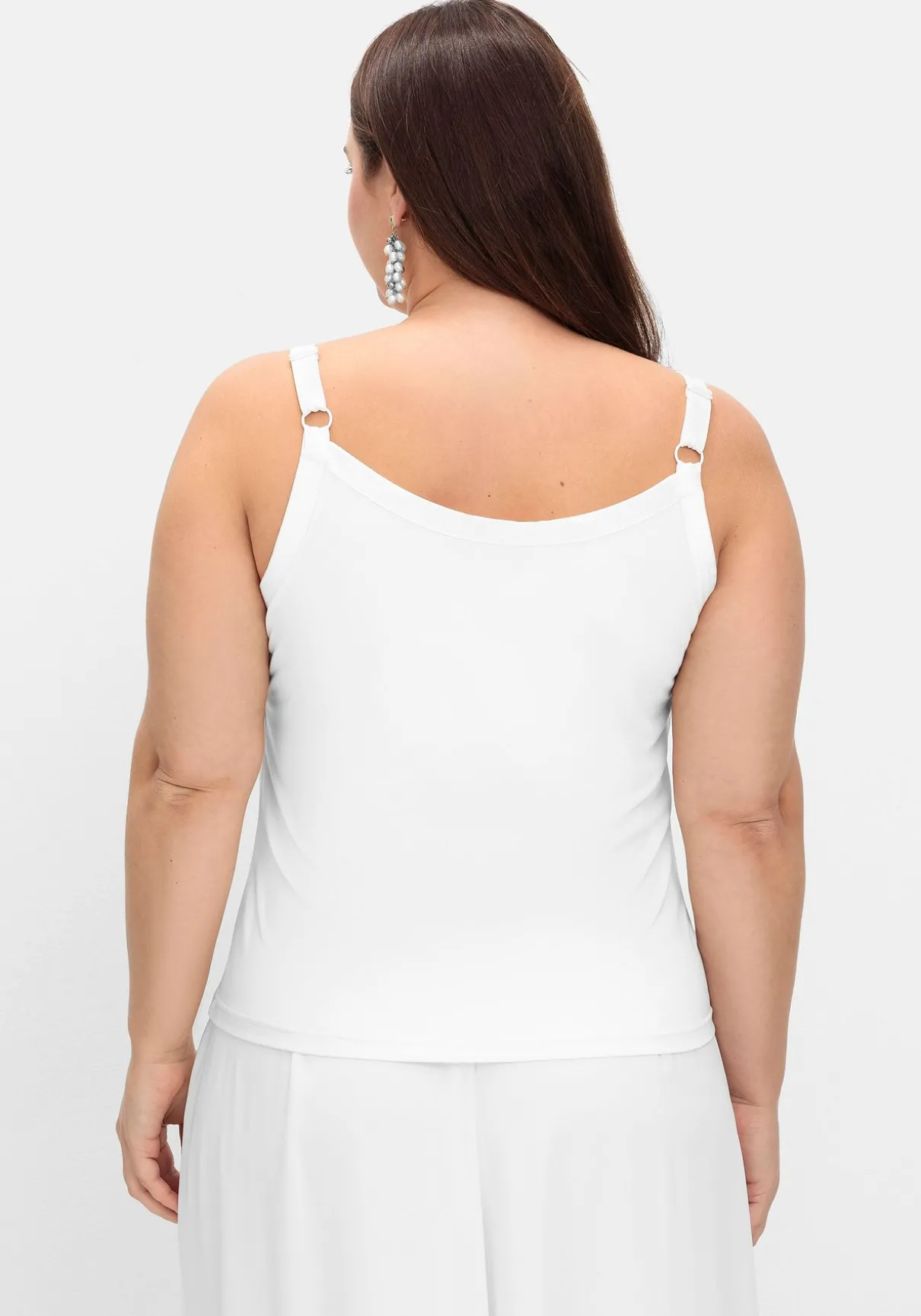 Spaghettitop in edler Optik. Der tiefe Rundhalsausschnitt und Armlöcher erhalten durch den Besatz in feiner Satinoptik dezente Eleganz. Auch die schmalen Träger sind in schimmernder Optik gearbeitet. Durch die doppelte Lage wird das Top angenehm blickdicht. Es lässt sich ideal auch zu festlichen Outfits tragen und passt in der Farbe Offwhite perfekt zu unseren Hochzeits-Kombinationen.
