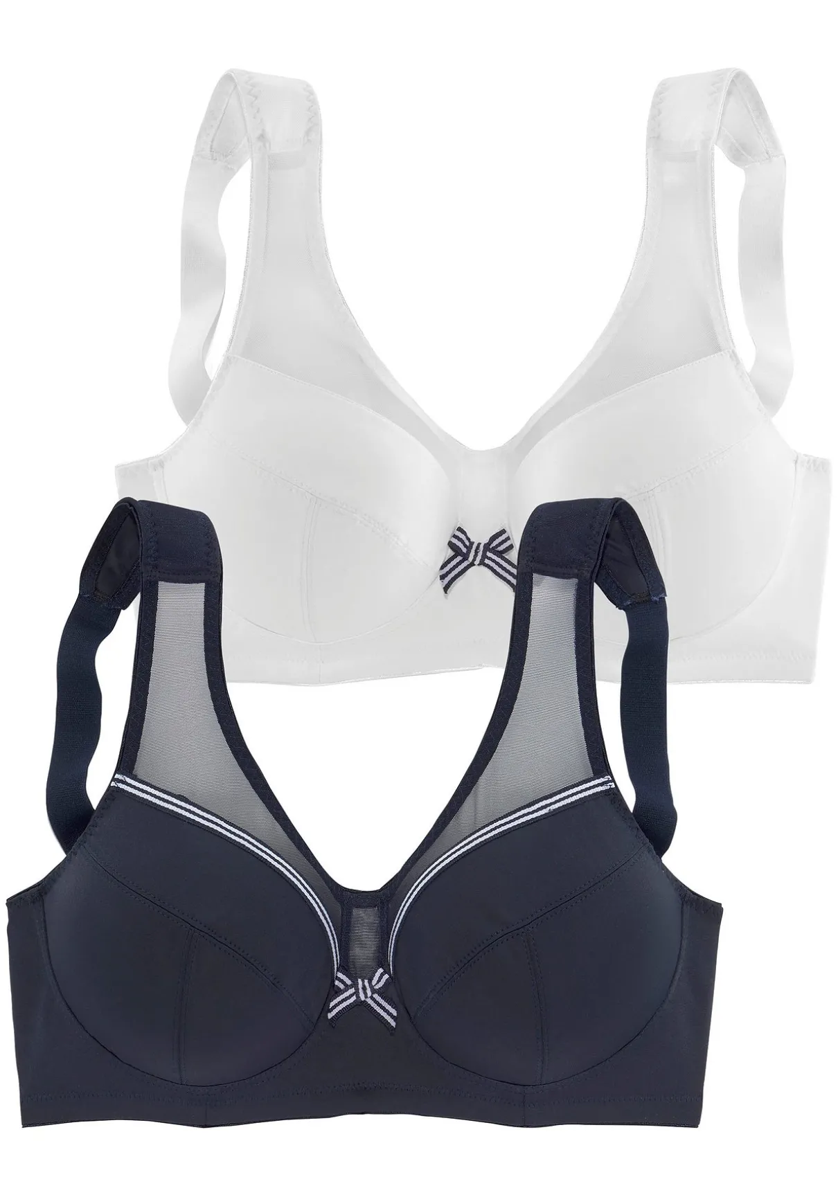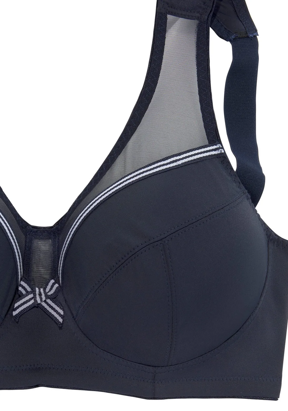 Ohne Bügel und ohne Wattierung aus angenemen Microtouch-Material. Gestreiftes Zierband und Netzeinsatz am Obercup. Optimale Passform mit seitlicher Stütze sorgt für Halt. Breitere, gefütterte Träger sorgen für angenehmen Tragekomfort und verhindern ein Einschneiden. Träger und Rückenverschluss verstellbar. Der BH ist aus 80% Polyamid, 20% Elasthan. BHs sind nicht trocknergeeignet, da die Versteller und Ringe durch die Hitze beschädigt werden und brechen.