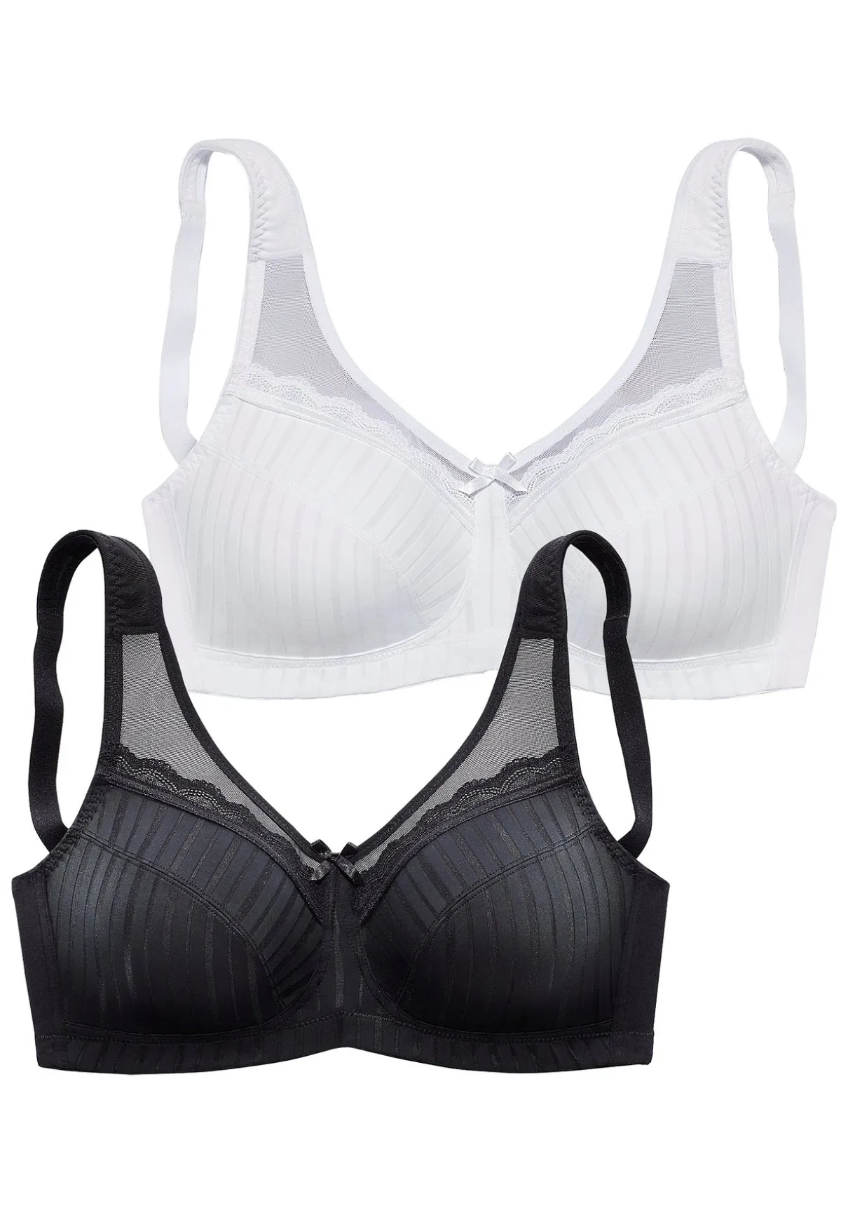 Klassischer Entlastungs-BH aus floraler Spitze und feinem Soft Mesh (ohne Wattierung). Breite gefütterte Träger entlasten die Schultern für maximalen Tragekomfort. Kommt im attraktiven Doppelpack. Individuell verstellbare Träger und Rückenverschluss. Mit Liebe & Leidenschaft in Hamburg kreiert. Obermaterial: 45% Polyamid, 40% Baumwolle, 15% Elasthan.