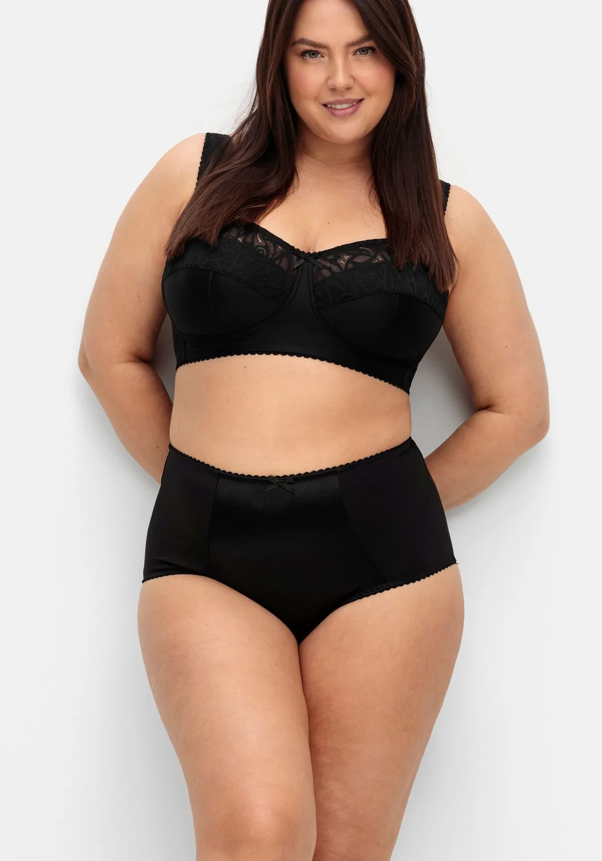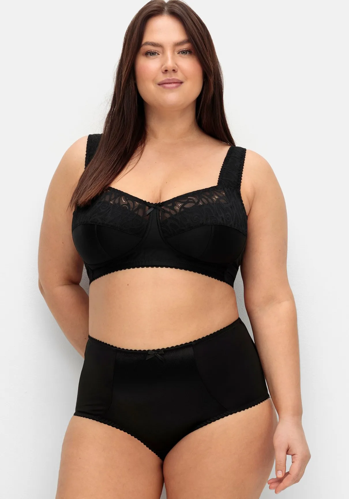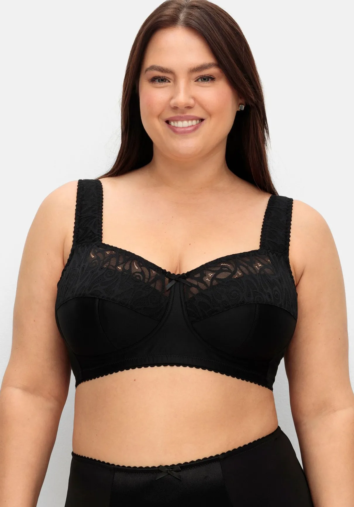 Entlastungs-BH ohne Bügel. Durch die transparente Spitze erhält der BH femininen Appeal, die mit Mesh unterlegten Cups machen den Look blickdicht. Auch die Träger sind aus zarter Spitze gearbeitet. Dazu überzeugt der bügellose BH mit hohem Tragekomfort: Die Cups decken die Brust komplett ab, die breiten, leicht gefütterten Träger schneiden nicht ein. Zusätzlich stützt und entlastet das breite Unterbrustgummi.