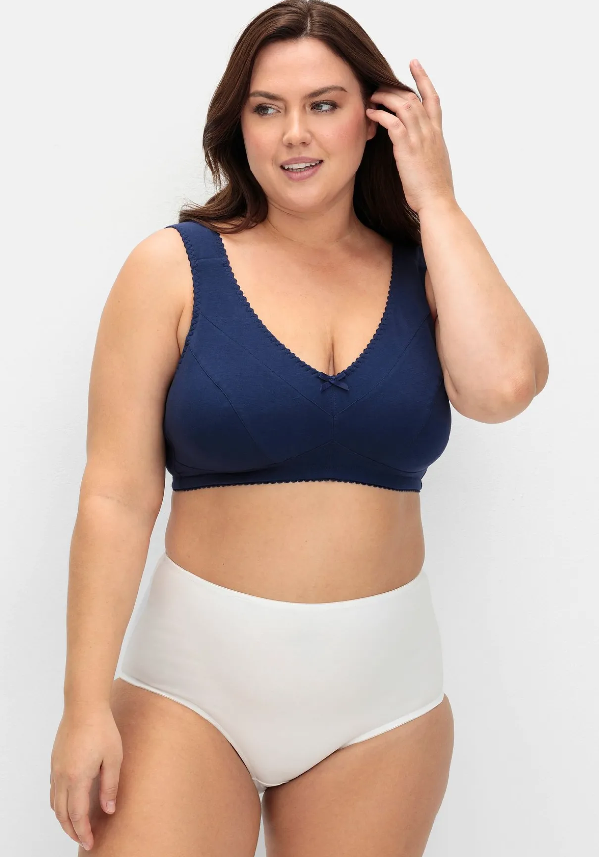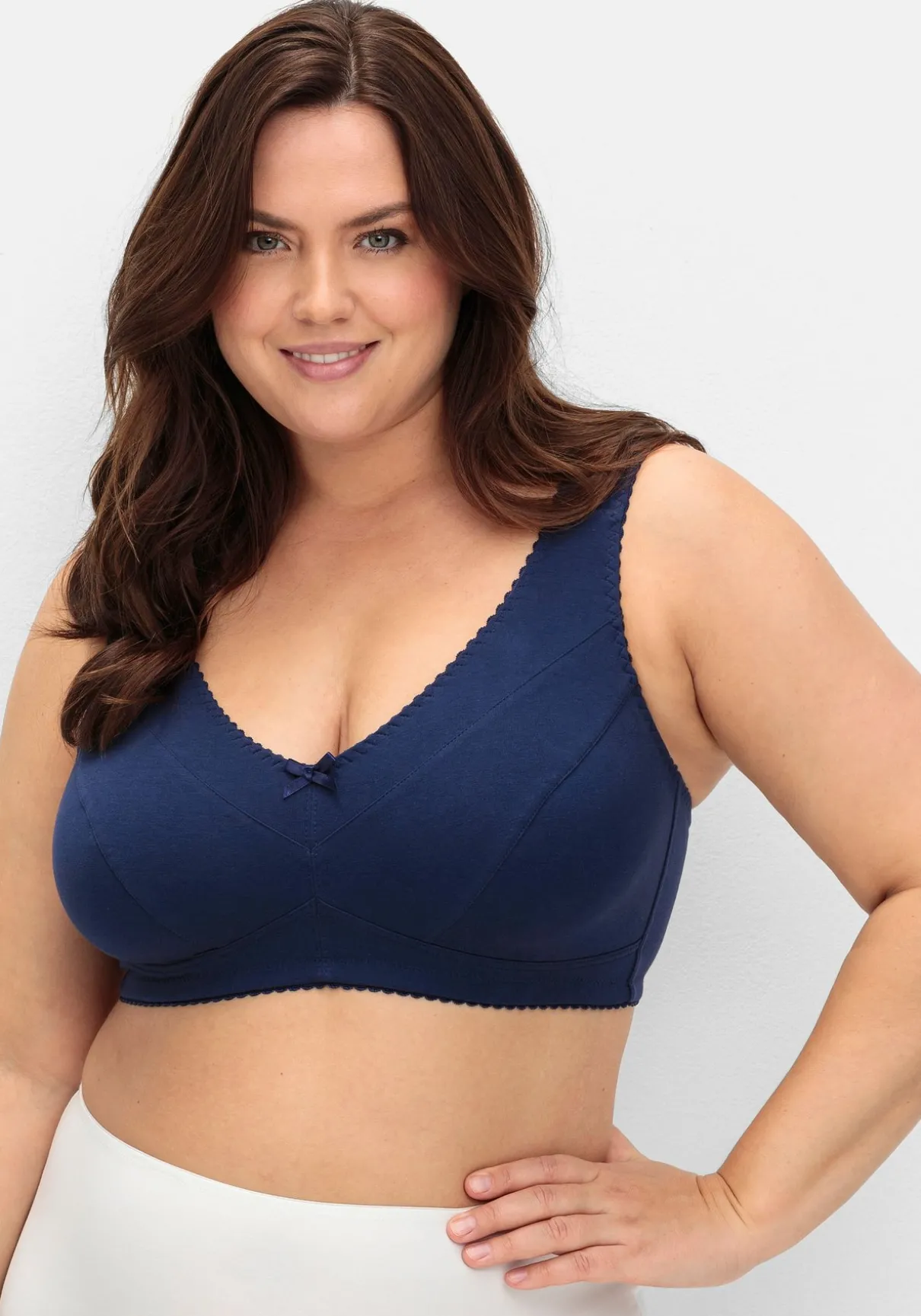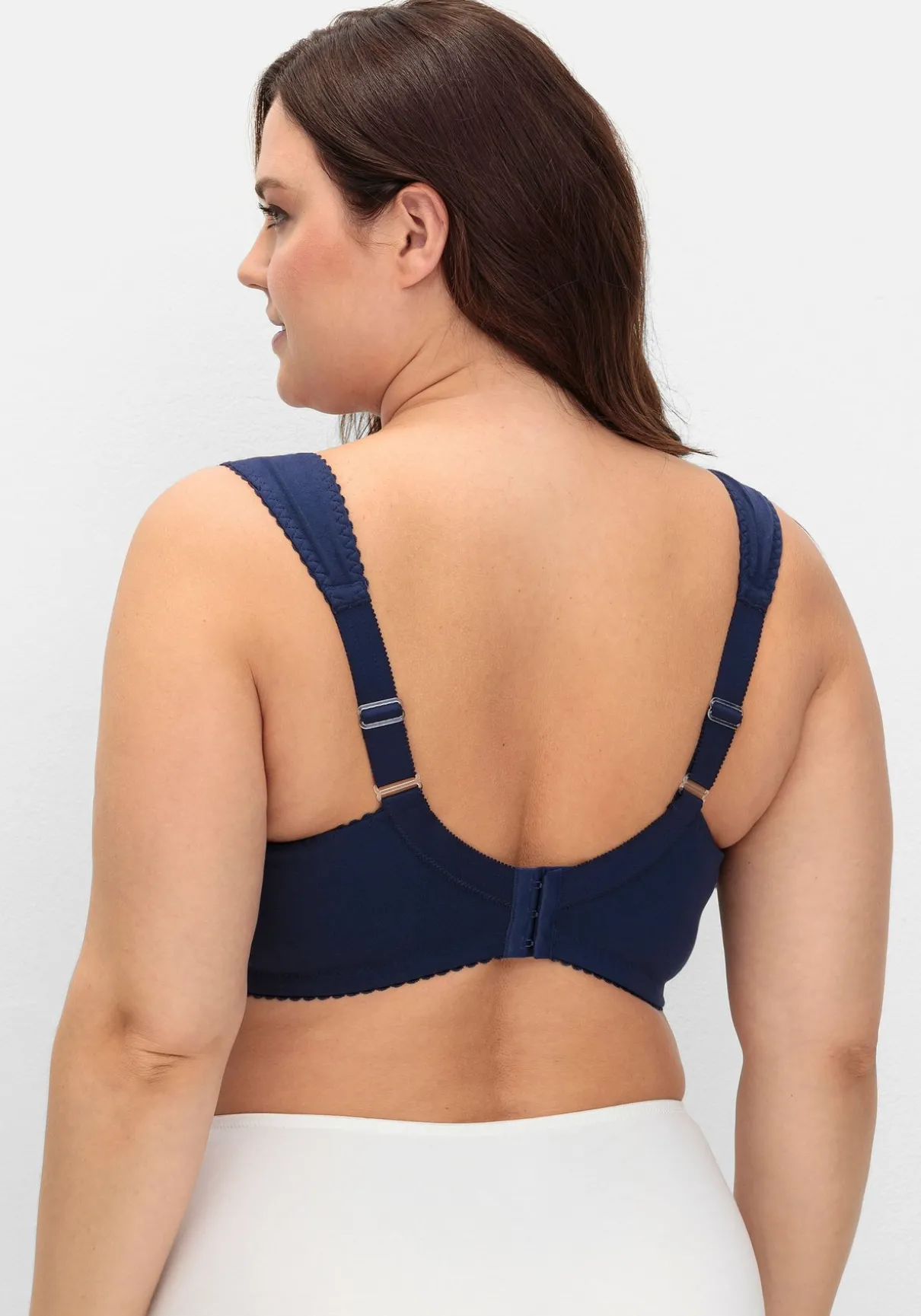 Entlastungs-BH in bügelloser Form. Einen optimalen Sitz versprechen die breiten Träger, auch der eingearbeitete Unterbrustgummi stützt optimal die Brust. Die abdeckende Schnittform gibt der Brust auch ohne Bügel Halt. Der wattierte Rückenverschluss ist bequem und genau wie die Träger individuell verstellbar.