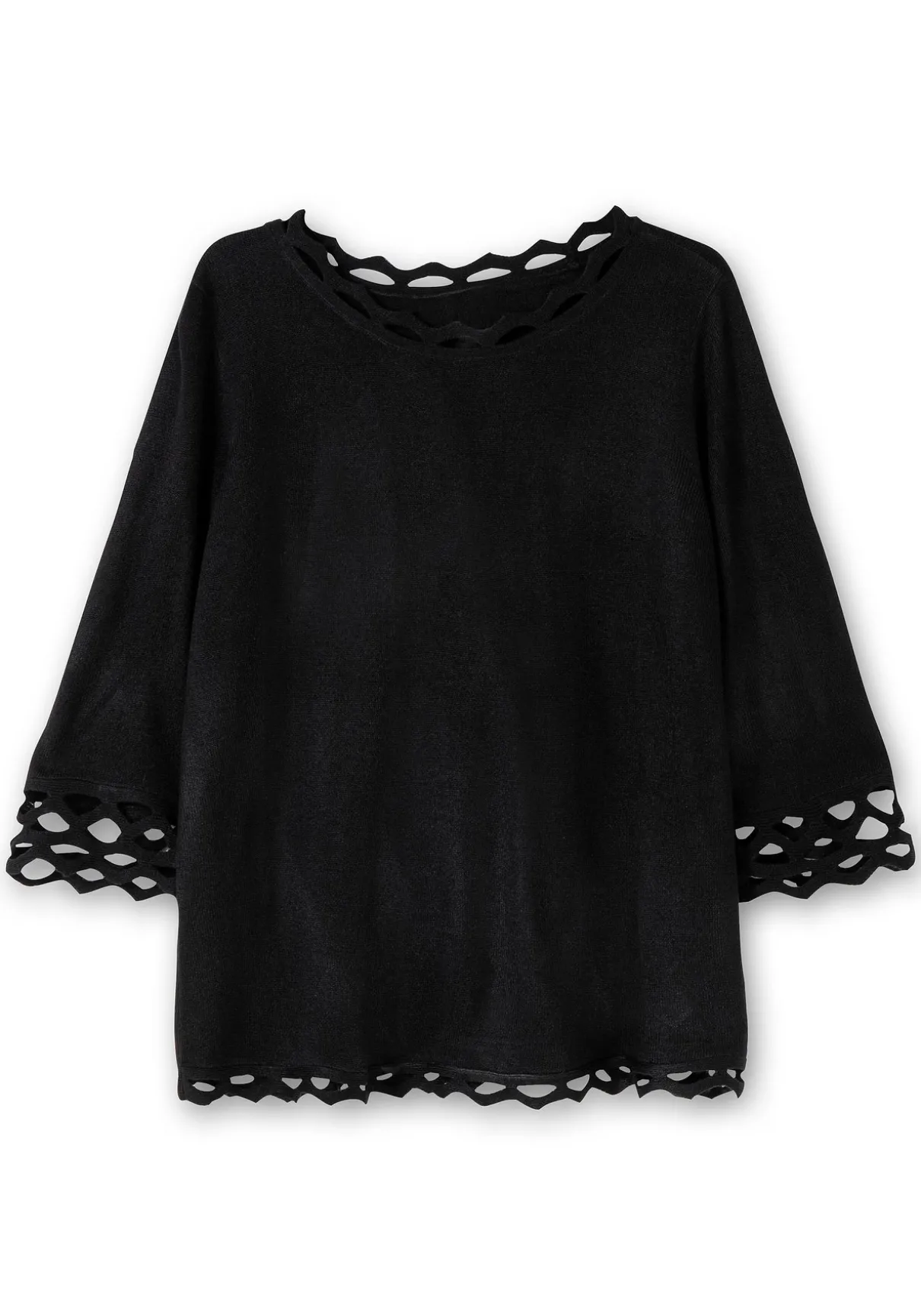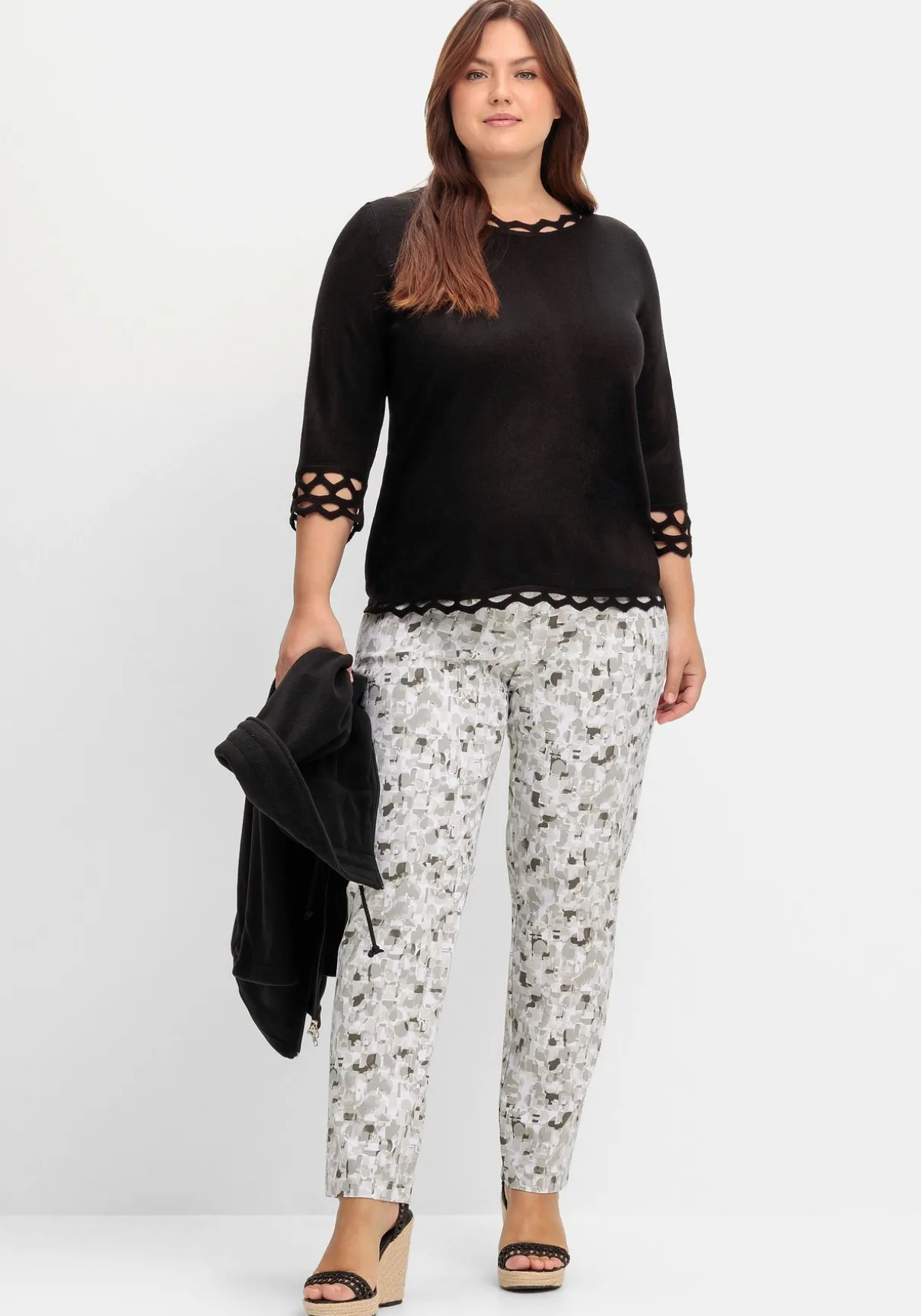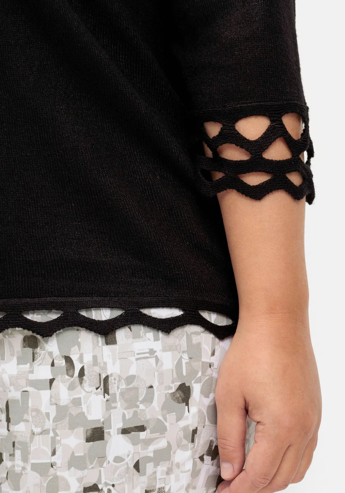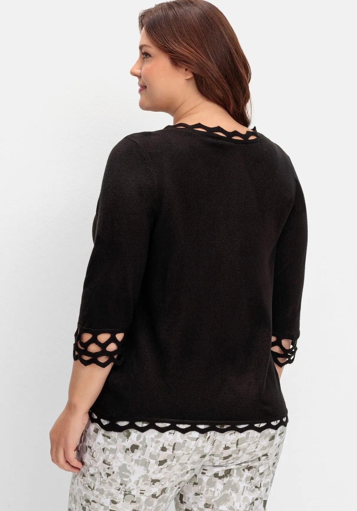 Pullover mit 3/4-Arm. Die breite, filigran gearbeitete Zierborte an Rundhalsausschnitt, Ärmel und Saum zieht die Blicke auf sich und verleiht dem Strickpullover ein feminines Finish.
