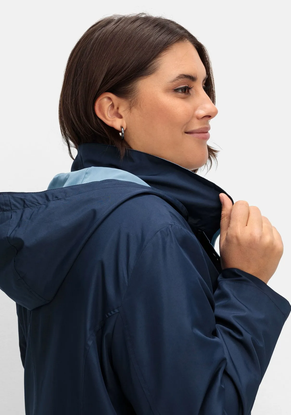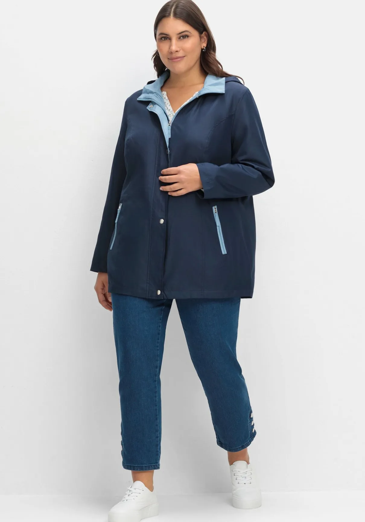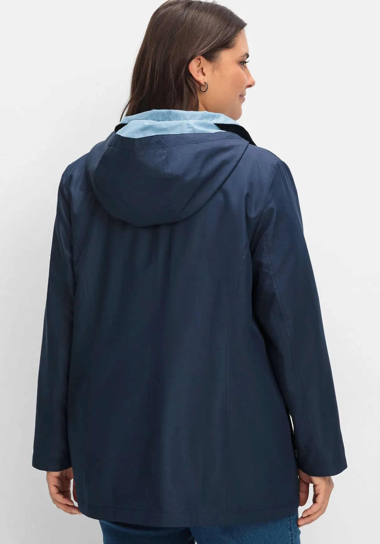 Funktionsjacke mit Kapuze. Die kontrastfarbenen Partien sorgen hier für einen modischen Auftritt. Dazu kommen der Umlegekragen und eine verdeckte Knopfleiste mit silberfarbenen Druckknöpfen. Praktisch sind die beiden schrägen, kontrastfarben paspelierten Reißverschlusstaschen sowie die Innentasche.