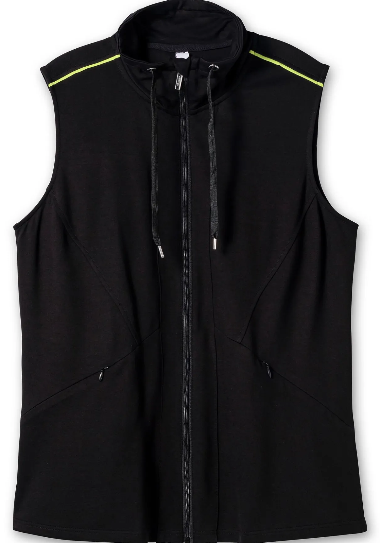 Weste mit durchgehendem Reißverschluss. Am kurzen Stehkragen ist ein Bindebändchen eingearbeitet, die verdeckten Taschen sind mit Reißverschluss zu schließen. Im Nacken besitzt die Weste einen kleinen reflektierenden Druck, kontrastfarbene Details runden den sportiven Look modisch ab. Ein praktischer Begleiter für Wanderungen, Radtouren und andere Aktivitäten.