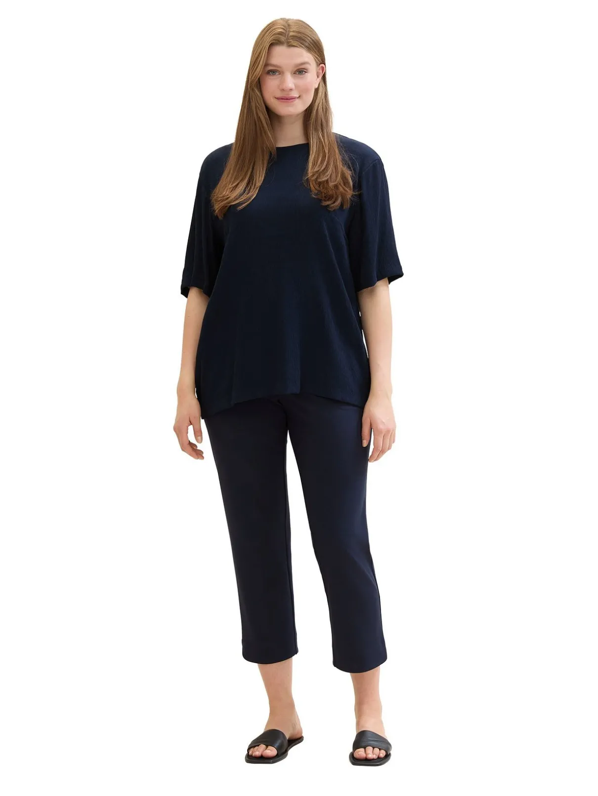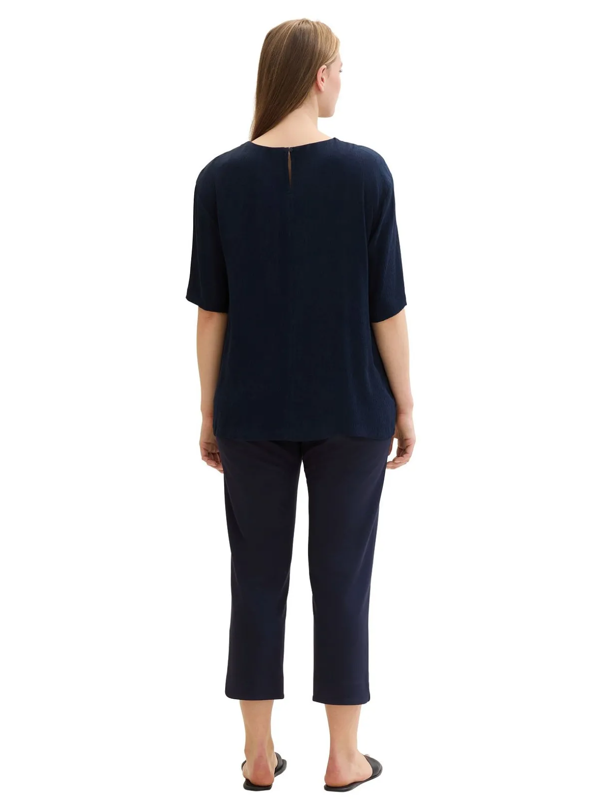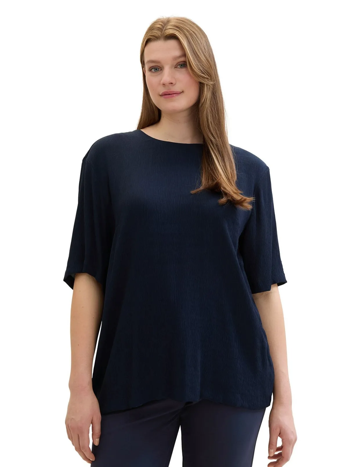 Tunika von TOM TAILOR Plus. Der schlichte, cleane Fit wird durch die gecrinkelte Struktur modisch aufgelockert. Ein Schlüssellochausschnitt im Nacken ergänzt den klassischen Rundhals, die halblangen Ärmel fallen angenehm locker.