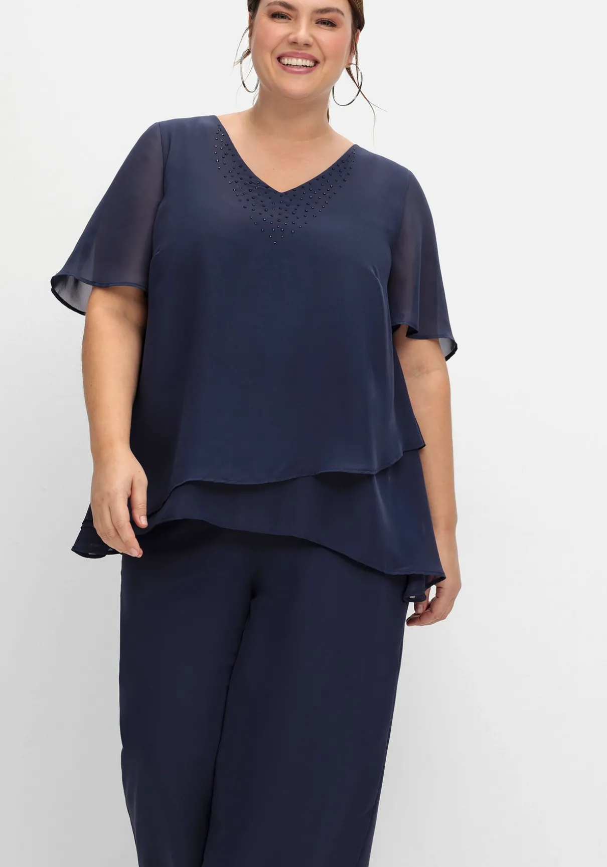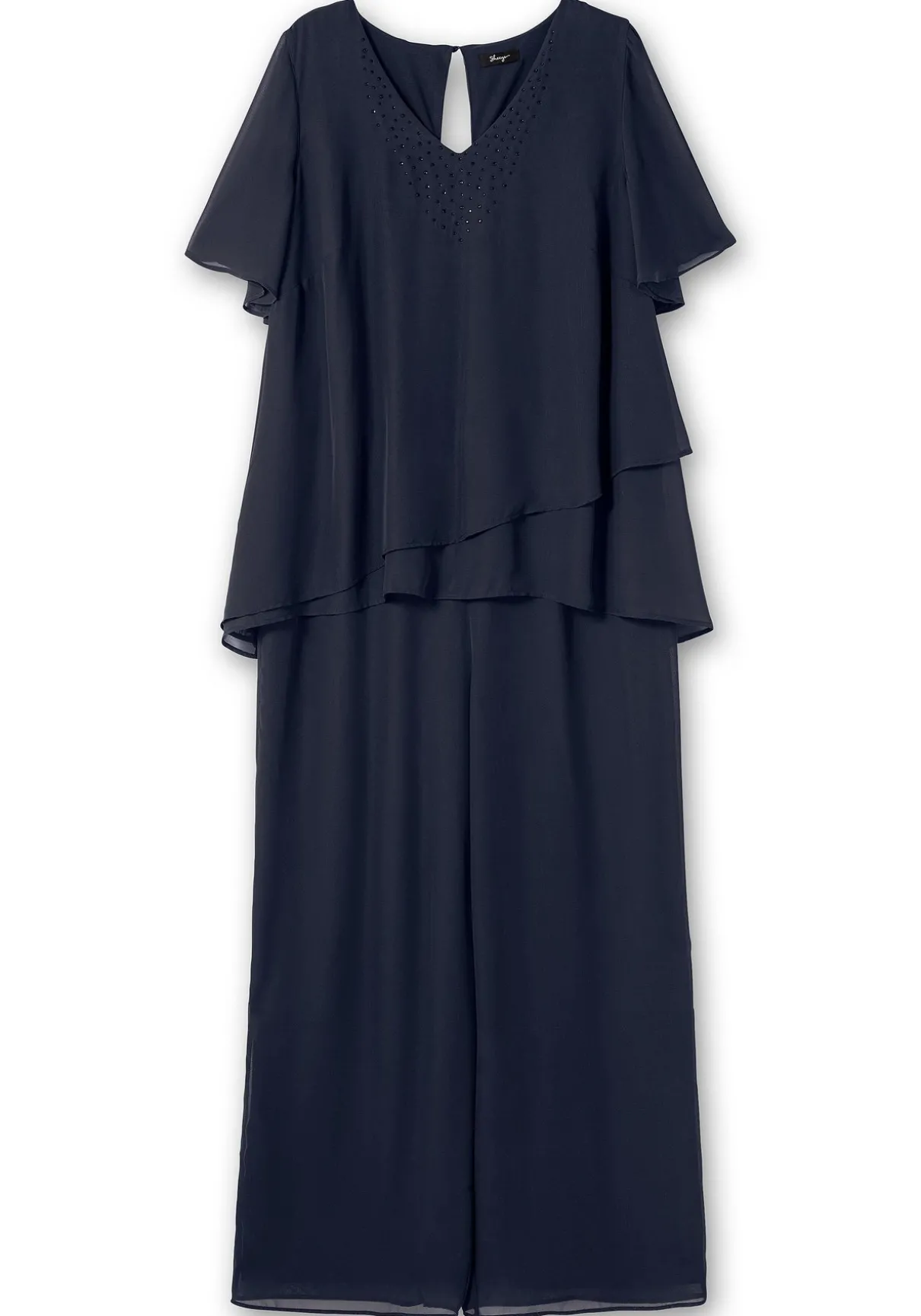 Overall in Layering-Optik. Der Einteiler besticht durch Eleganz und Tragekomfort: Die weite Schnittform trägt sich angenehm, die zarte Georgette-Qualität wirkt festlich und feminin. Ein mit Strasssteinchen besetzter V-Ausschnitt, die leicht transparenten Ärmel und der asymmetrische Saumverlauf geben dem Look zusätzliche Raffinesse. Die Rückenpasse ist mit Schlitz und Knopf gestaltet, der sich anschließende nahtfeine Reißverschluss ermöglicht einen bequemen Einstieg.