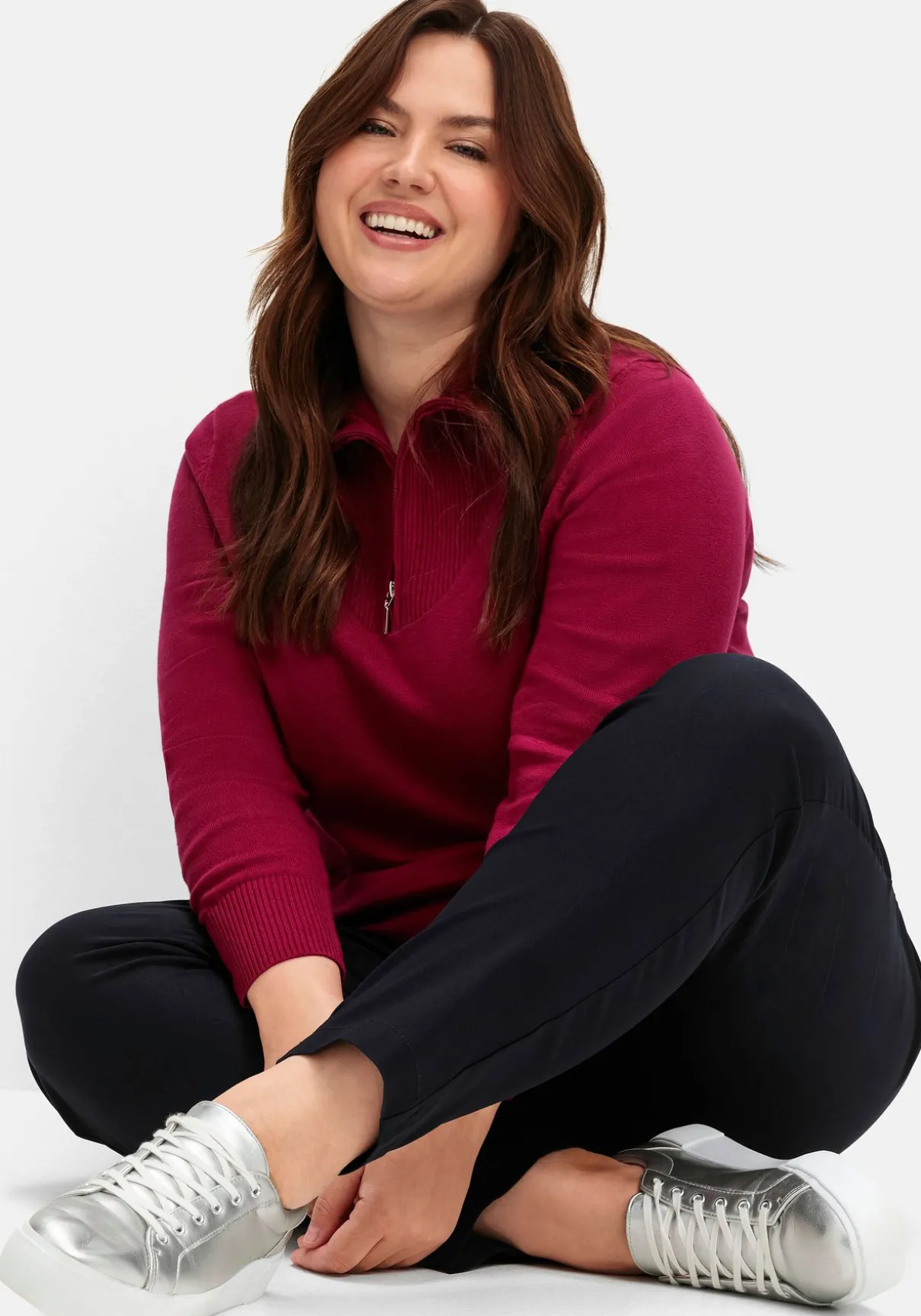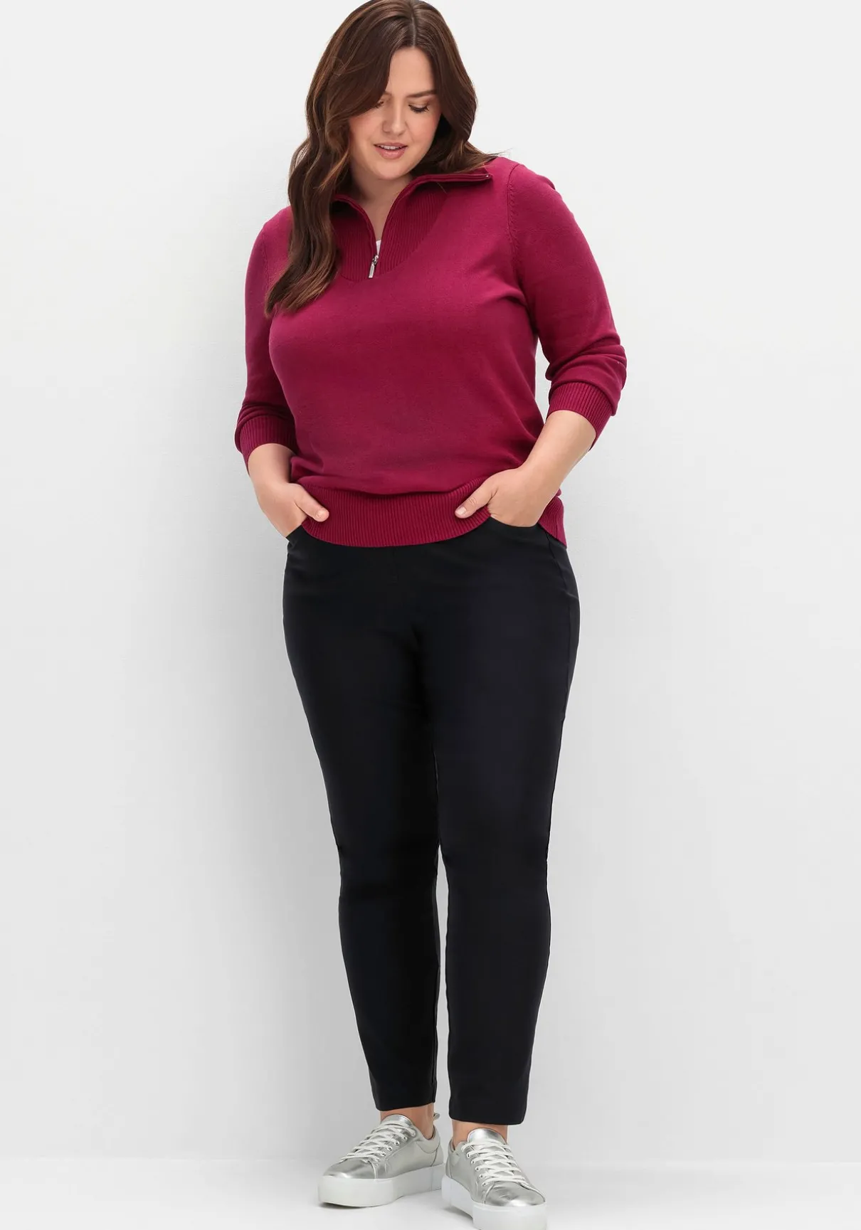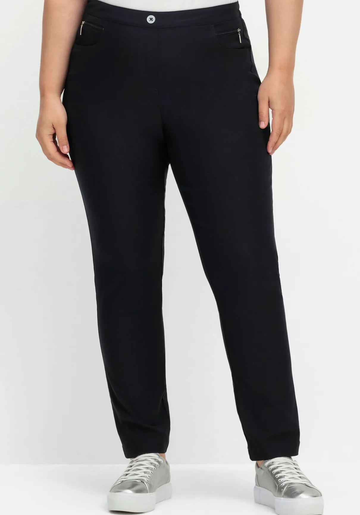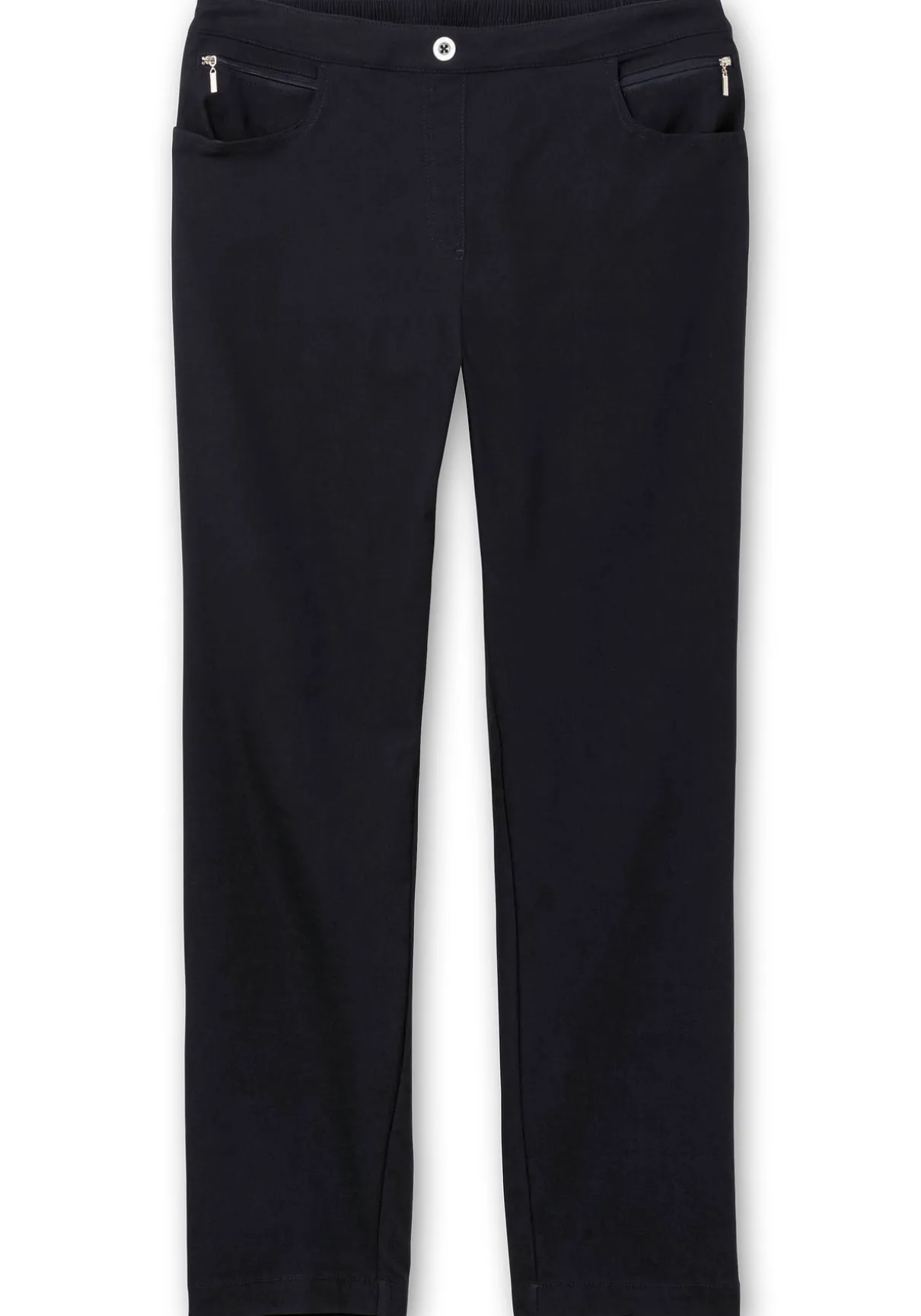 Bengalinhose in elastischer Qualität. Die Schlupfhose ist hinten am Bund mit elastischen Einsätzen gearbeitet und lässt sich dadurch bequem an- und ausziehen. Der Zierknopf und die imitierte Reißverschlussblende verleihen ihr eine gepflegte Optik. Vorn besitzt sie zwei abgerundete Eingrifftaschen, schmückende Zierreißverschlüsse dienen als modische Details.