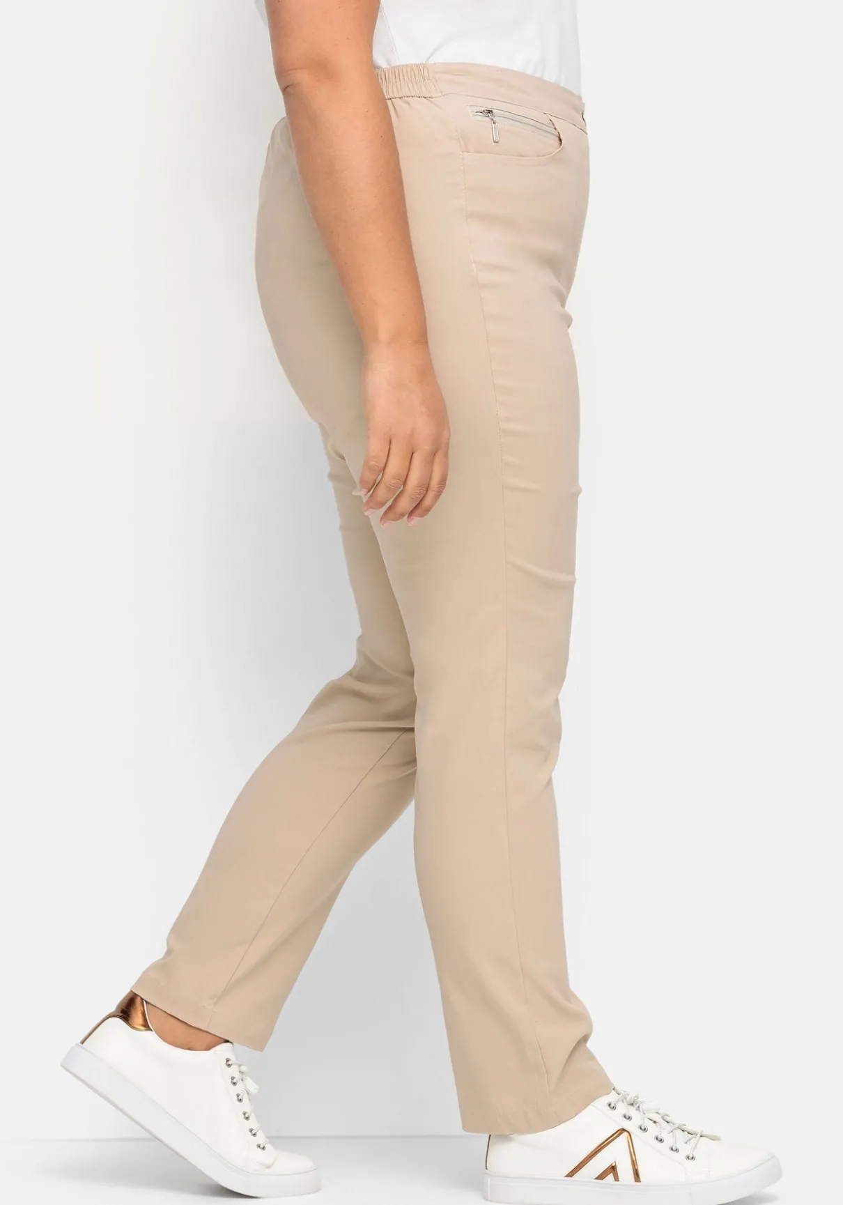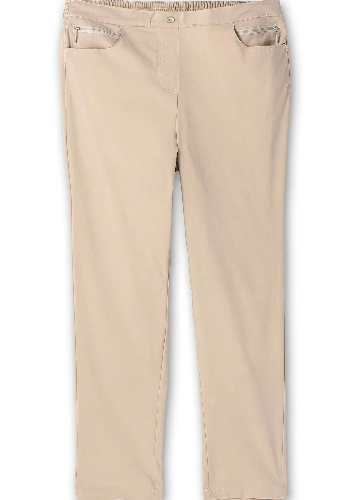 Bengalinhose in elastischer Qualität. Die Schlupfhose ist hinten am Bund mit elastischen Einsätzen gearbeitet und lässt sich dadurch bequem an- und ausziehen. Der Zierknopf und die imitierte Reißverschlussblende verleihen ihr eine gepflegte Optik. Vorn besitzt sie zwei abgerundete Eingrifftaschen, schmückende Zierreißverschlüsse dienen als modische Details.