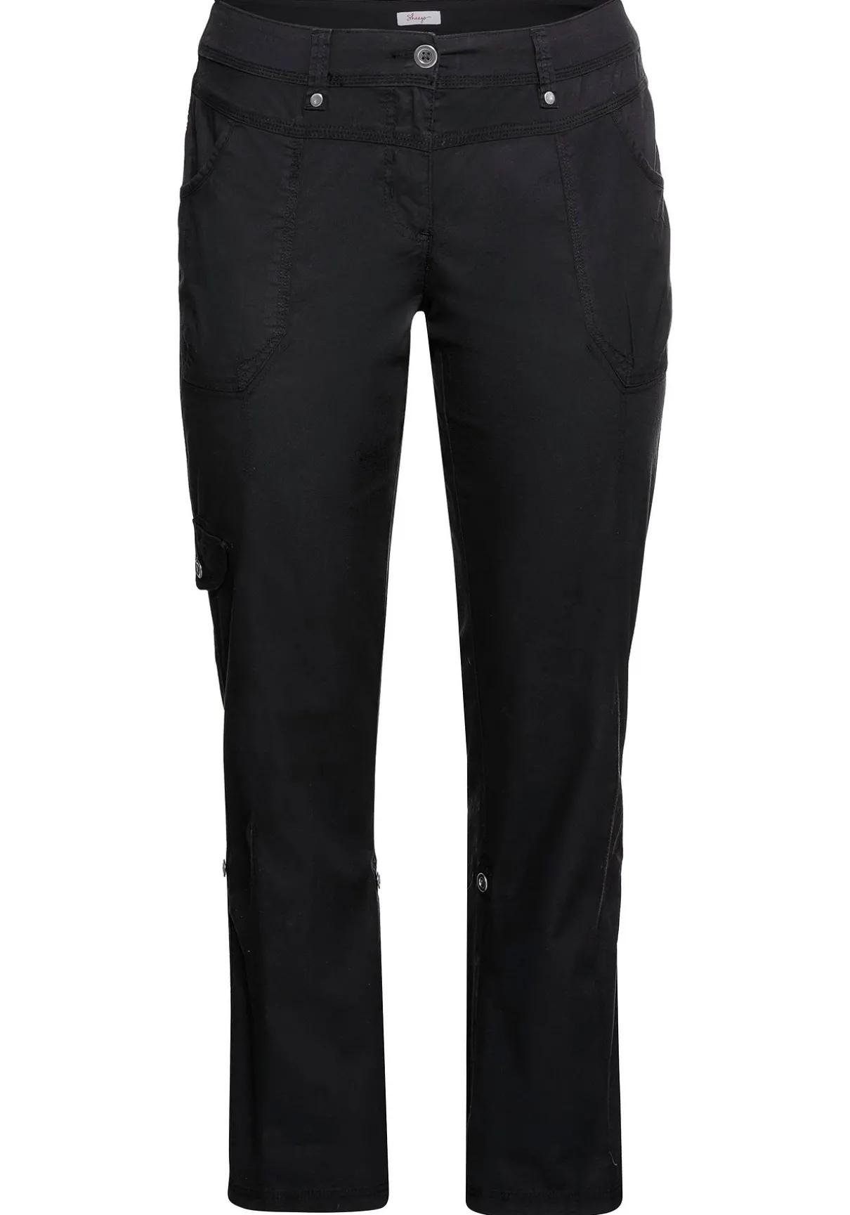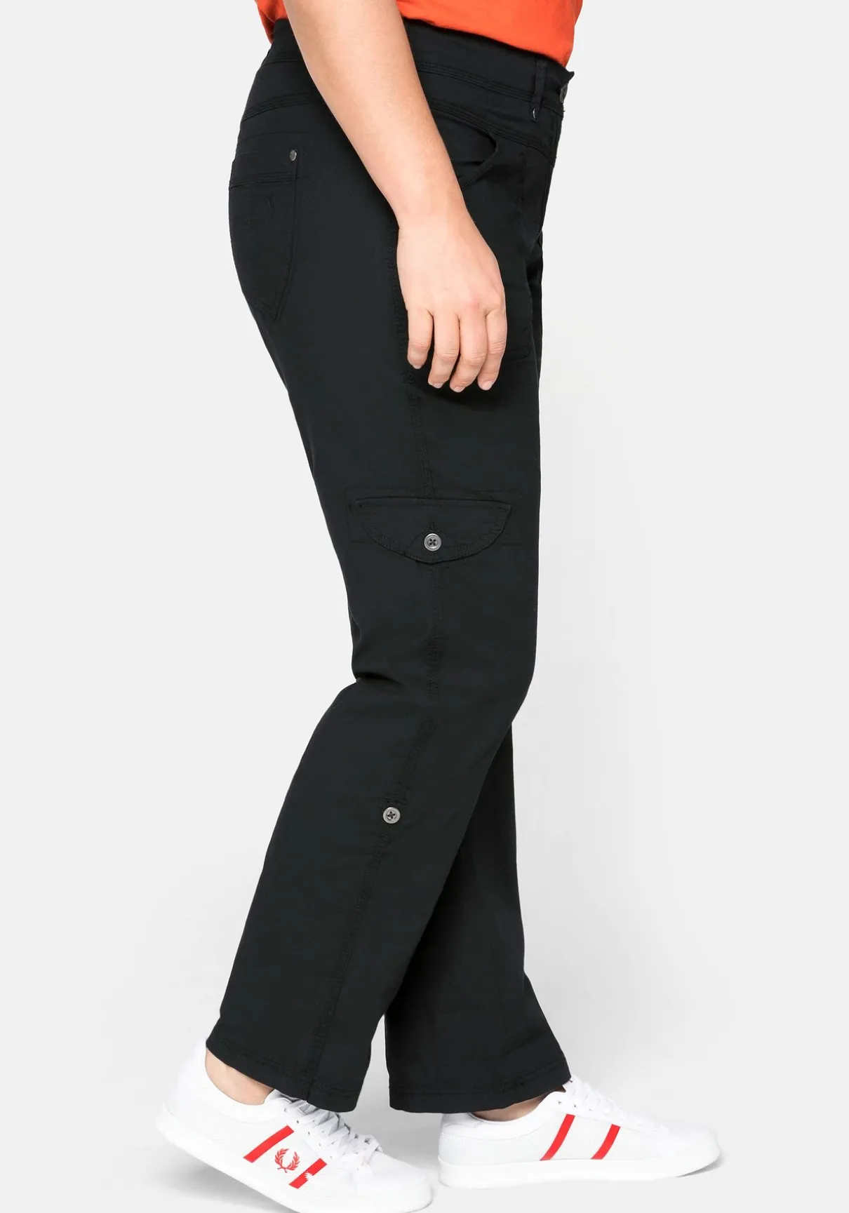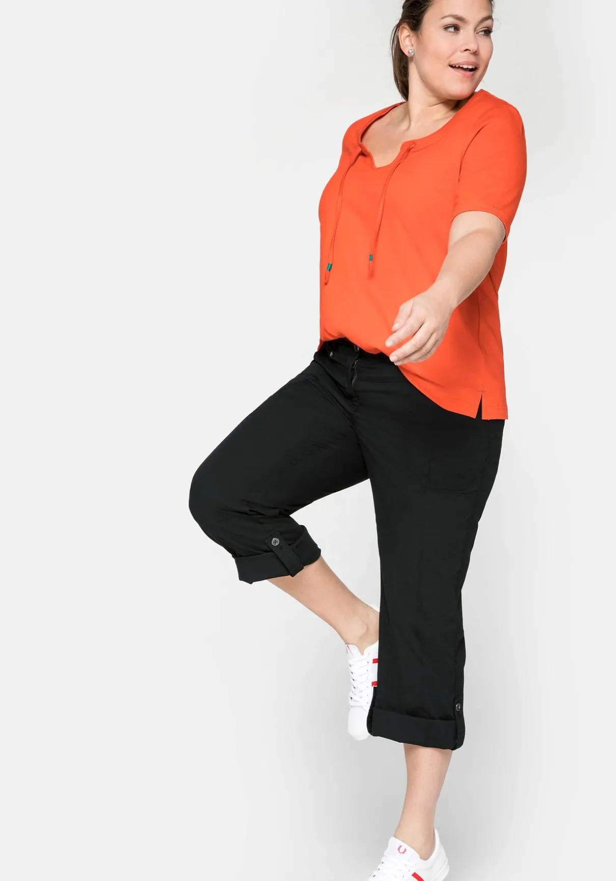 Diese sportive Hose zeigt sich mit charakteristischen Ziercargotaschen an der Seite. Zwei Eingrifftaschen vorn und hinten ergänzen den legeren Look. Besonders praktisch: Die Beine können entweder lang getragen oder hochgekrempelt und mit Riegel und Knopf fixiert werden.