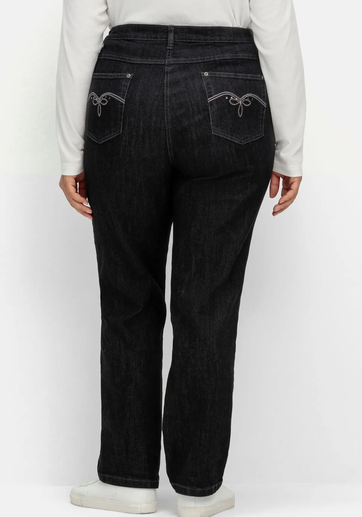 Jeans in gerader Beinform von sheego x Collection L. Der feste, angesetzte Bund ist mit Gürtelschlaufen, Knopf und Reißverschluss gearbeitet. Die Hose besitzt eine klassische Five-Pocket-Form, beide Gesäßtaschen sind mit dekorativen Stickereien verziert. Eine leichte Waschung macht den Look komplett.