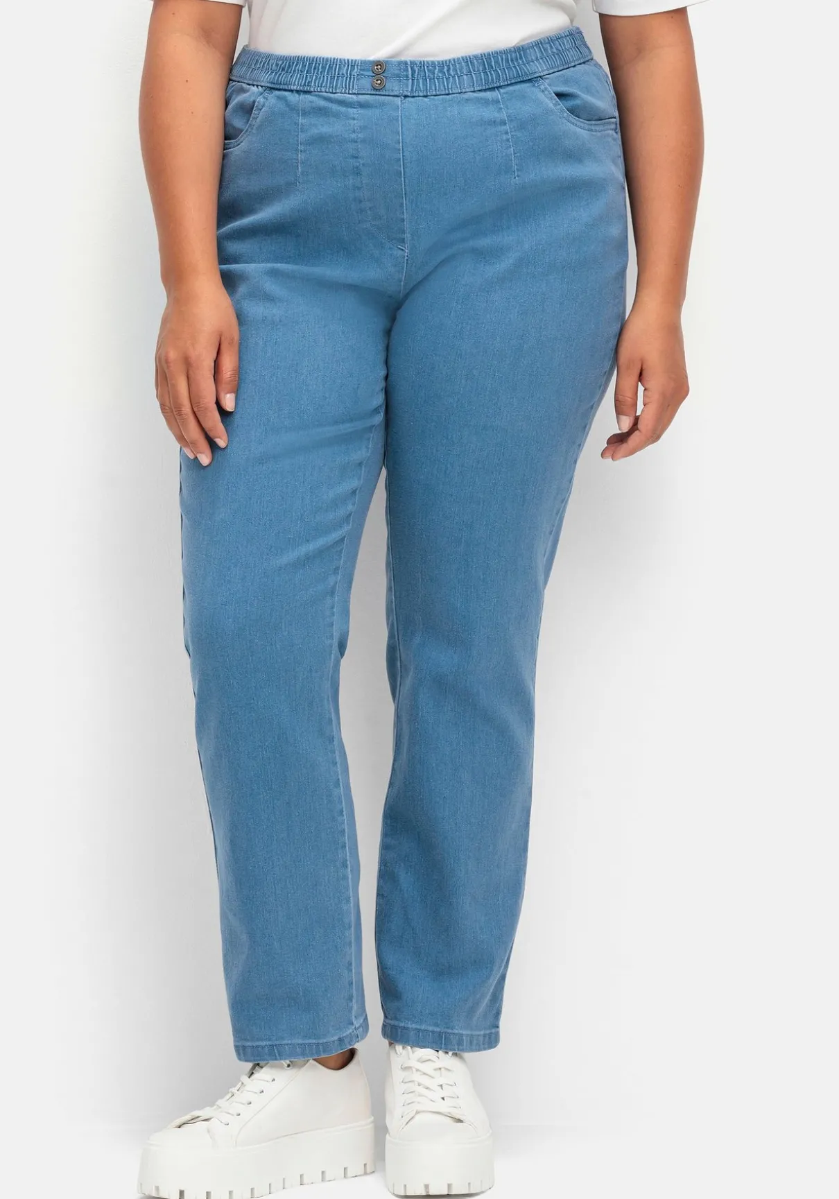 Jeans in bequemer Schlupfform. Herrlich entspannt trägt sich der gesmokte Rundum-Dehnbund, der vorn mit zwei Zierknöpfen besetzt ist. Die imitierte Reißverschlussblende sowie die schmeichelnden Abnäher runden den Look gepflegt ab. Für Modernität sorgen die leichte Waschung und die Used-Nähte.