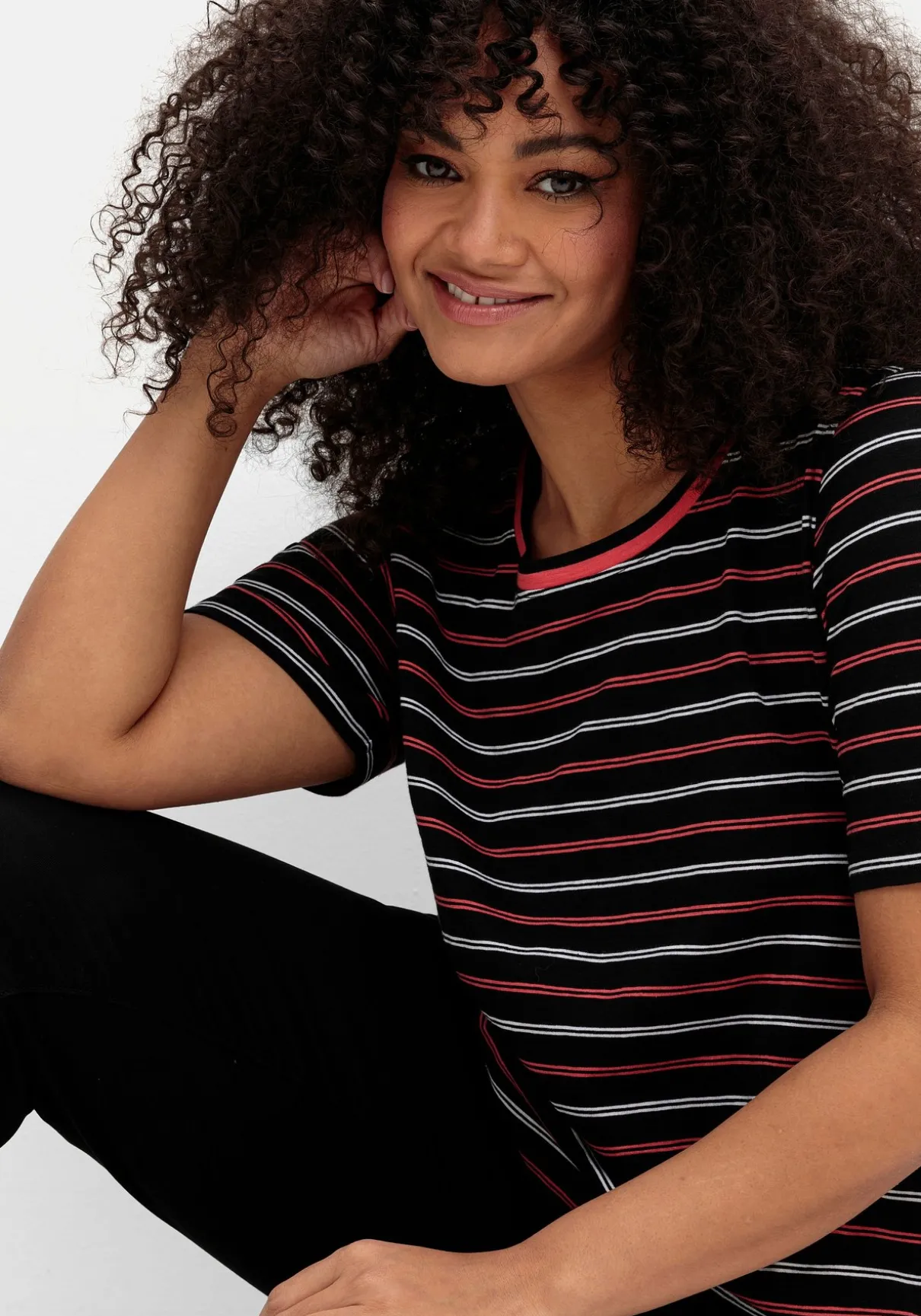 Gestreiftes Shirt mit kontrastierendem Rundhalsausschnitt. Die feinen Streifen wirken frisch und bringen maritimen Charme in den Look. Dazu schmeichelt der modisch verlängerte Kurzarm den Oberarmen, ein Gummizugbund am Saum sorgt für einen lässig-sportiven Look.