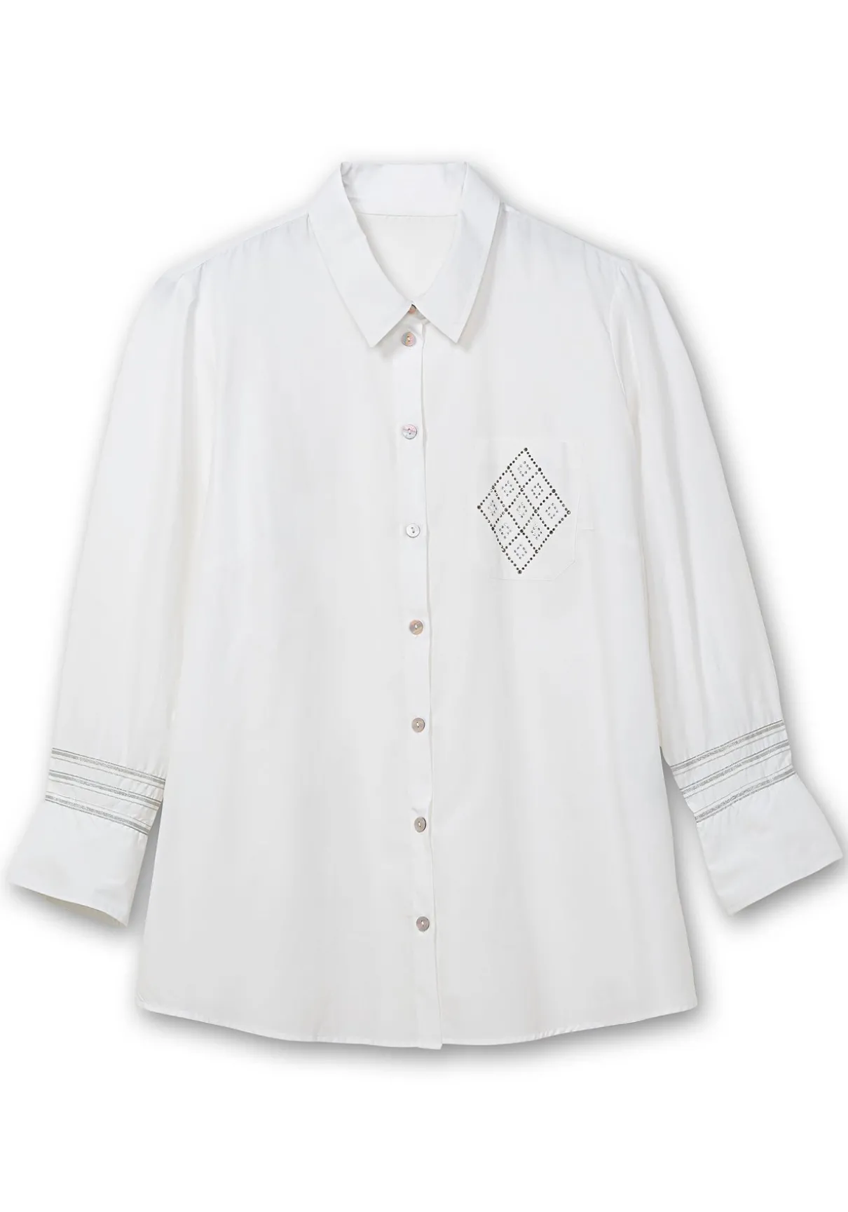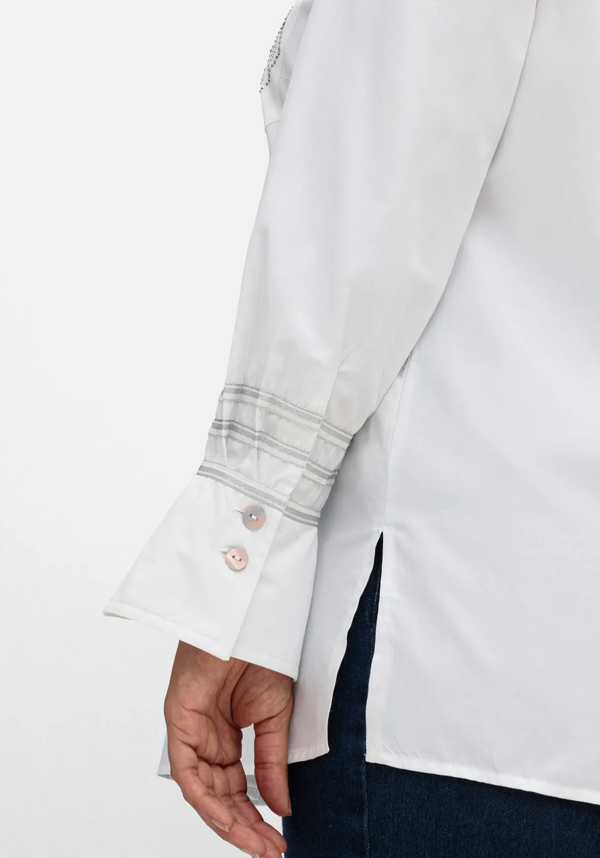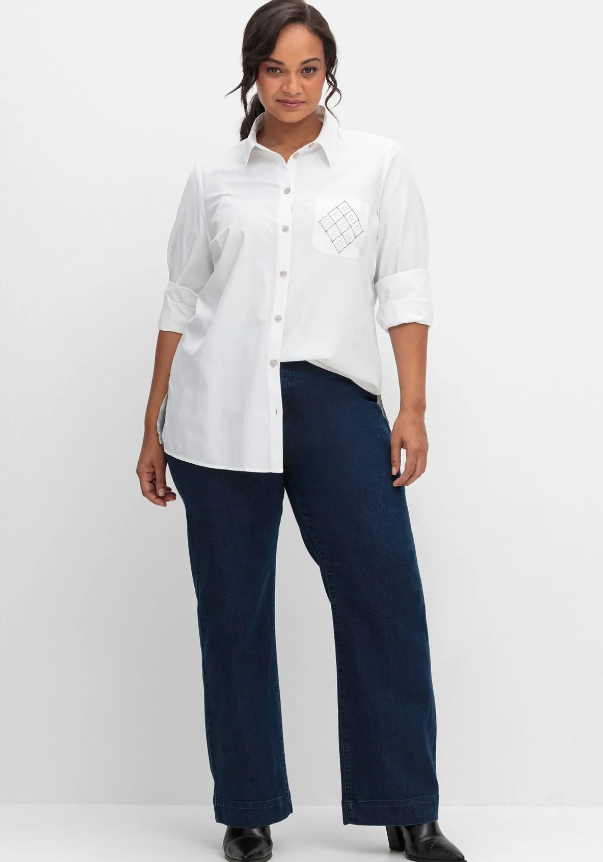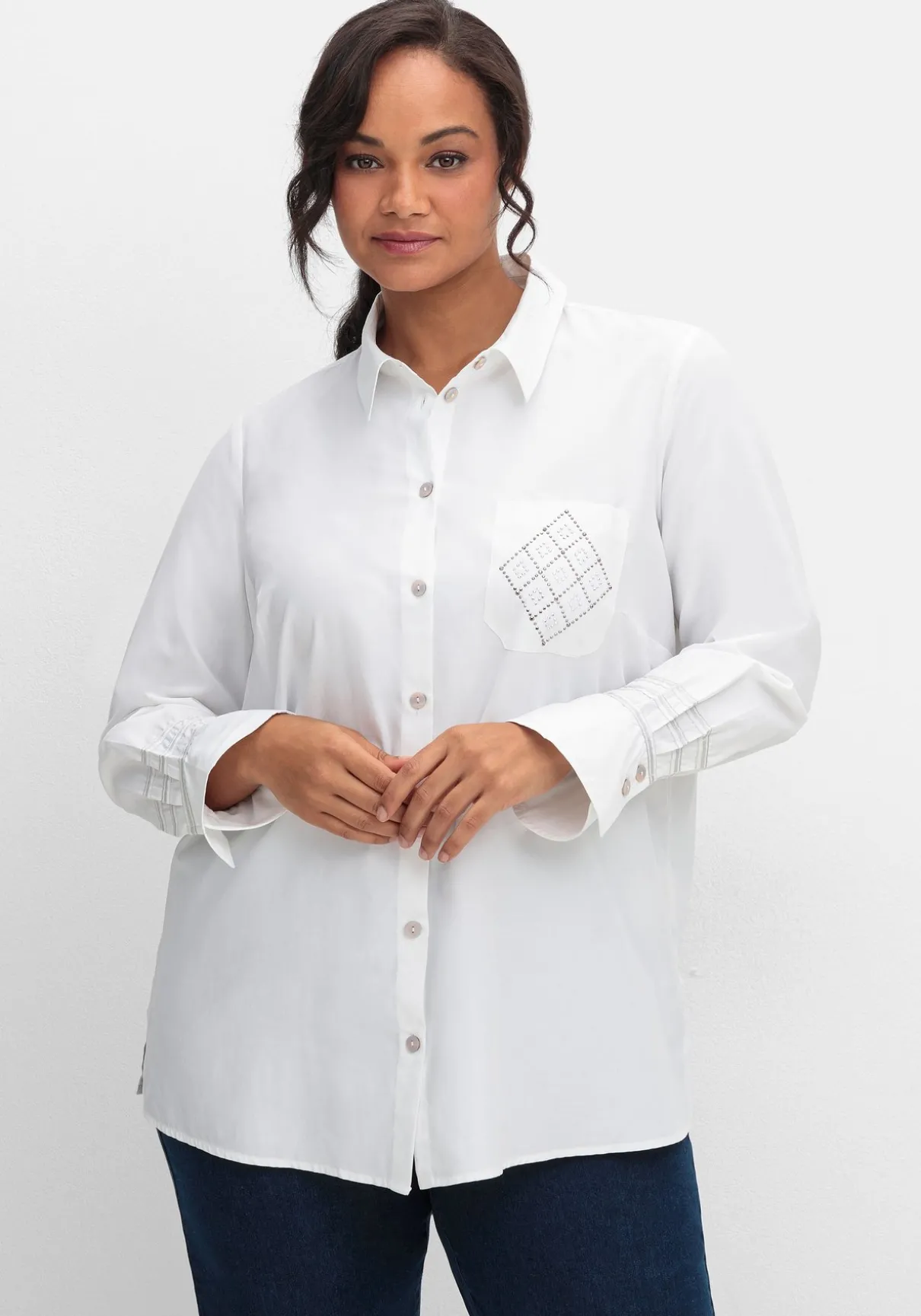 Hemdbluse mit Glitzerdetails. Glitzerrauten auf der Brusttasche und Glitzerstreifen oberhalb der Ärmel machen die Bluse partytauglich. Ein klassischer Blusenkragen, matt schimmernde Knöpfe in Perlmutt-Optik und ausgestellte Ärmelmanschetten runden den Look feminin ab.