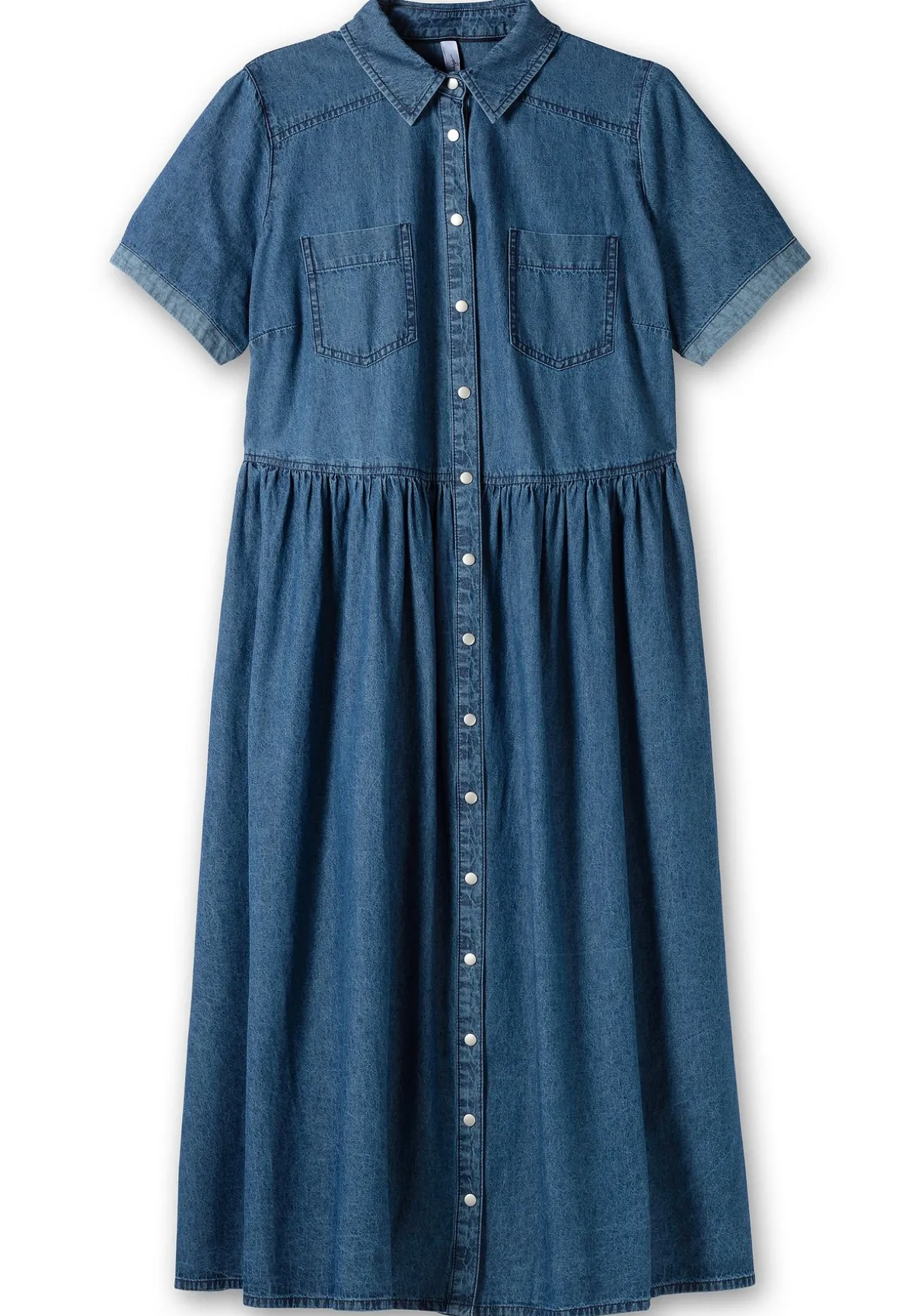 Jeanskleid in Midilänge. Der Hemdblusenkragen, die durchgehende Knopfleiste und die beiden aufgesetzten Brusttaschen sorgen hier für den charakteristischen Stil. Eine angekräuselte Teilungsnaht rückt die Taille in den Fokus und gibt dem sich anschließenden Rock entspannte Weite. Durch die vorversetzte Schulternaht sowie die Passe hinten sitzt das Kleid optimal, seitliche Schlitze am Saum ergänzen den Look.