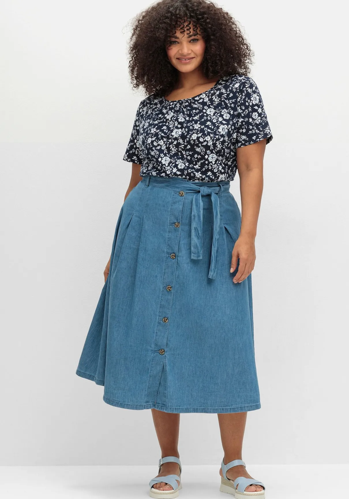 Jeansrock in A-Linie. Der Bund ist mit Bindeband und Gürtelschlaufen gearbeitet, für Bequemlichkeit sorgt der hinten eingearbeitete Gummizug. Bundfalten geben dem Rock Weite, auch der ausgestellte Schnitt lässt den Rock feminin schwingen. Die durchgehende Knopfleiste wirkt optisch streckend und ermöglicht individuelle Beinfreiheit.