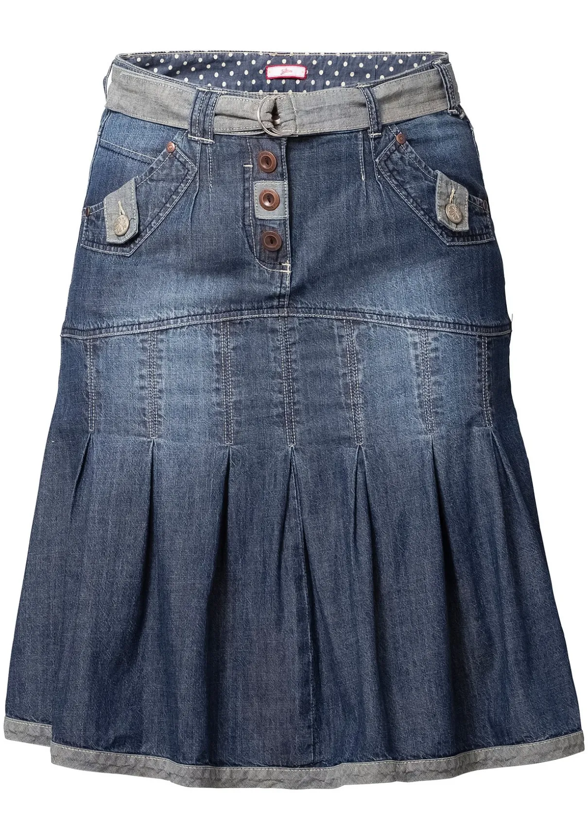 Feminin und verspielt wirkt der Jeansrock von sheego by Joe Browns. Die ausgestellte Form ist mit Falten versehen, die beim Gehen aufspringen und so für Schwung und Bewegungsfreiheit sorgen. Die Eingrifftaschen auf der Vorderseite und die aufgesetzten Gesäßtaschen sind mit einer Klappe und geprägten Knöpfen verziert Die Klappe ist wie der abnehmbare Bindegürtel und der Saumabschluss hell abgesetzt. Mit einem Reißverschluss unter der Zierknopfleiste wird der Rock geschlossen.