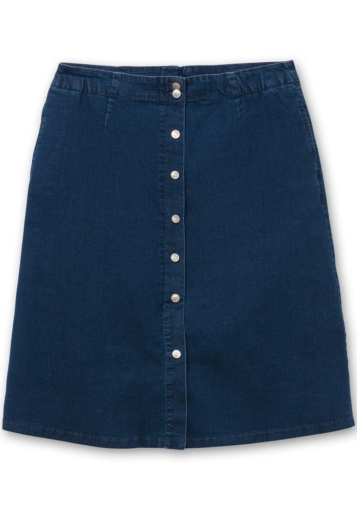 Jeansrock in Midilänge. Die Zierknopfleiste verleiht dem Rock ein modisches Upgrade und streckt gleichzeitig geschickt die Figur. Der Gehschlitz vorn gibt Bewegungsfreiheit, dazu kommen zwei Taschen und ein Reißverschluss hinten. Für den optimalen Sitz sorgen die Abnäher in der Taille und die Teilungsnaht hinten.