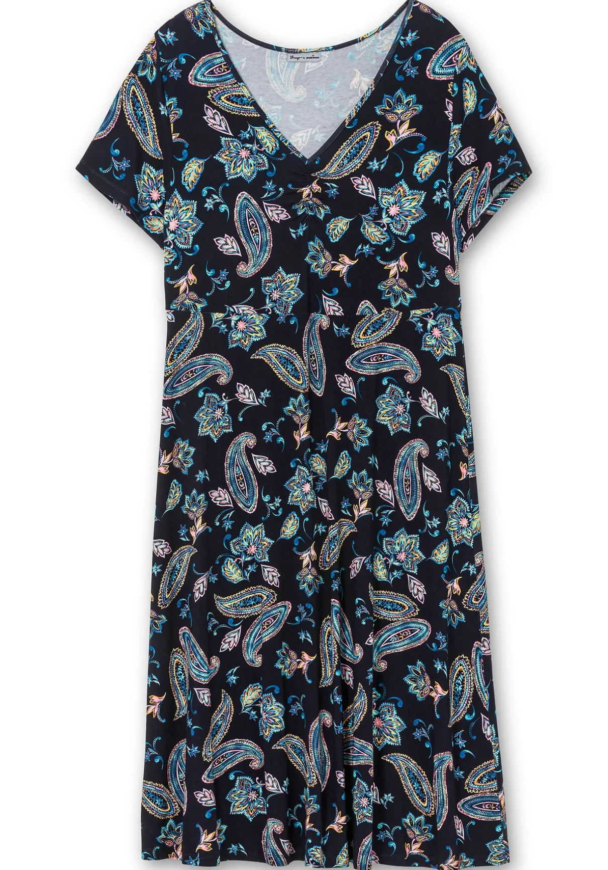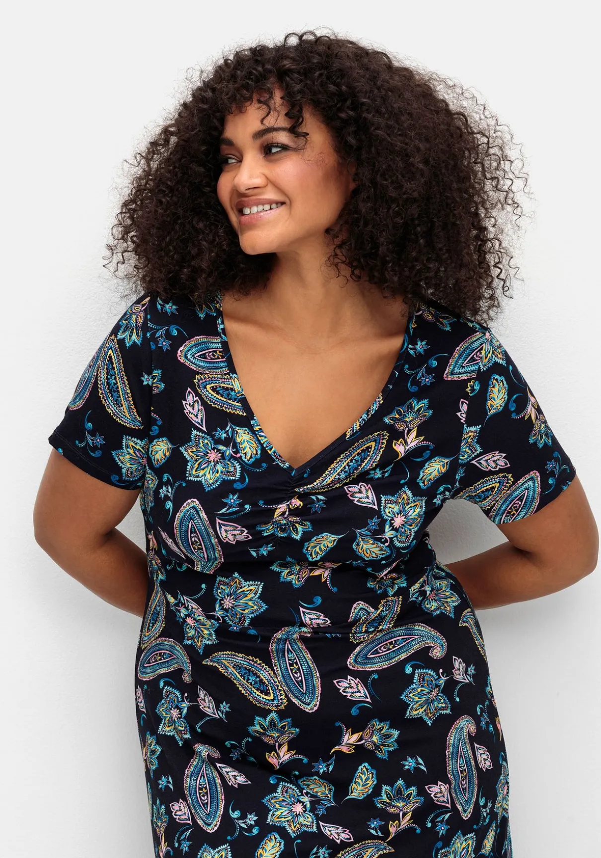 Jerseykleid von sheego by Joe Browns. Das allover mit Blumen bedruckte Kleid ist mit einem gerafften V-Ausschnitt gearbeitet. Dadurch fällt das Kleid am Oberkörper besonders schön, darunter schließt sich ein weit schwingender, ausgestellter Rock an. Die Teilungsnaht auf Hüfthöhe gibt der Silhouette zusätzlich Form.