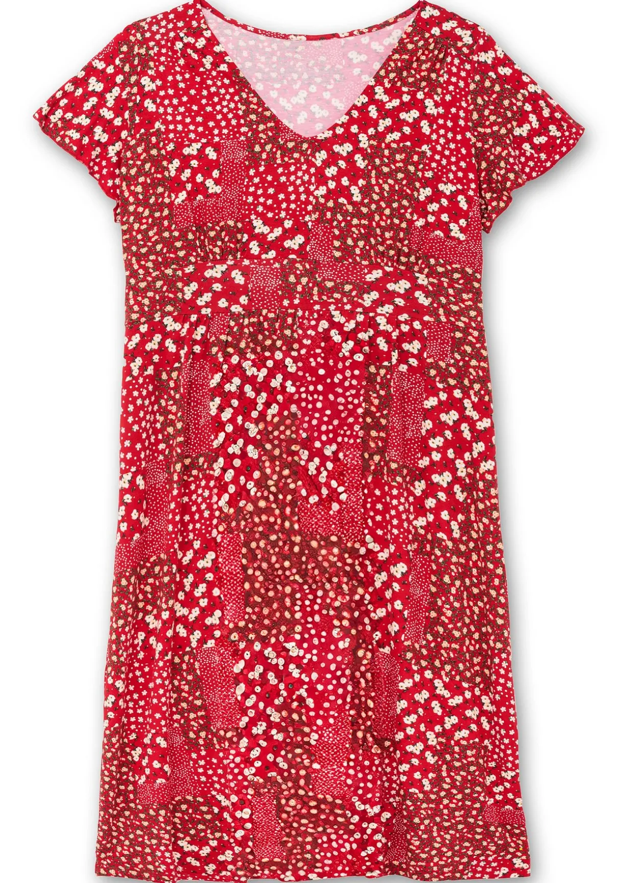 Wadenlanges Kleid aus Jersey. Der Blumenprint zeigt sich in verspielter Patch-Optik. Auch V-Ausschnitt, kurze Flügelärmel und eine leicht geraffte Schulternaht verleihen dem Kleid eine feminine Note. Durch den breiten Einsatz in der Taille sowie die gesmokten Partien im Rücken betont das Kleid schmeichelnd die Figur, das ausgestellte Rockteil fällt durch die kleinen Falten besonders schön.