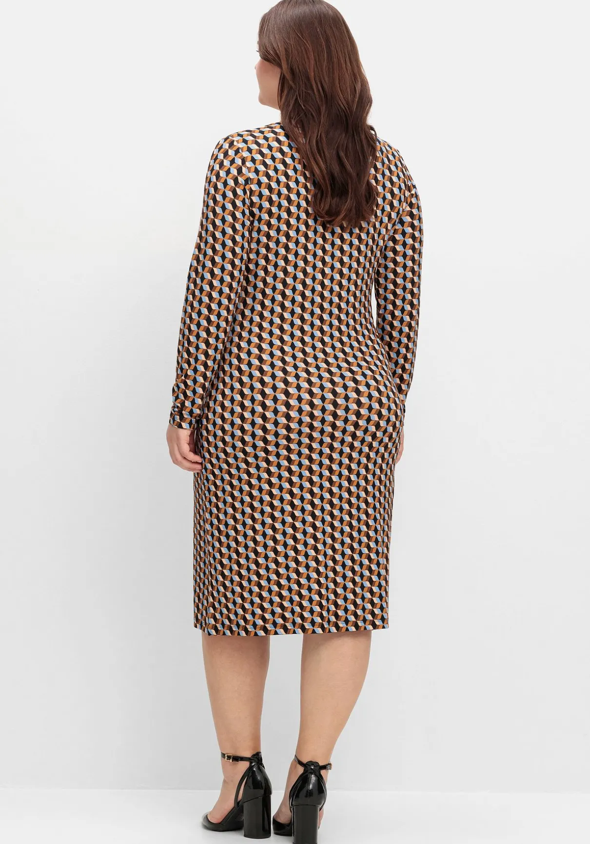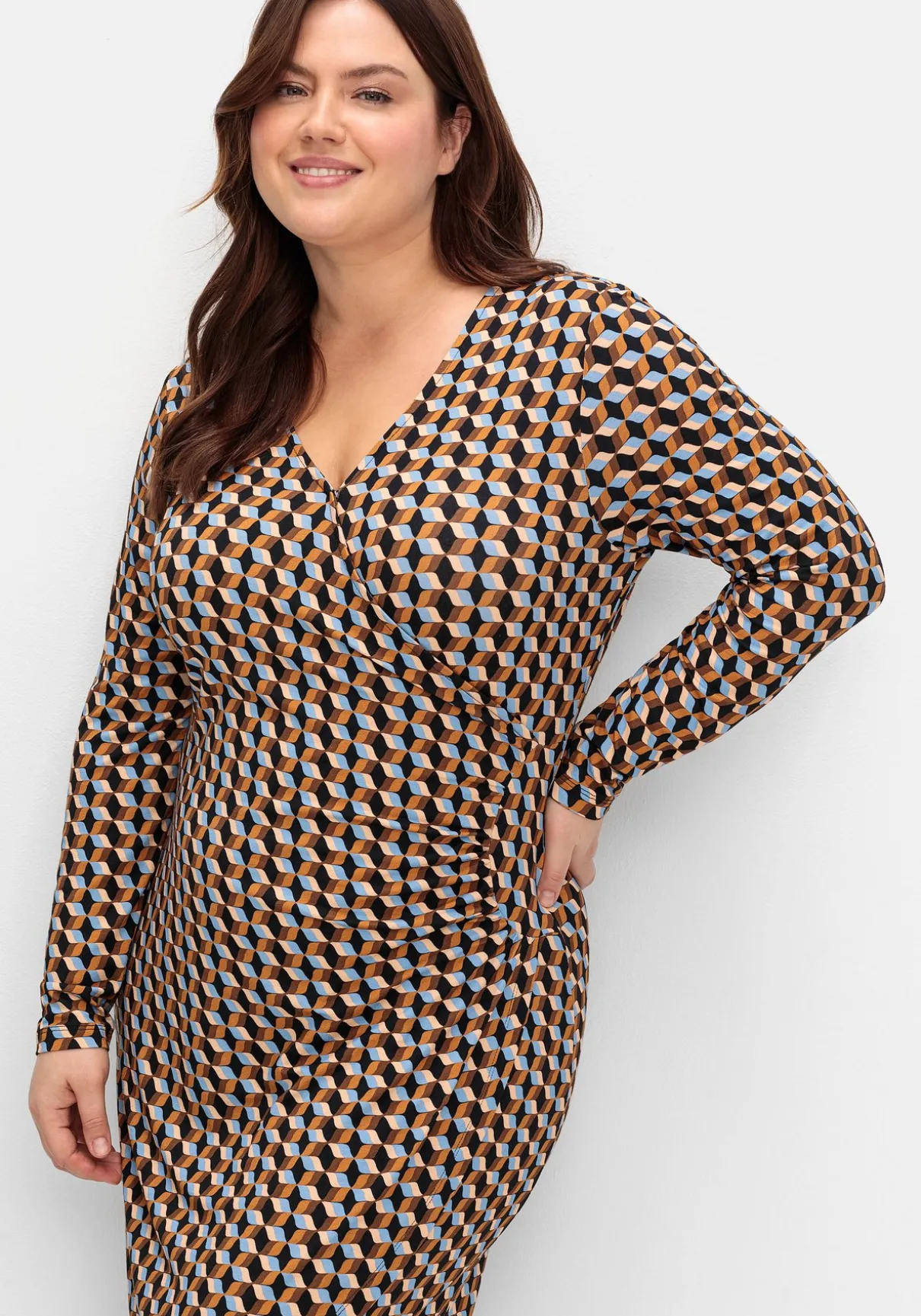 Jerseykleid in Wickeloptik von sheego by Joe Browns. Seine Modernität erhält das Kleid durch den grafischen Druck, der eine spannende 3D-Anmutung entstehen lässt. Der Wickelschnitt betont schmeichelnd die feminine Silhouette: Dabei streckt der tiefe V-Ausschnitt den Oberkörper, die seitliche Raffung formt geschickt die Taille. Ein Druckknopf hält den Ausschnitt zusammen, der Saum fällt vorn asymmetrisch und endet in kniebedeckender Länge.