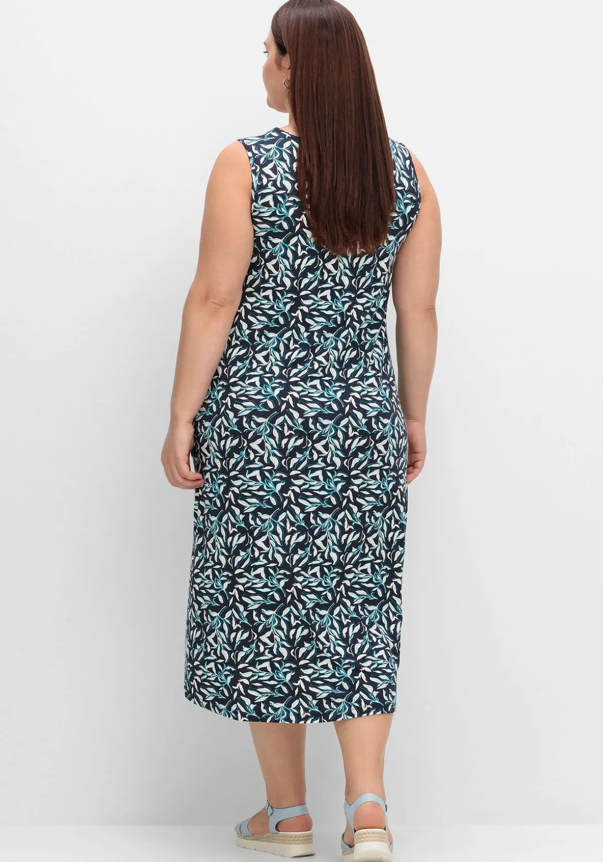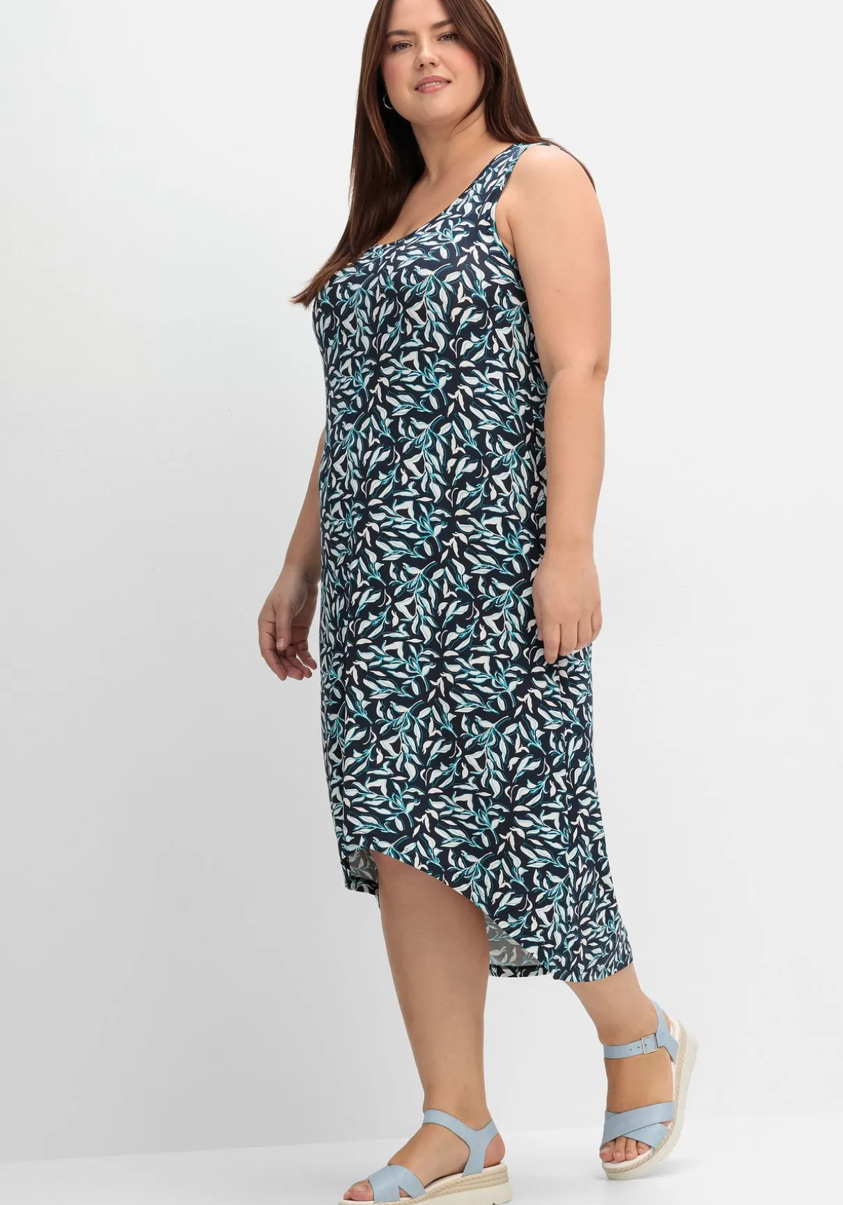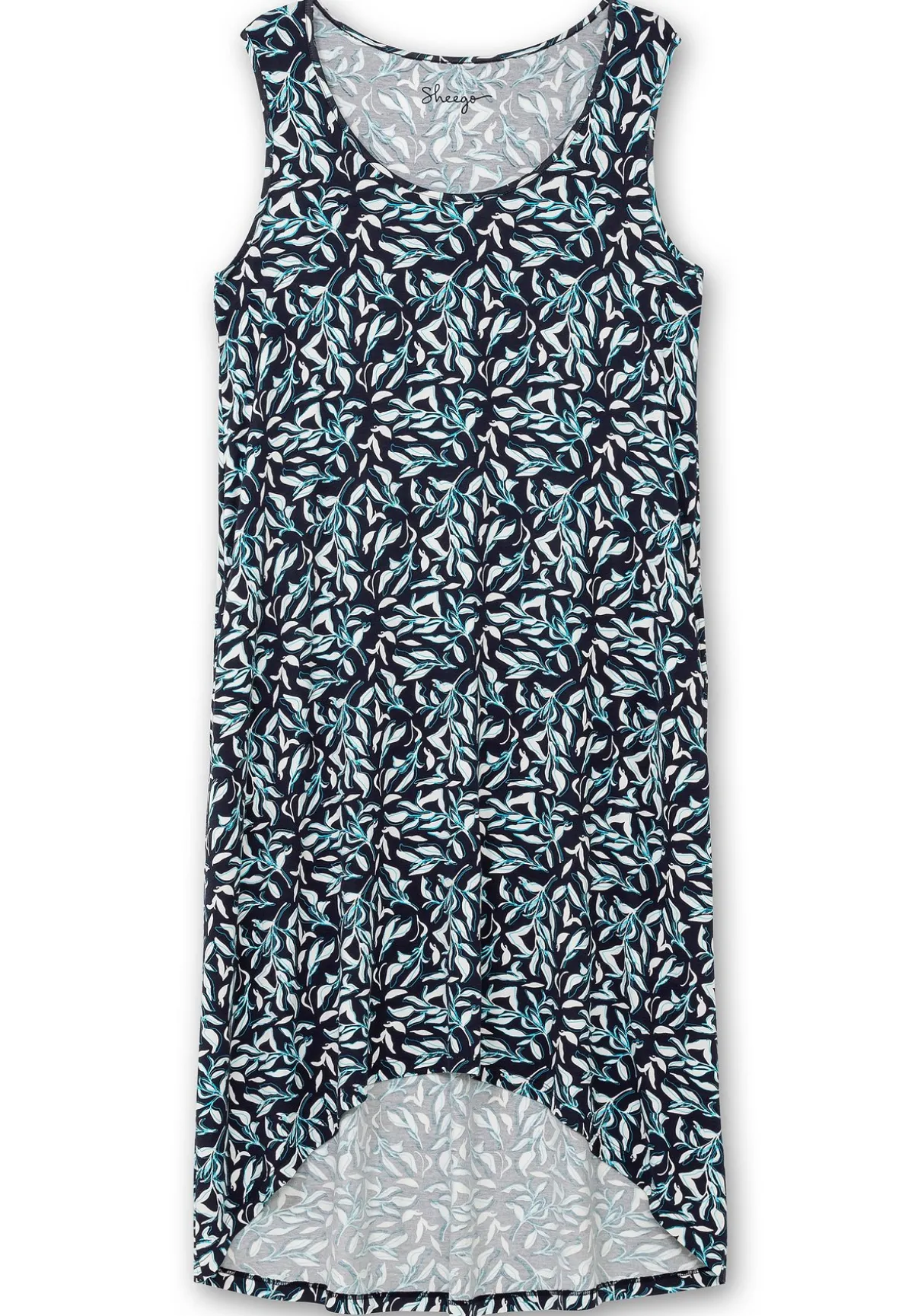 Jerseykleid mit Blätter-Alloverprint. In ärmelloser Form und mit locker fallendem, hinten verlängertem Schnitt wird das Kleid zum entspannten Sommerbegleiter. Es präsentiert sich mit einem Rundhalsausschnitt, sehr praktisch sind die seitlichen Taschen. Dieser Style eignet sich auch gut für Urlaub oder Strand.