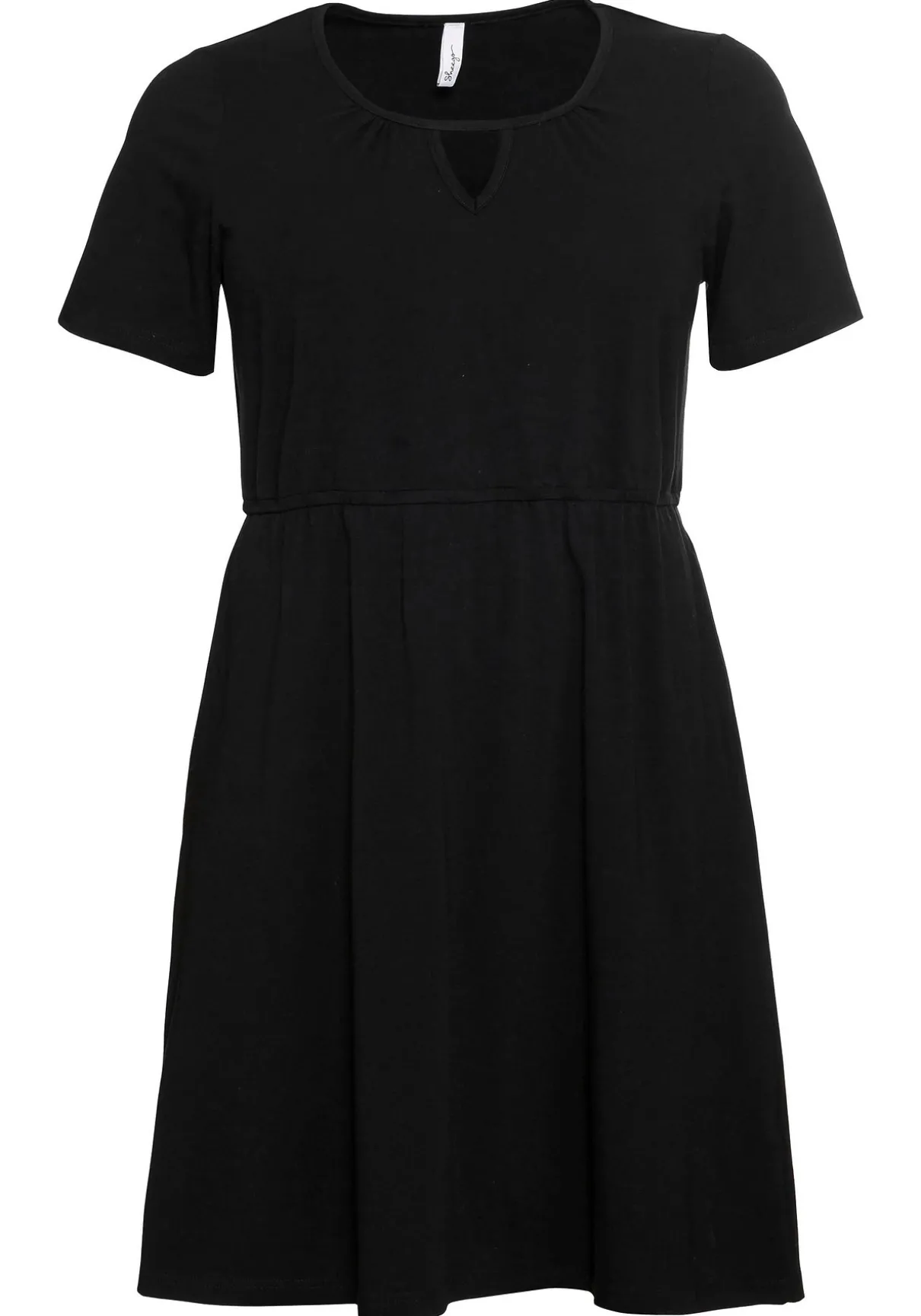 Jerseykleid in kniefreier Länge. Highlight ist der Rundhalsausschnitt, der mit Raffungen und Cut-outs besonders aufwendig gearbeitet ist. Der Gummizug in der Taille bricht den ansonsten sehr clean gehaltenen Look. Praktisches Finish: Die seitlichen Taschen.