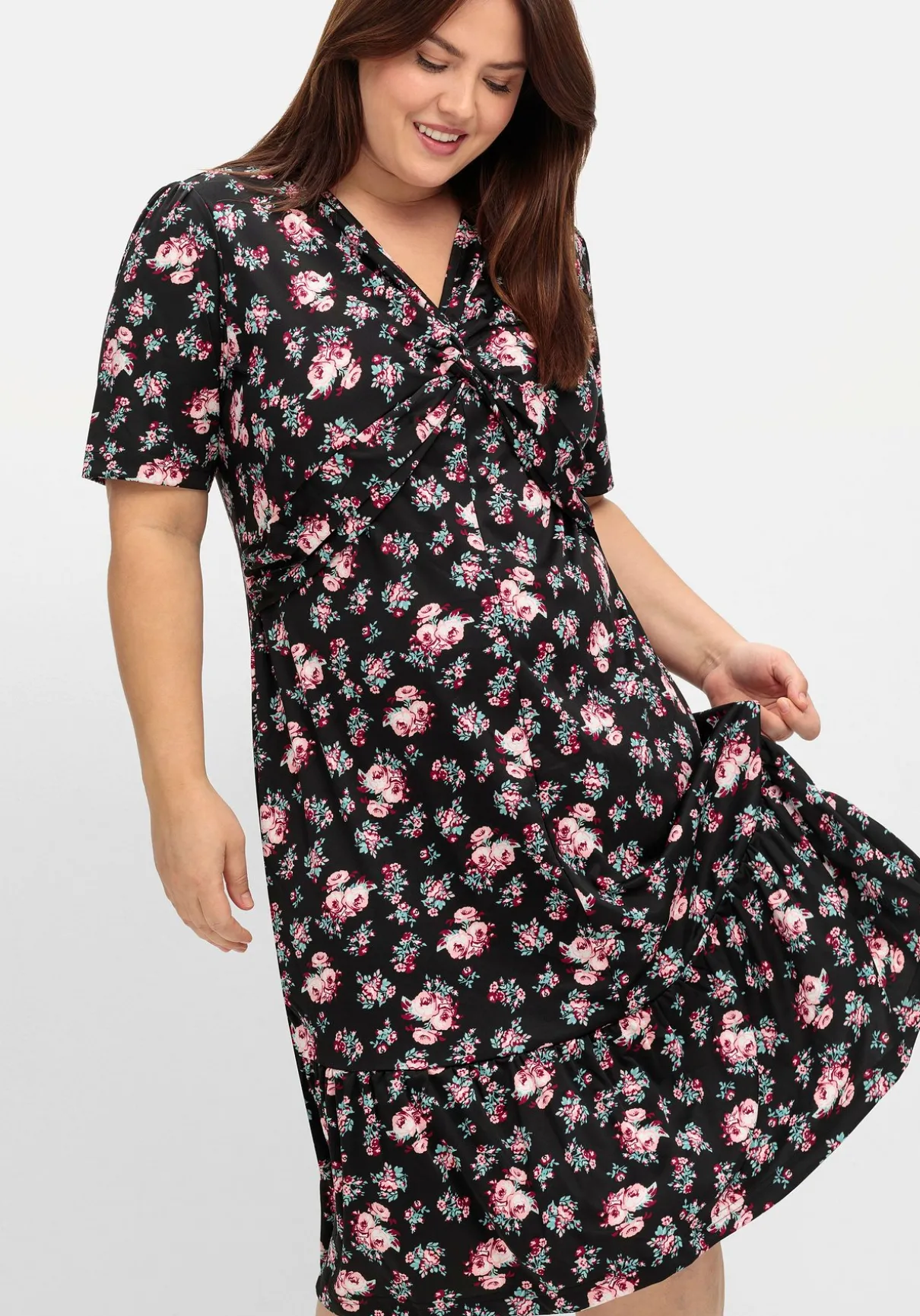 Jerseykleid mit Alloverprint. Der dekorativ geknotete V-Ausschnitt formt ein schönes Dekolleté und streckt den Oberkörper optisch. Ein Volant am Saum lässt das Kleid schön schwingen. Raffungen an den Schultern und 3/4-lange Ärmel ergänzen den femininen Fit.