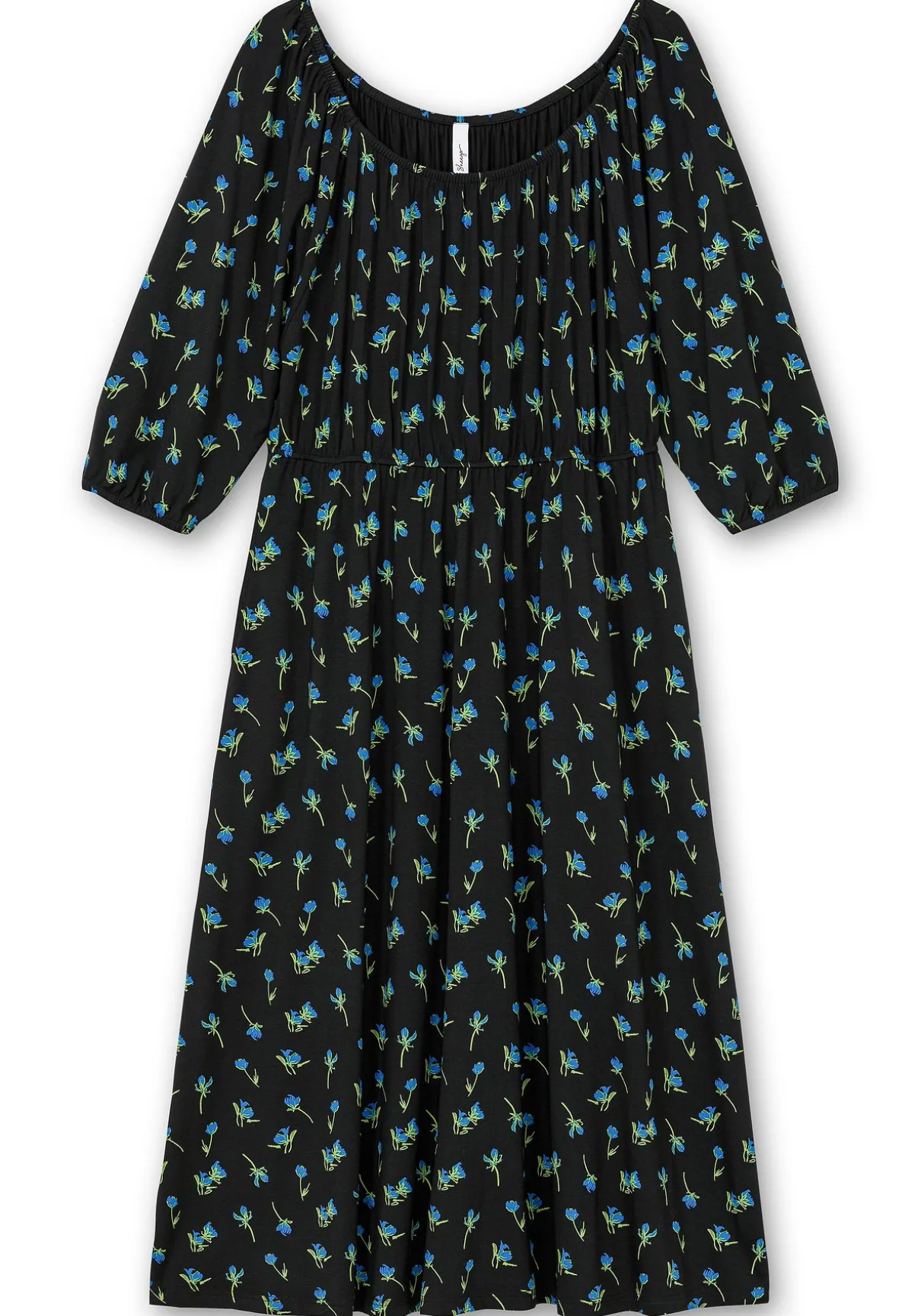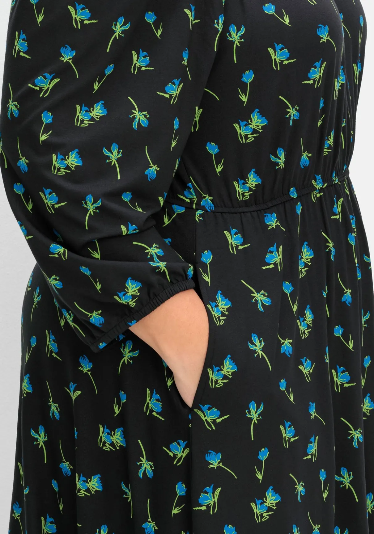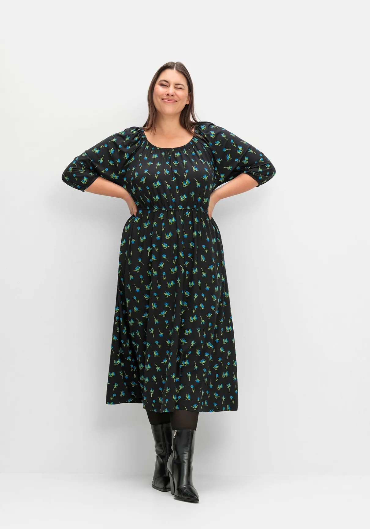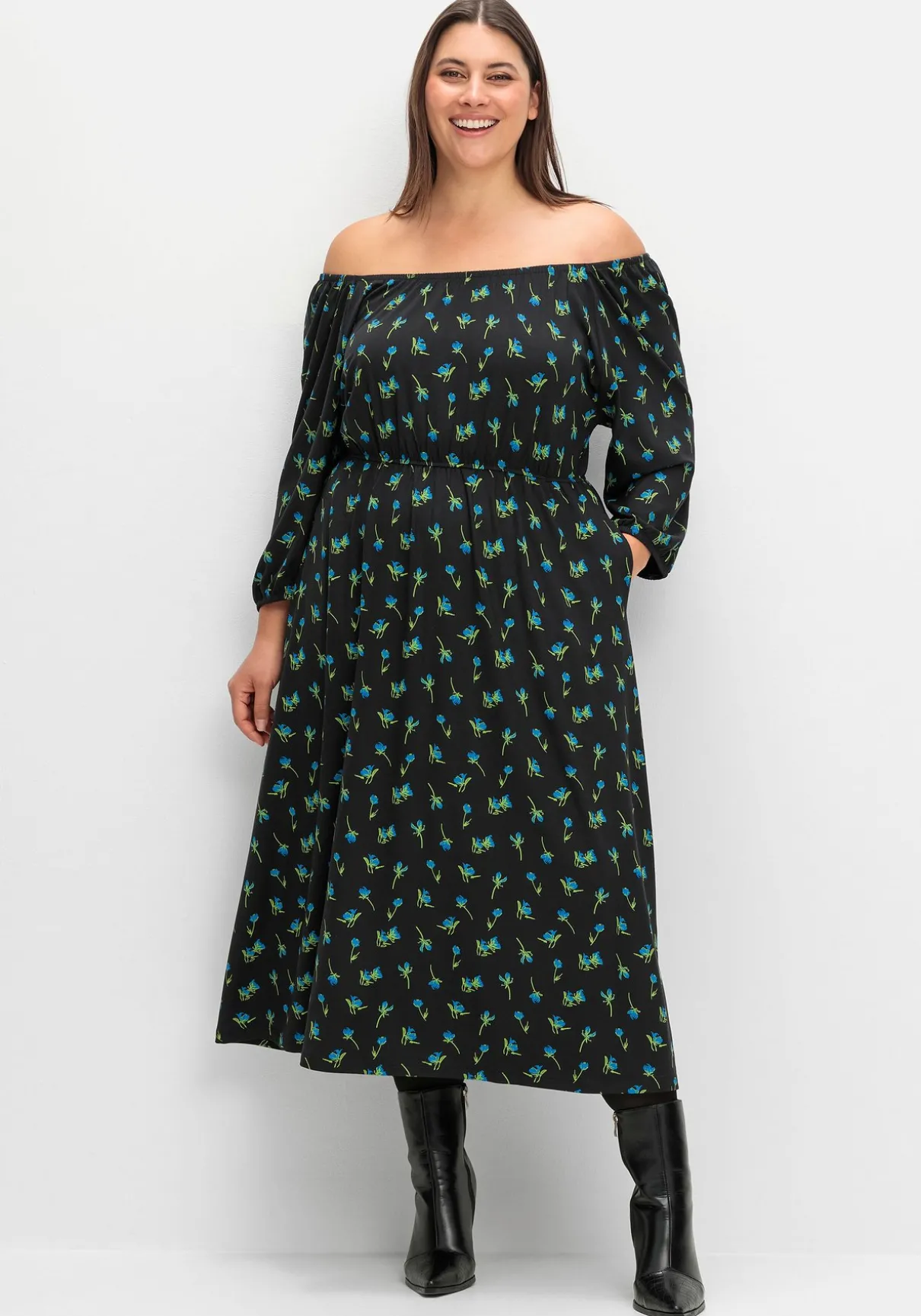 Kleid in wadenbedeckender Länge. Der florale Alloverprint auf dunklem Fond wirkt modern und feminin zugleich. Für Raffinesse sorgt der elastische Ausschnitt, der entweder als etwas weiterer Rundhals oder in schulterfreier Carmen-Form getragen werden kann. Der Gummizug in der Taille sitzt bequem und formt geschickt die Figur, der sich anschließende ausgestellte Rock fällt locker über Hüfte und Beine. 3/4-lange Ärmel und seitliche Eingrifftaschen ergänzen den komfortablen Look.