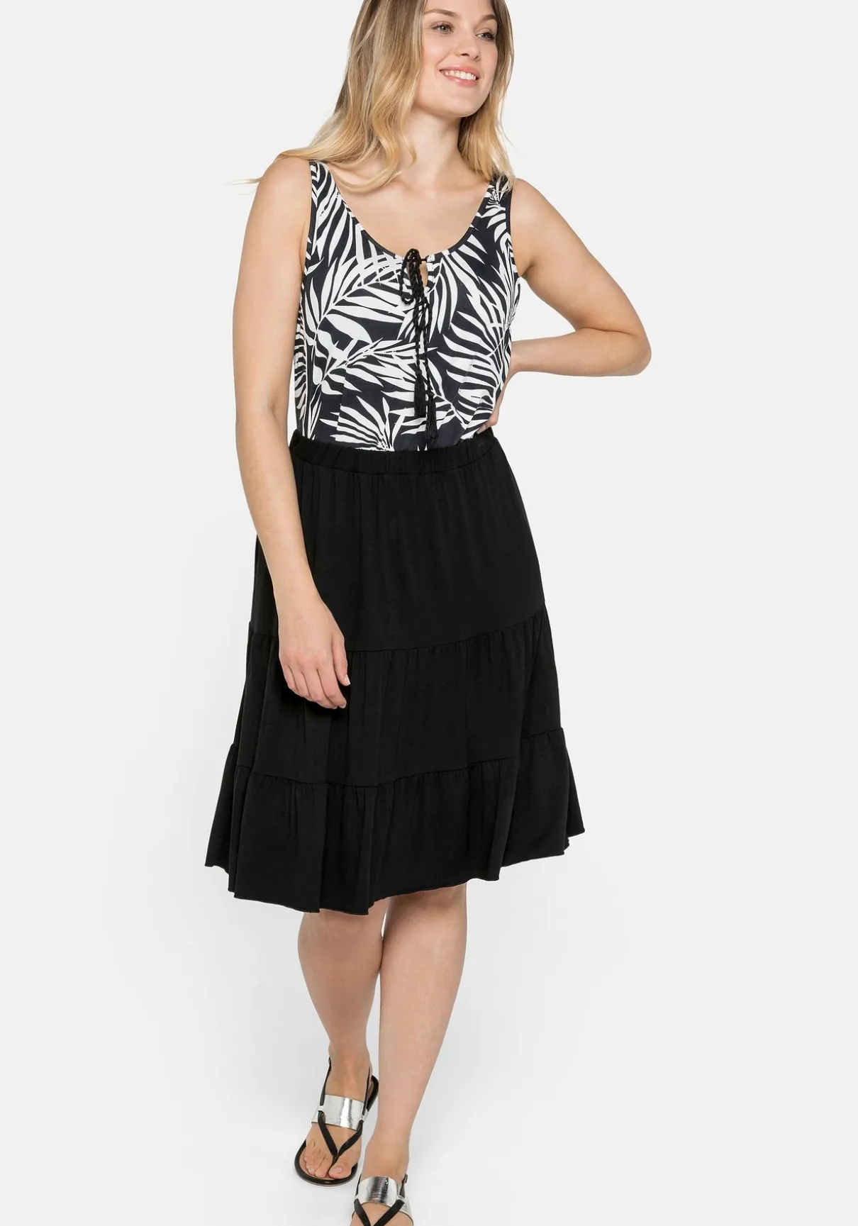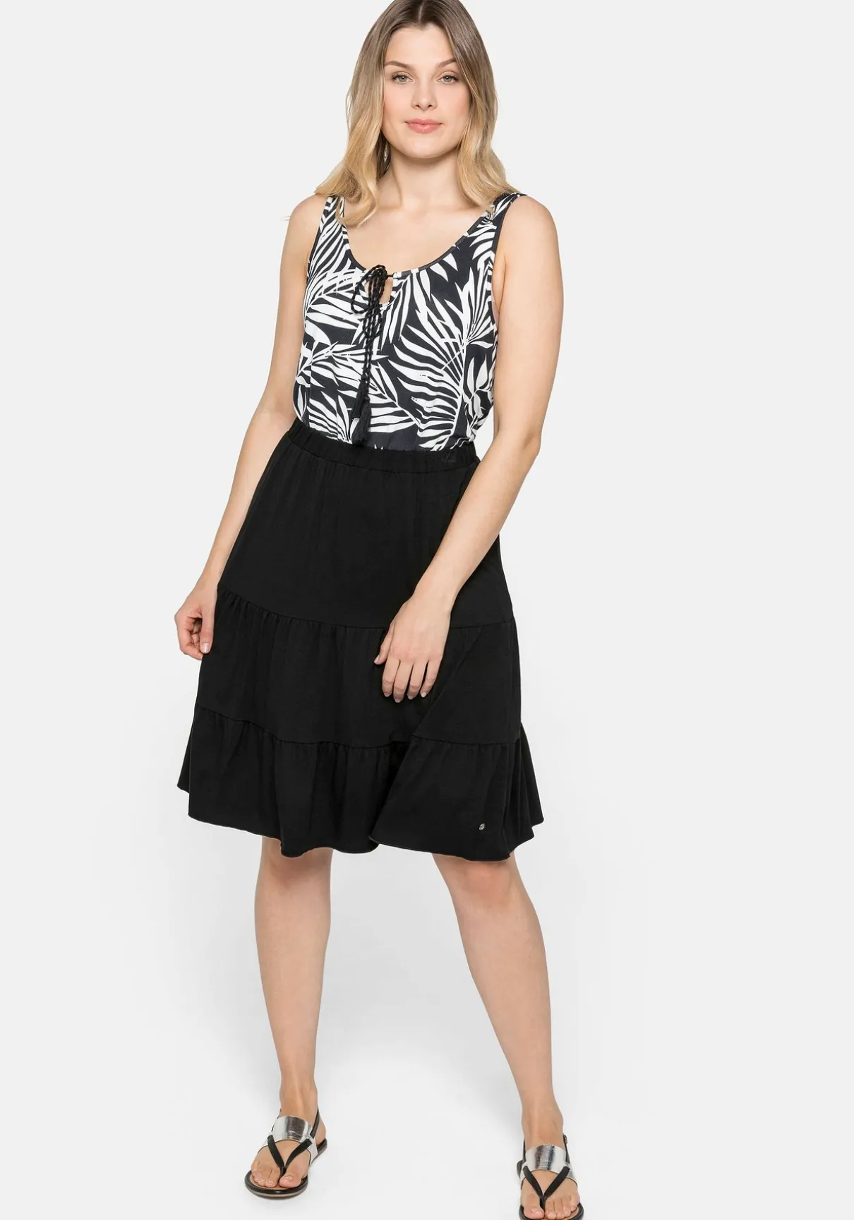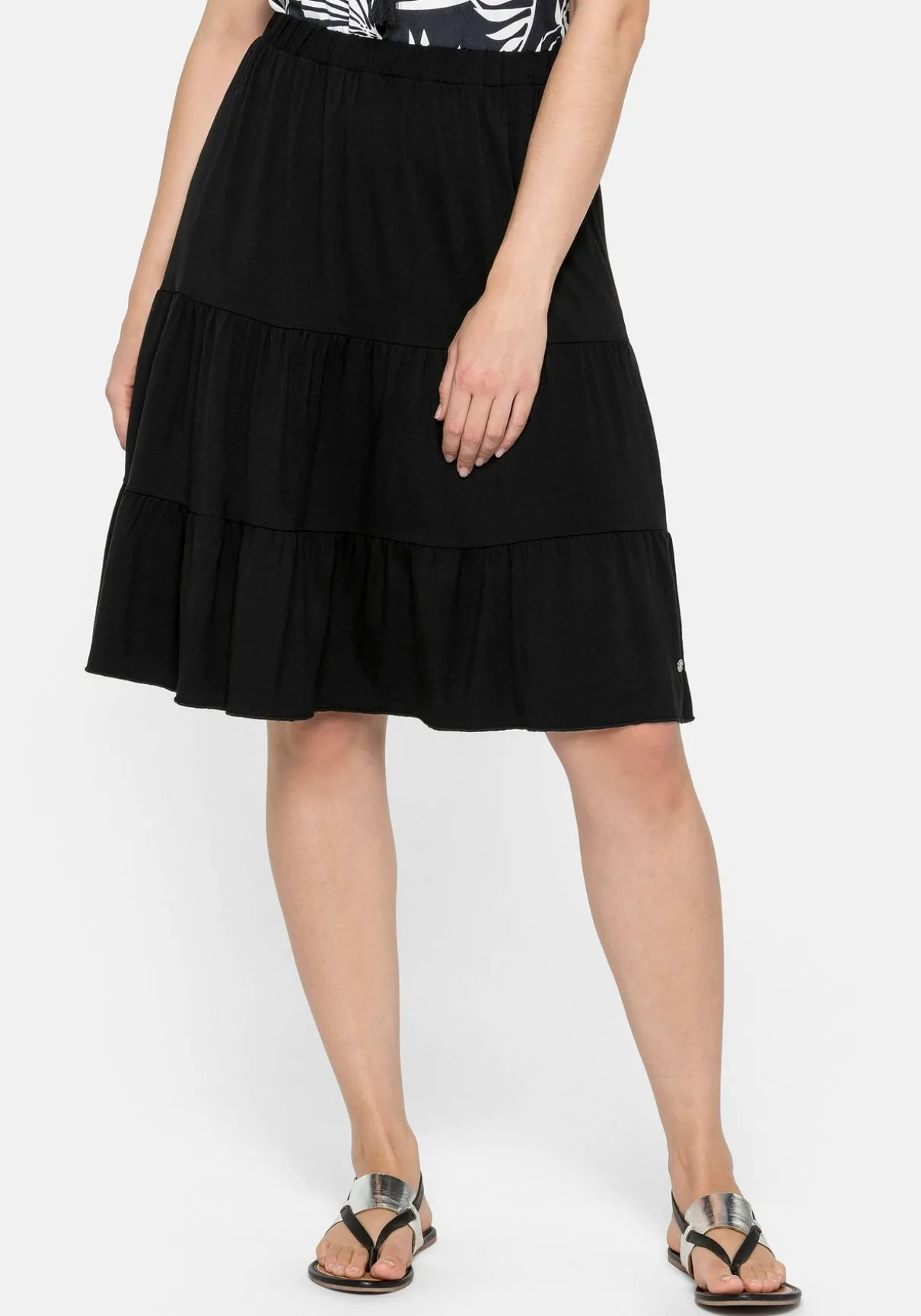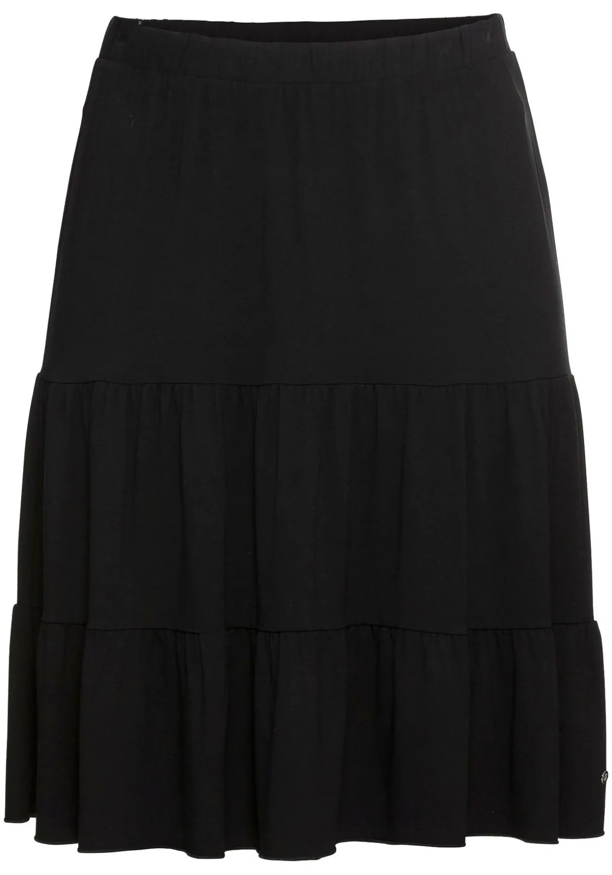 Strandrock mit zweistufigen Volants. Für optimale Bequemlichkeit sorgt der elastische Schlupfbund. Der nach unten hin leicht ausgestellte Schnitt lässt den Rock dazu noch schön schwingen. Ideal für heiße Sommertage!