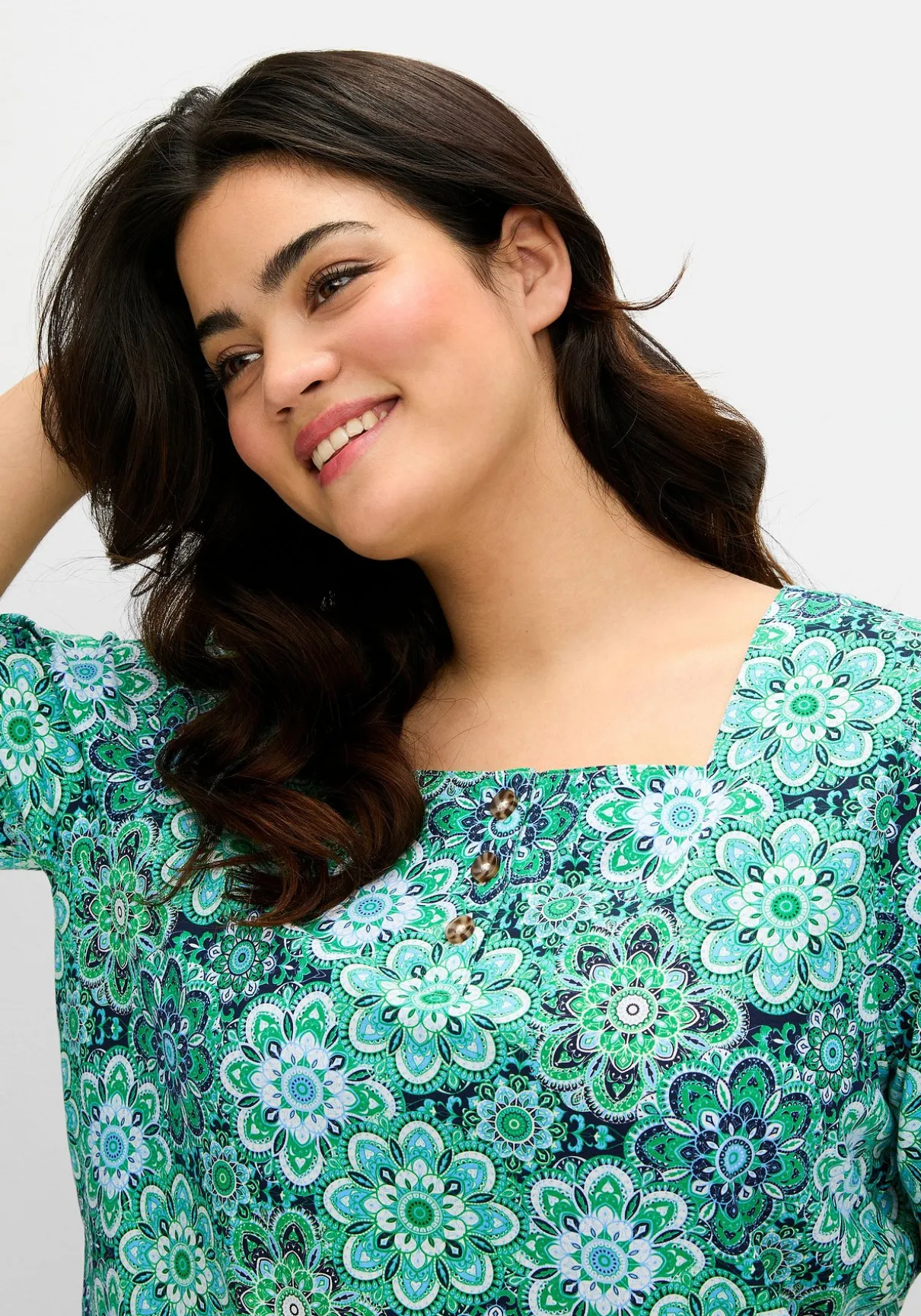 Shirt mit kurzem Arm. Der Mandala-Blütendruck verleiht dem Shirt eine feminine, verspielte Note. Der formschöne Karreeausschnitt mit imitierter Knopfleiste und Knöpfen in Holzoptik ist dazu eine modische Ergänzung. Die leichte A-Linie ist für mehr Tragekomfort mit Seitenschlitzen am Saum gearbeitet.