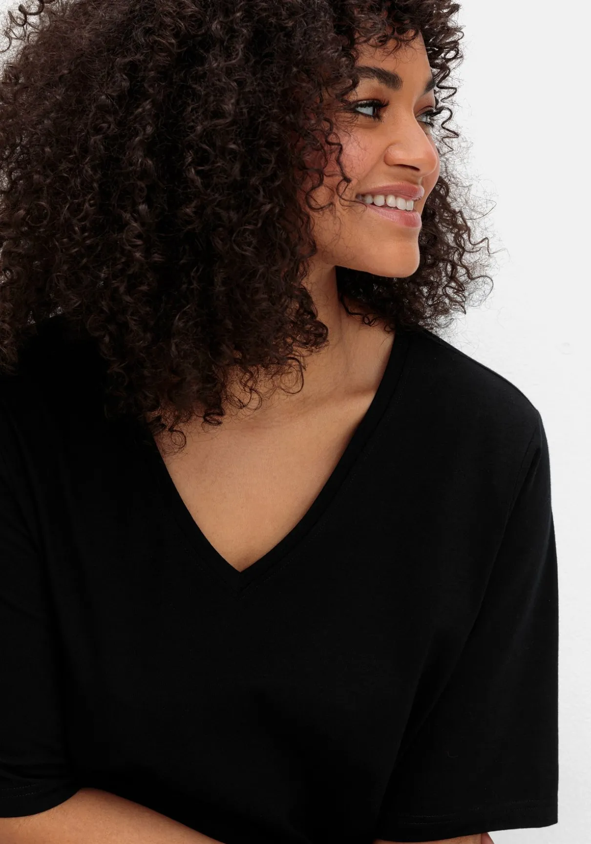 Shirt in leicht elastischer Qualität. Der feminine V-Ausschnitt wirkt optisch streckend, die verlängerten Halbärmel schmeicheln den Oberarmen. Der leicht taillierte Schnitt betont sanft die Figur und wird durch einen geraden Saumabschluss ergänzt. Ein praktisches Essential, das solo oder als Unterziehshirt getragen werden kann.