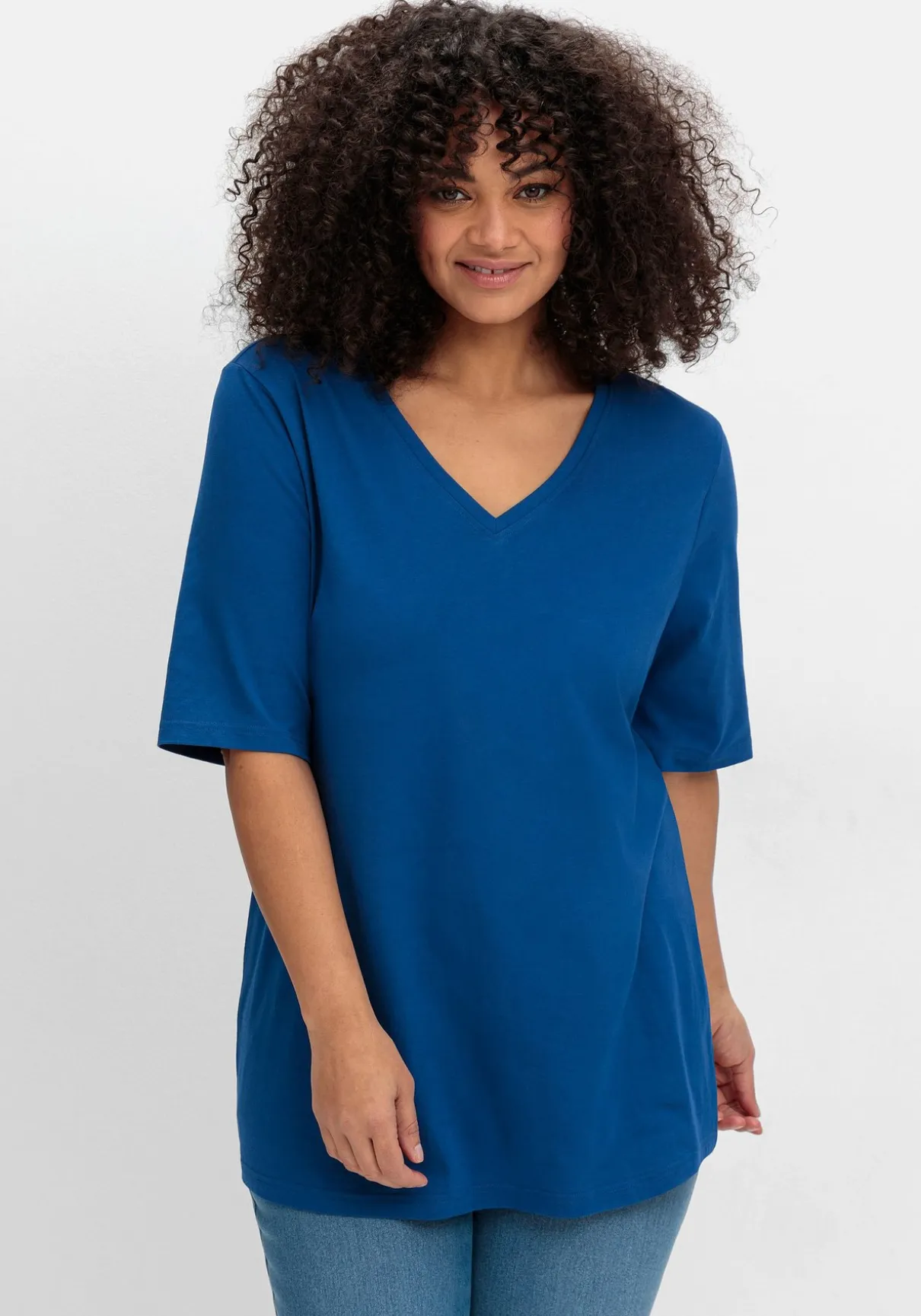 Shirt in leicht elastischer Qualität. Der feminine V-Ausschnitt wirkt optisch streckend, die verlängerten Halbärmel schmeicheln den Oberarmen. Der leicht taillierte Schnitt betont sanft die Figur und wird durch einen geraden Saumabschluss ergänzt. Ein praktisches Essential, das solo oder als Unterziehshirt getragen werden kann.