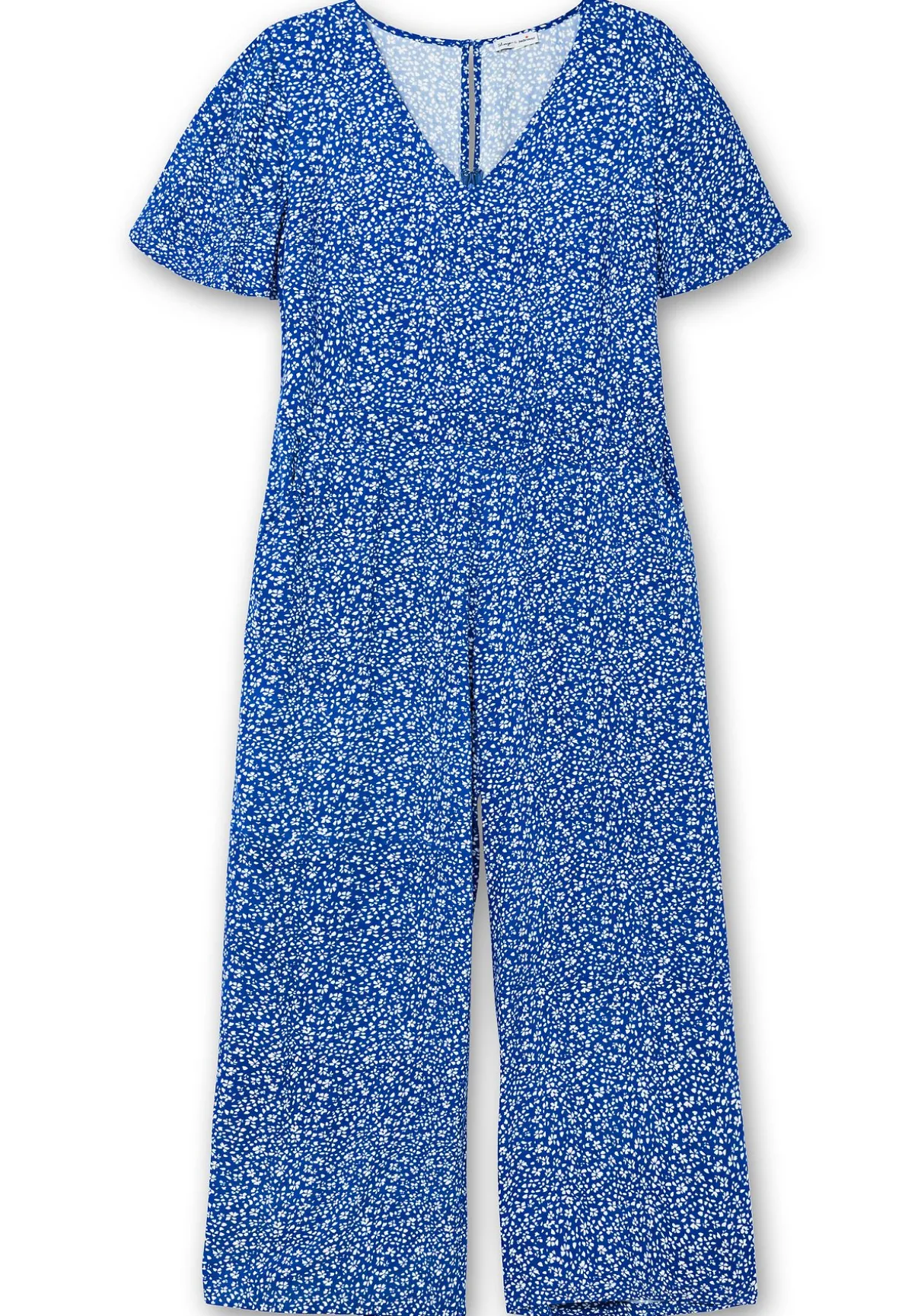 Overall von sheego by Joe Browns mit weitem, geradem Bein. Der zarte Millefleurs-Print sorgt genau wie die kurzen Flügelärmel und der leicht gerundete V-Ausschnitt für einen femininen Look. Im Rücken formt ein leicht gekräuselter elastischer Bund schmeichelnd die Figur, für einen guten Sitz ist der Bund vorn glatt verarbeitet. Unter dem Schlüssellochausschnitt mit stoffbezogenem Knopf hat der Jumpsuit außerdem einen nahtfeinen Reißverschluss im Rücken und schräg eingesetzte Eingrifftaschen.