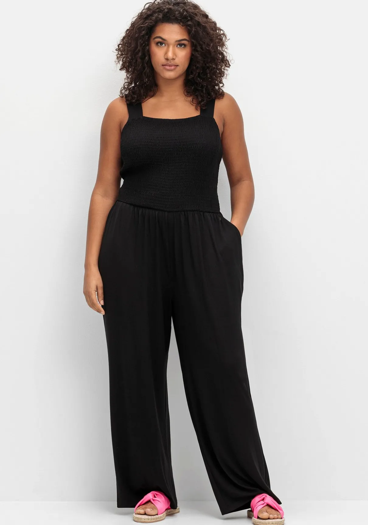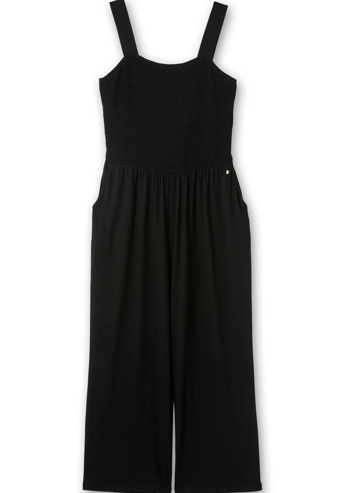 Jumpsuit aus Jersey. Das gesamte Oberteil ist bis auf die schmalen Träger gesmokt und sitzt dadurch figurbetont und bequem zugleich. Dazu kommt der modische Karree-Ausschnitt vorn und hinten. Die Hose ist am Bund leicht gerafft, wodurch sie schön locker und luftig fällt. Praktisch sind die beiden seitlichen Taschen. Ein vielseitiger Einteiler für die Freizeit und Strand, der mit den richtigen Accessoires auch partytauglich wird – perfekt für deinen Urlaubskoffer!