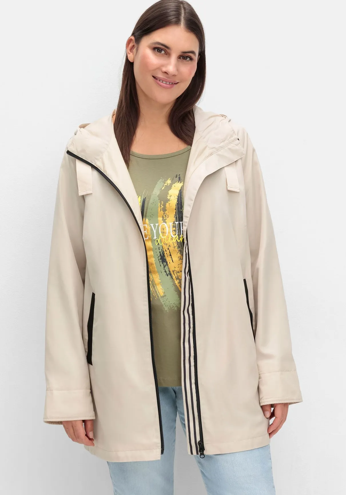 Die Outdoorjacke ist figurumspielend geschnitten und besitzt eine Po-bedeckende Länge.