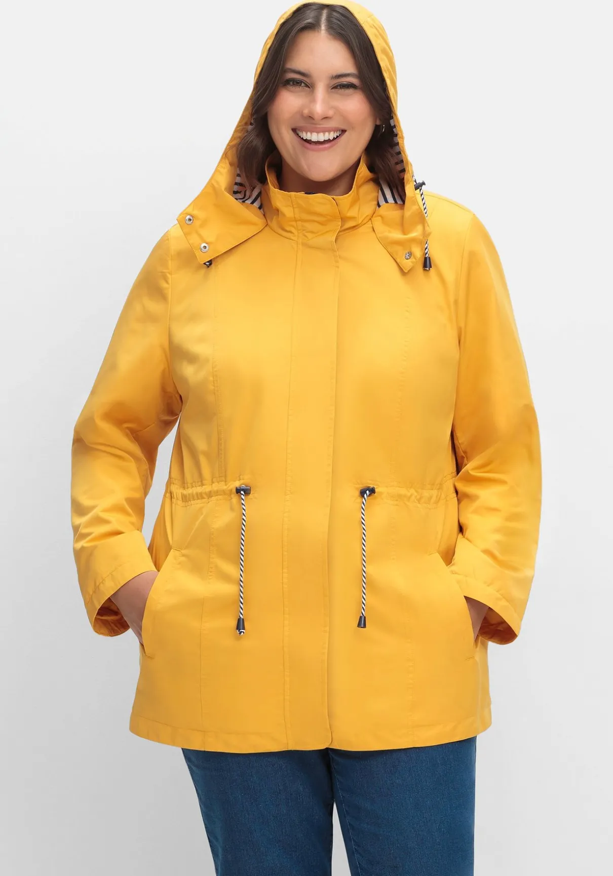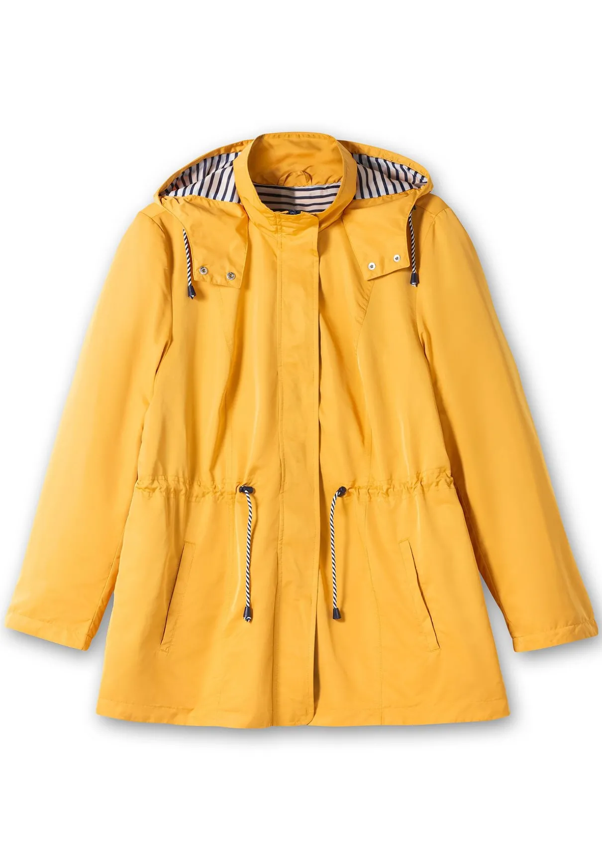Leichte Jacke mit weitenregulierbarer Kapuze. Für maritime Akzente sorgt das gestreifte Innenfutter. Ausgestattet ist die Jacke mit einem durchgehenden Reißverschluss und einer verdeckten Druckknopfleiste. Der Tunnelzug mit Stoppern setzt die Taille in den Fokus. Zwei Leistentaschen ergänzen den sportiven Style.