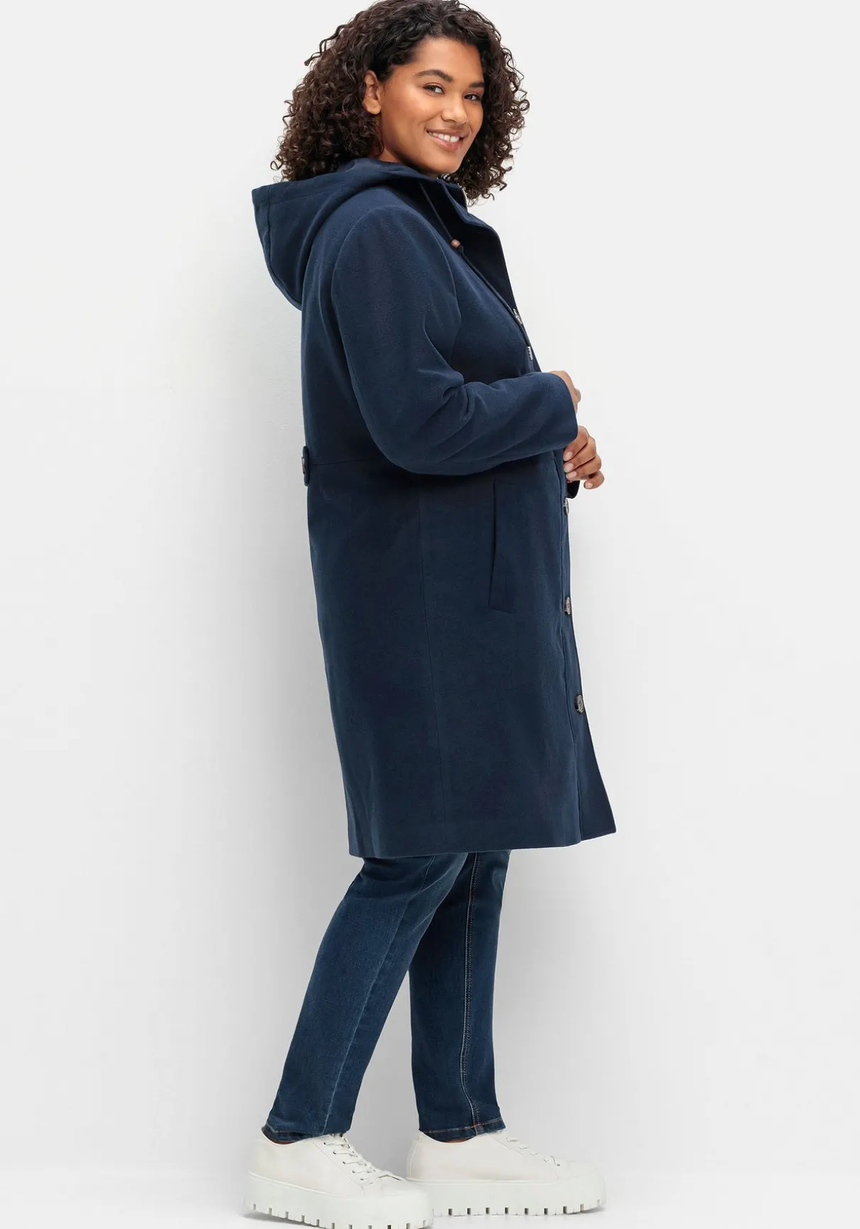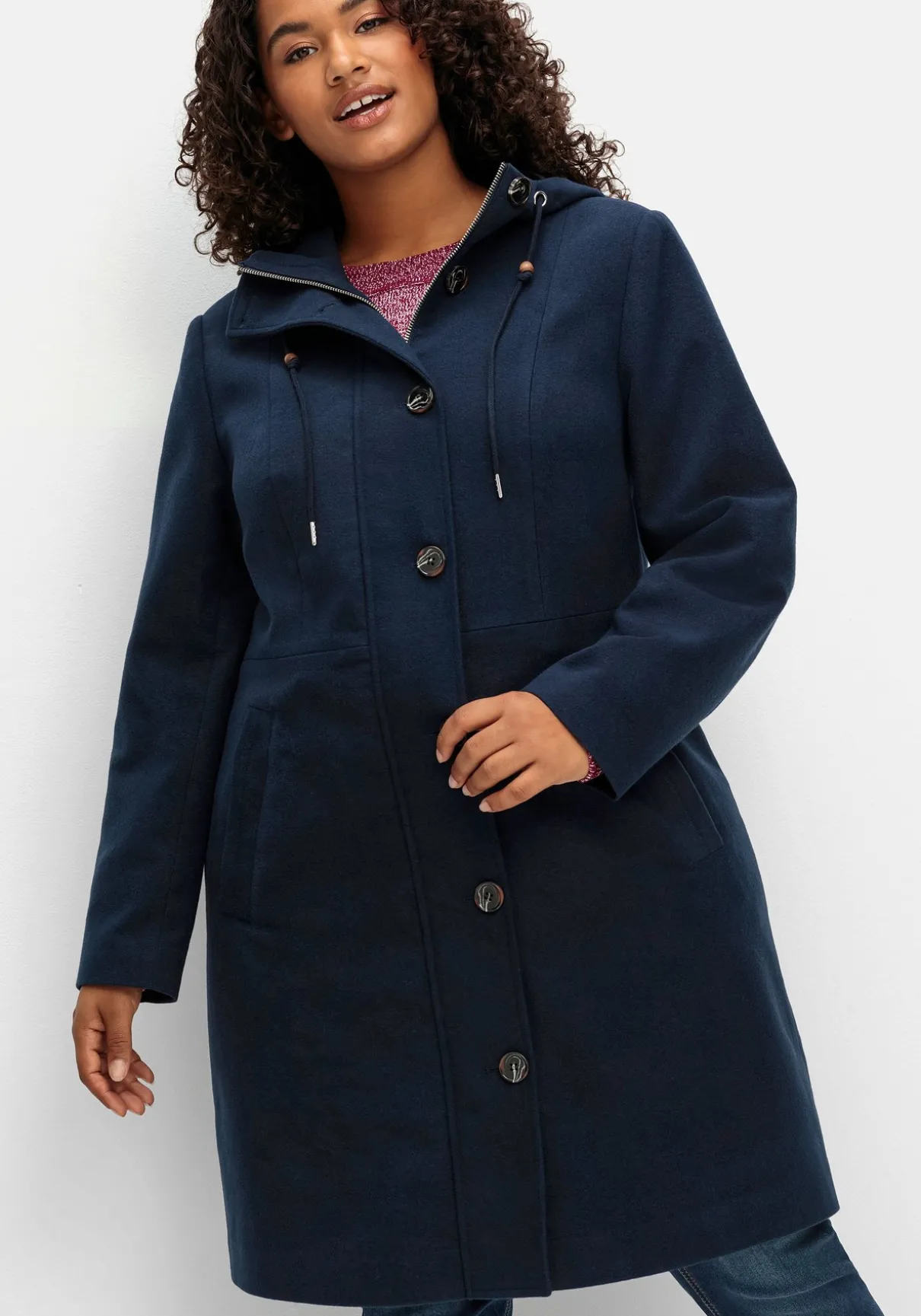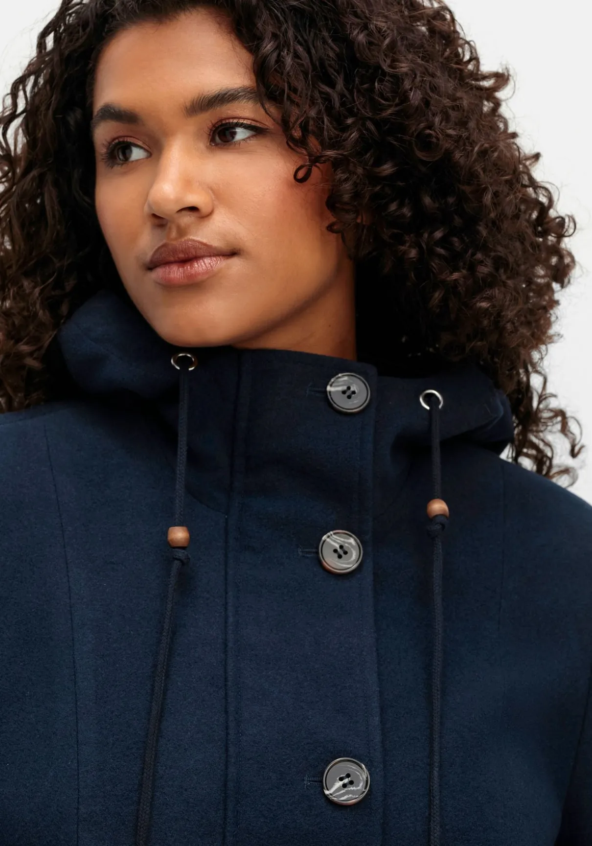 Mantel mit Kapuze. Durch die leichte A-Linie mit hoch angesetzter Taille fällt der Mantel angenehm locker, mit Hilfe eines innenliegenden Tunnelzugs lässt er sich zusätzlich in der Weite regulieren. Die markante Knopfleiste wird durch einen verdeckten Zwei-Wege-Reißverschluss ergänzt, praktisch sind die seitlichen Eingrifftaschen. Ein Zierriegel im Rücken rundet den Look sportiv ab.