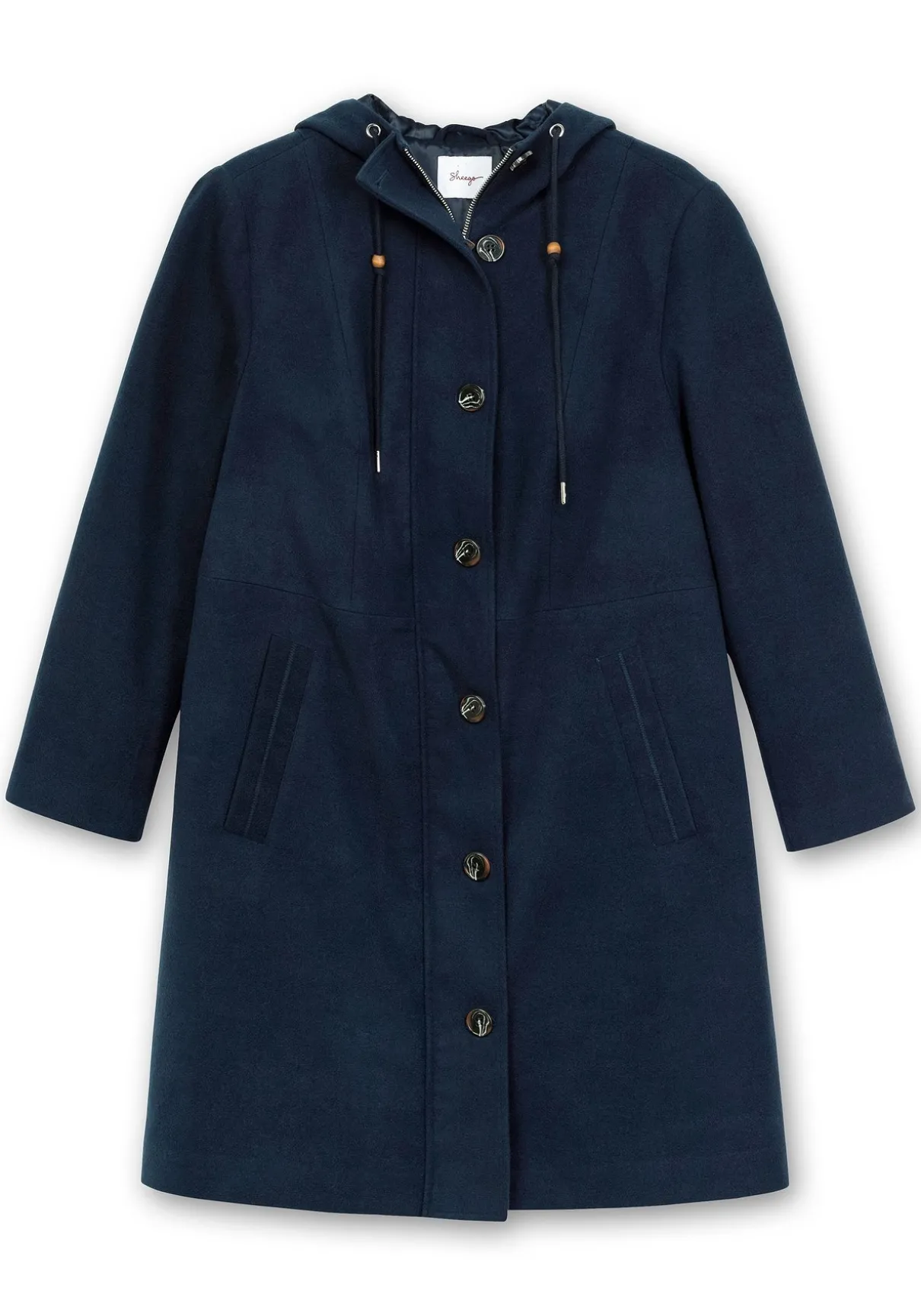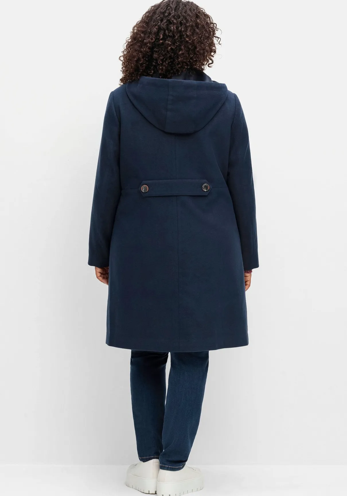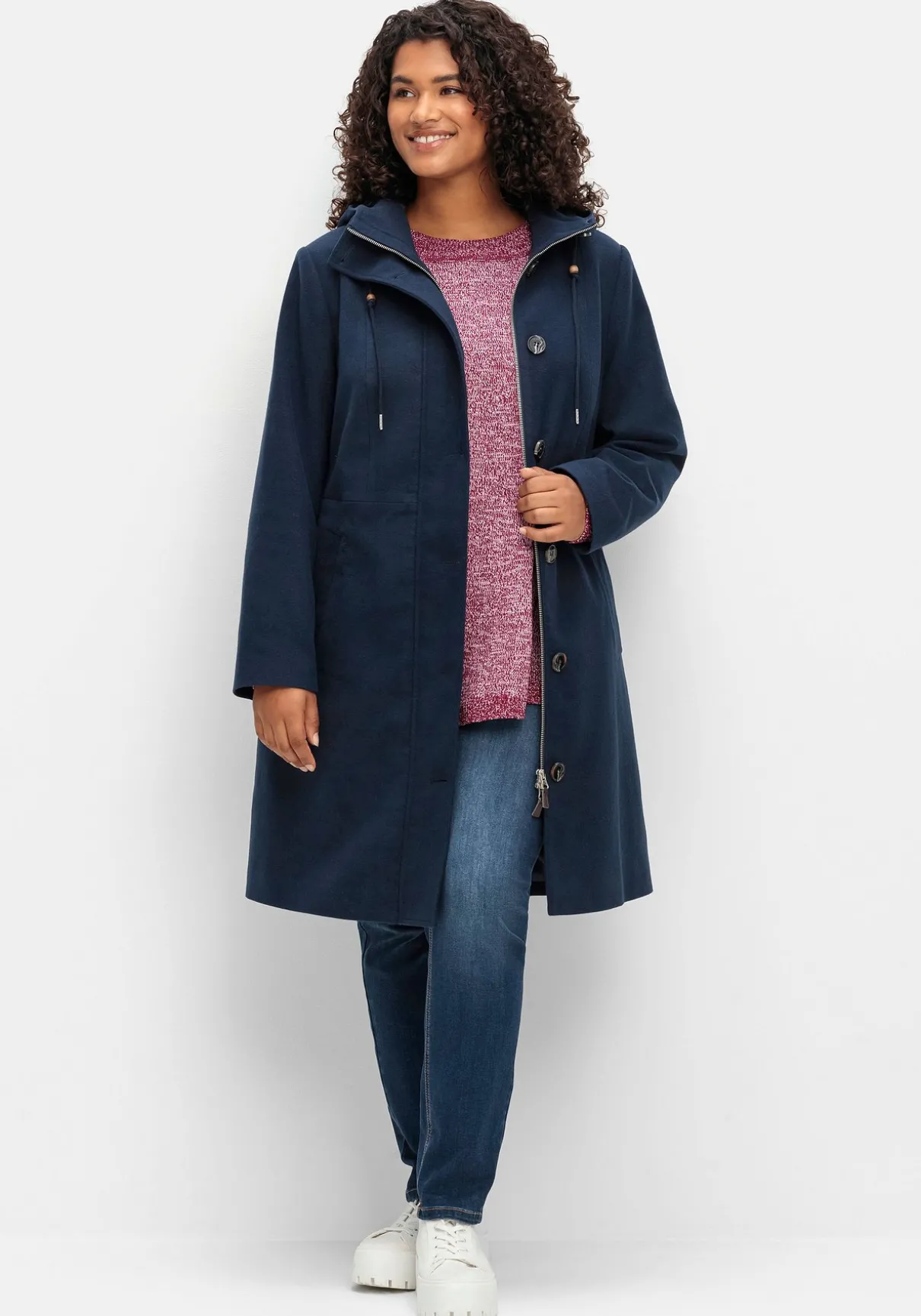 Mantel mit Kapuze. Durch die leichte A-Linie mit hoch angesetzter Taille fällt der Mantel angenehm locker, mit Hilfe eines innenliegenden Tunnelzugs lässt er sich zusätzlich in der Weite regulieren. Die markante Knopfleiste wird durch einen verdeckten Zwei-Wege-Reißverschluss ergänzt, praktisch sind die seitlichen Eingrifftaschen. Ein Zierriegel im Rücken rundet den Look sportiv ab.