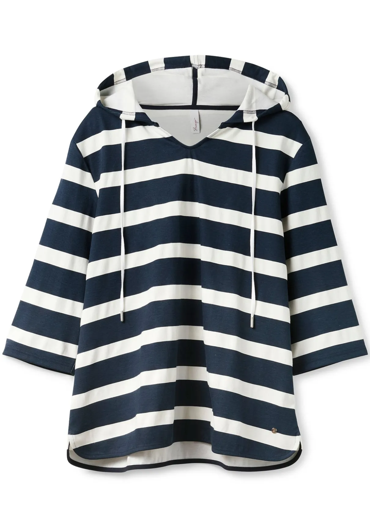 Gestreiftes Shirt mit 3/4-Arm. Für den sportlich-maritimen Look sorgen die breiten Blockstreifen genauso wie die Kapuze mit Bindeband. Auch der V-Ausschnitt und der 3/4-Arm unterstreichen die entspannte Optik. Der abgerundete Saum lässt das Shirt lässig fallen, seitliche Schlitze geben dem Fit mehr Bewegungsfreiheit.