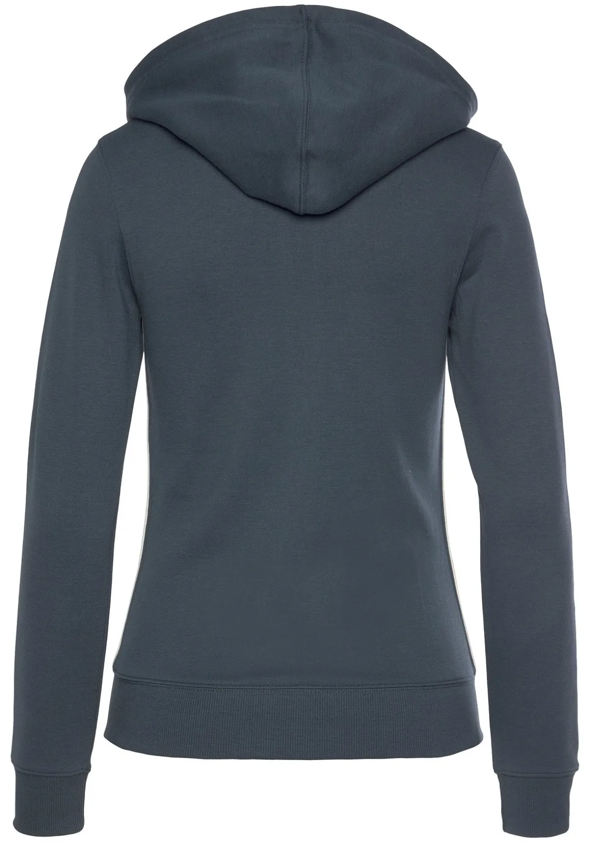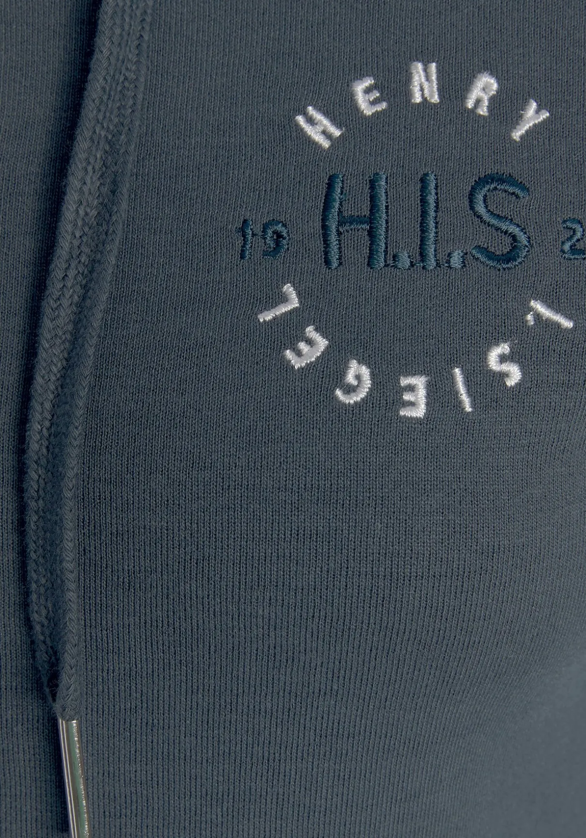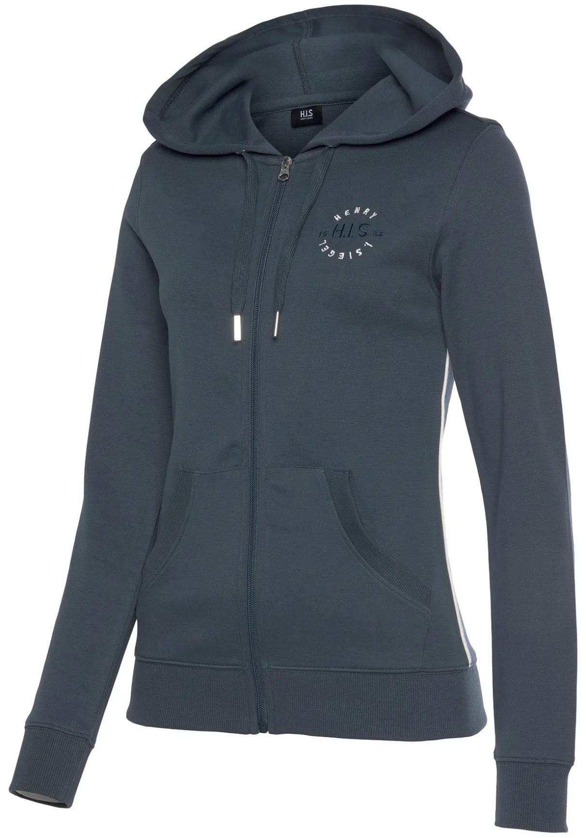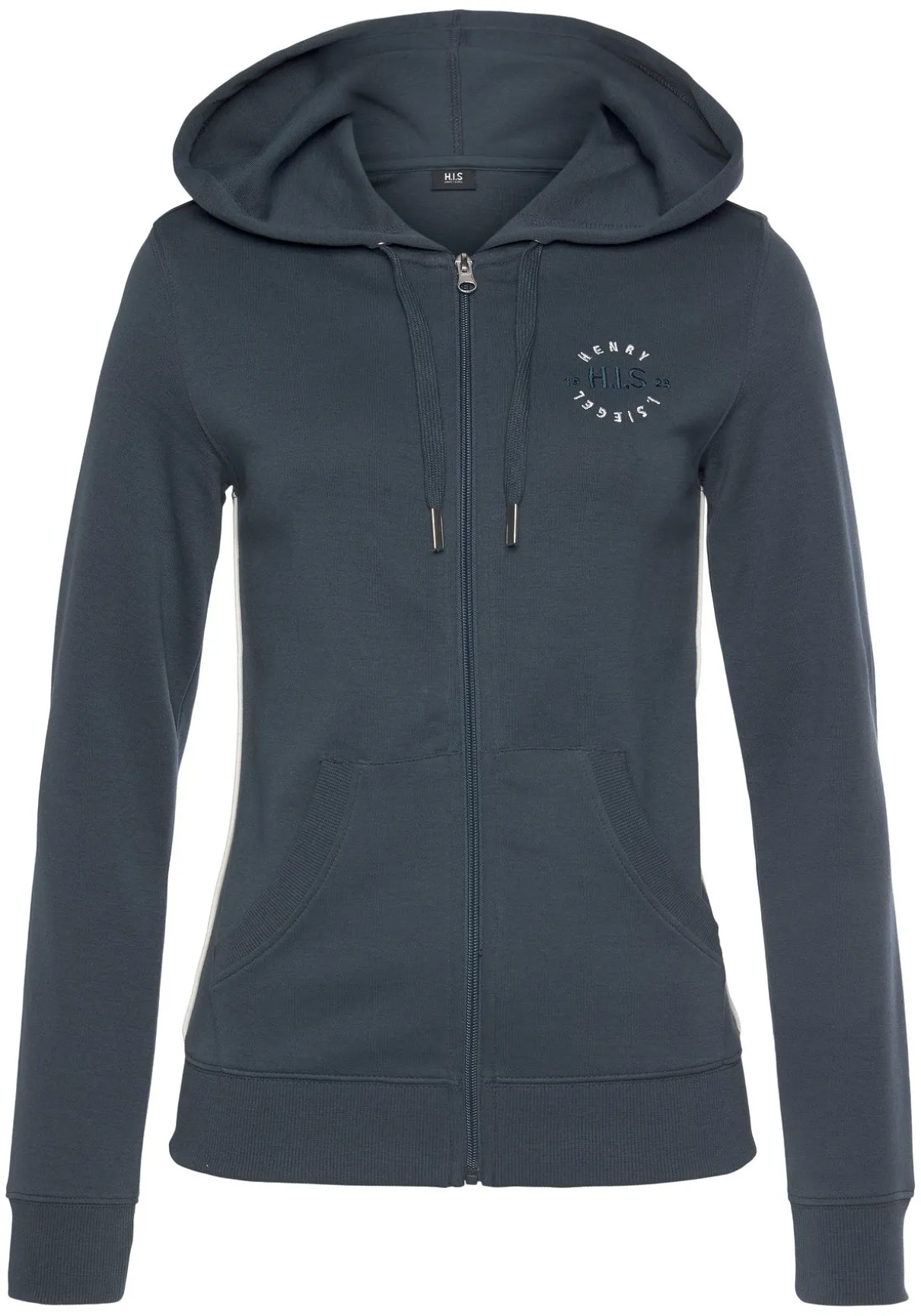 Kapuzensweatjacke von H.I.S. Kleine Logostickerei auf der Brust. Kontrastpaspeln seitlich. Geteilte Kängurutasche. Gerippte Bündchen. Kordelzug an der Kapuze. Elastische, weiche Interlockqualität.