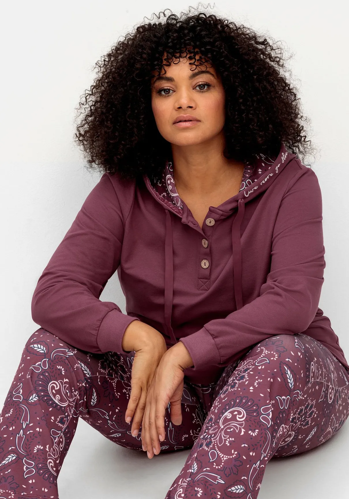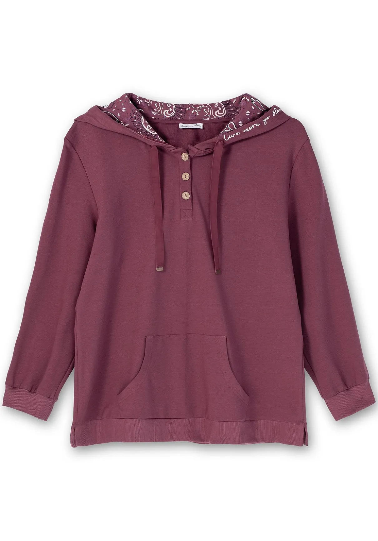 Kapuzensweatshirt von sheego by Joe Browns, mit kurzer Knopfleiste und dekorativen Knöpfen in Holzoptik. Der Relaxstyle erhält durch das filigrane Paisley-Innenfutter der Kapuze und das Bindeband in Samtoptik eine feminin-verspielte Note. Außen an der Kapuze zeigt sich eine kleine Wording-Stickerei in Kontrast, elastische Rippbündchen schließen bequem am Ärmelabschluss und Saum ab. Praktisch ist die Kängurutasche, die zusammen mit der Kapuze für eine sportive Optik sorgt. Seitliche Schlitze am geraden Saum lassen den Hoodie locker über die Hüfte fallen. Ein perfekter Wohlfühl-Look, der wunderbar mit anderen Teilen aus unserer Homewear Kollektion kombiniert werden kann.