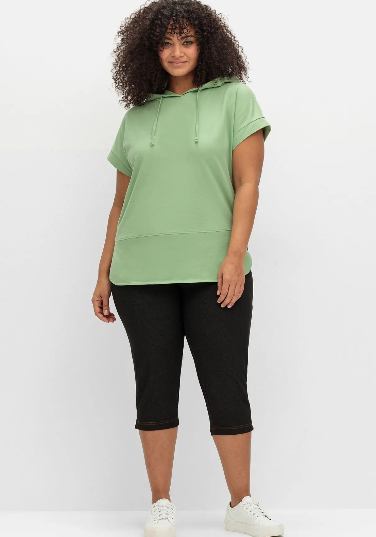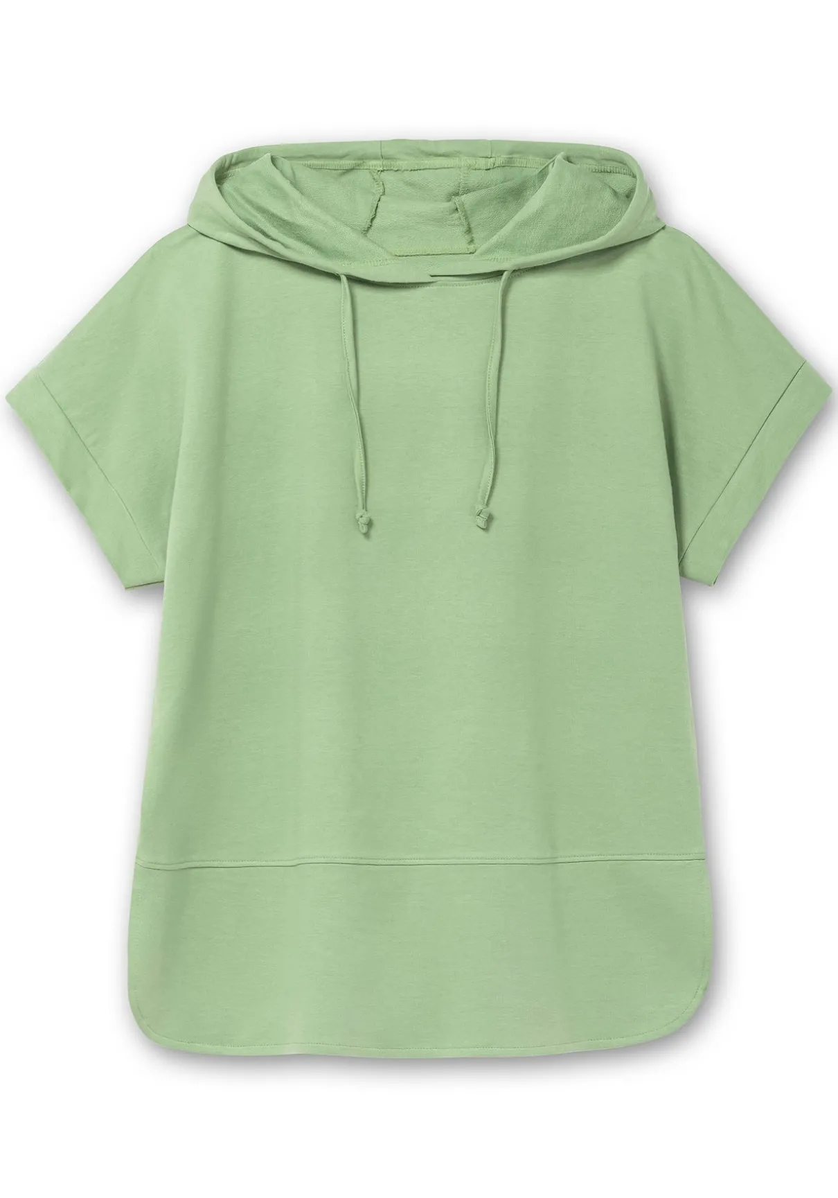 Sweatshirt mit kurzen Ärmeln. Die Kapuze mit Bindeband und die überschnittenen Schultern geben dem Shirt seinen lässigen Look. Am Saum fallen die Teilungsnaht und die abgerundeten Seitenschlitze ins Auge. Kurze Ärmel mit Bündchen unterstreichen den legeren Stil.