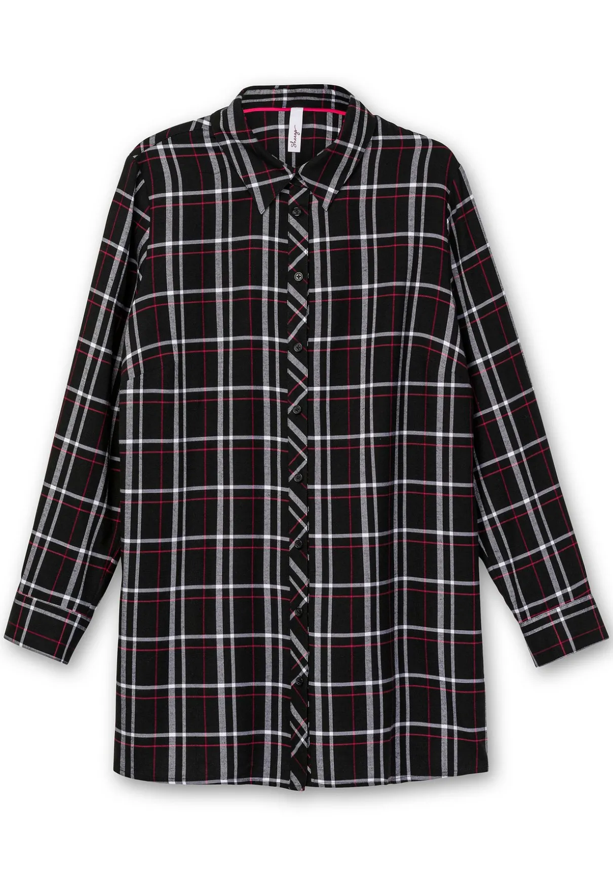 Longbluse mit Karomuster. Die legere Bluse ist mit einem klassischen Hemdblusenkragen und einer durchgehenden Knopfleiste versehen. Die langen Ärmel enden mit Manschetten und Knöpfen. Seitliche Schlitze und eine Passe hinten mit Kellerfalte sorgen für den bequemen Sitz.