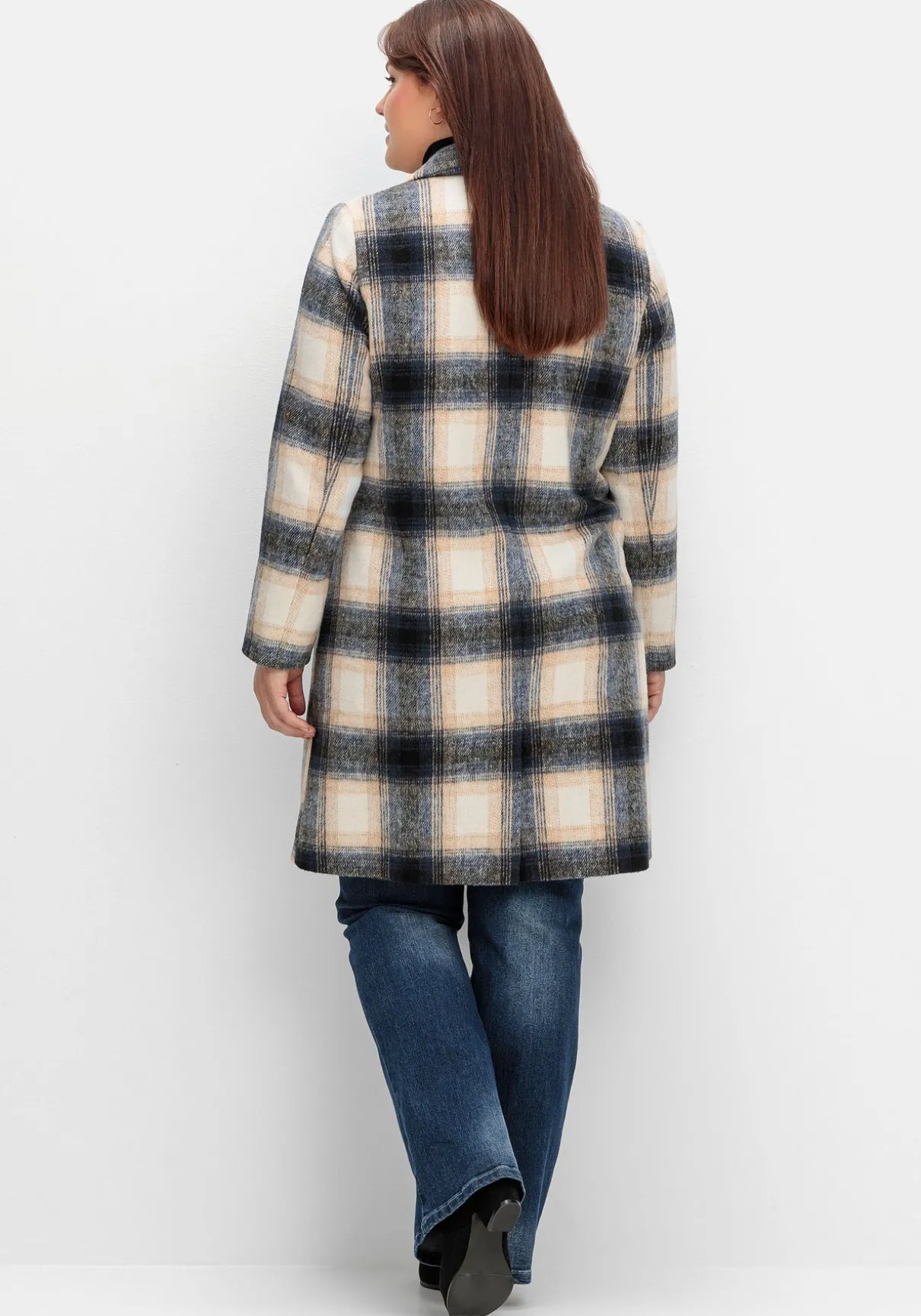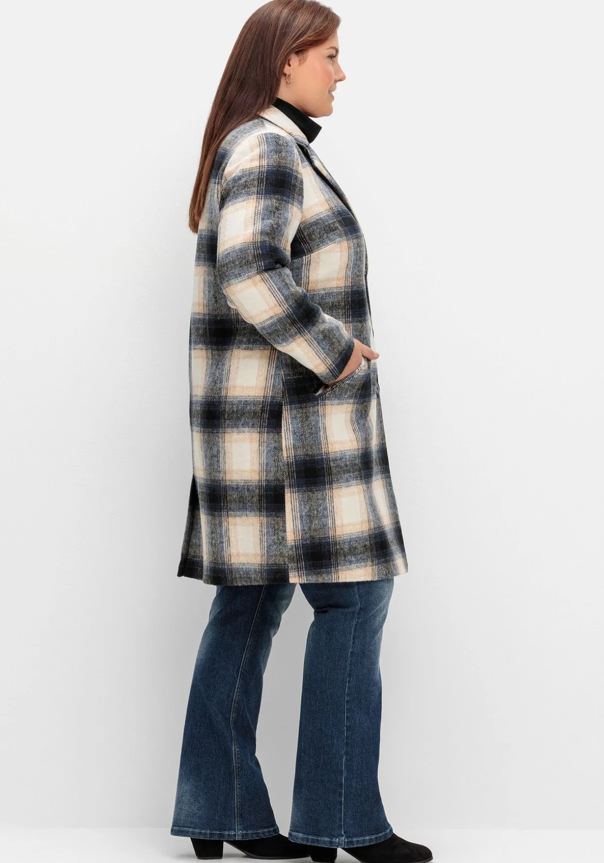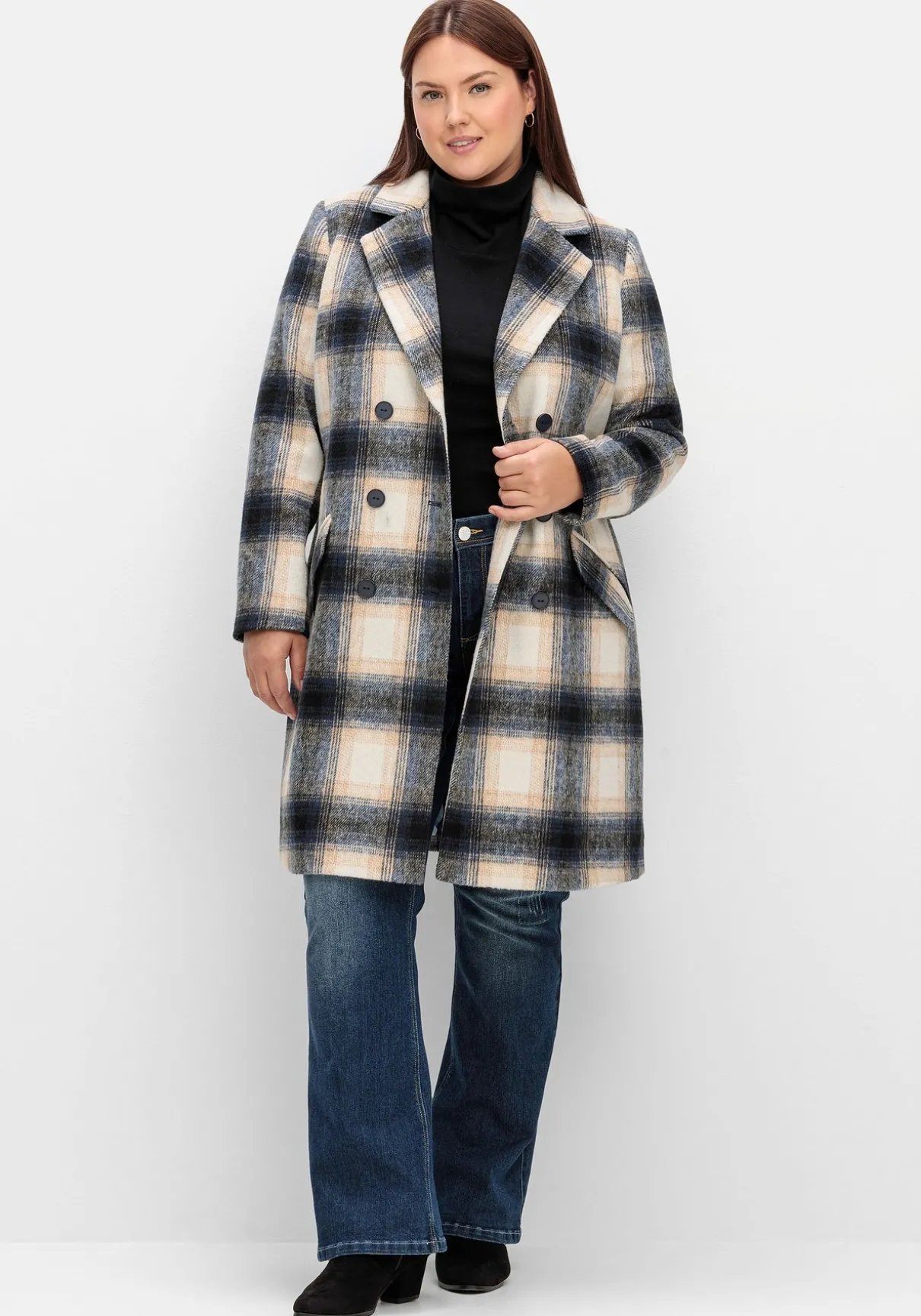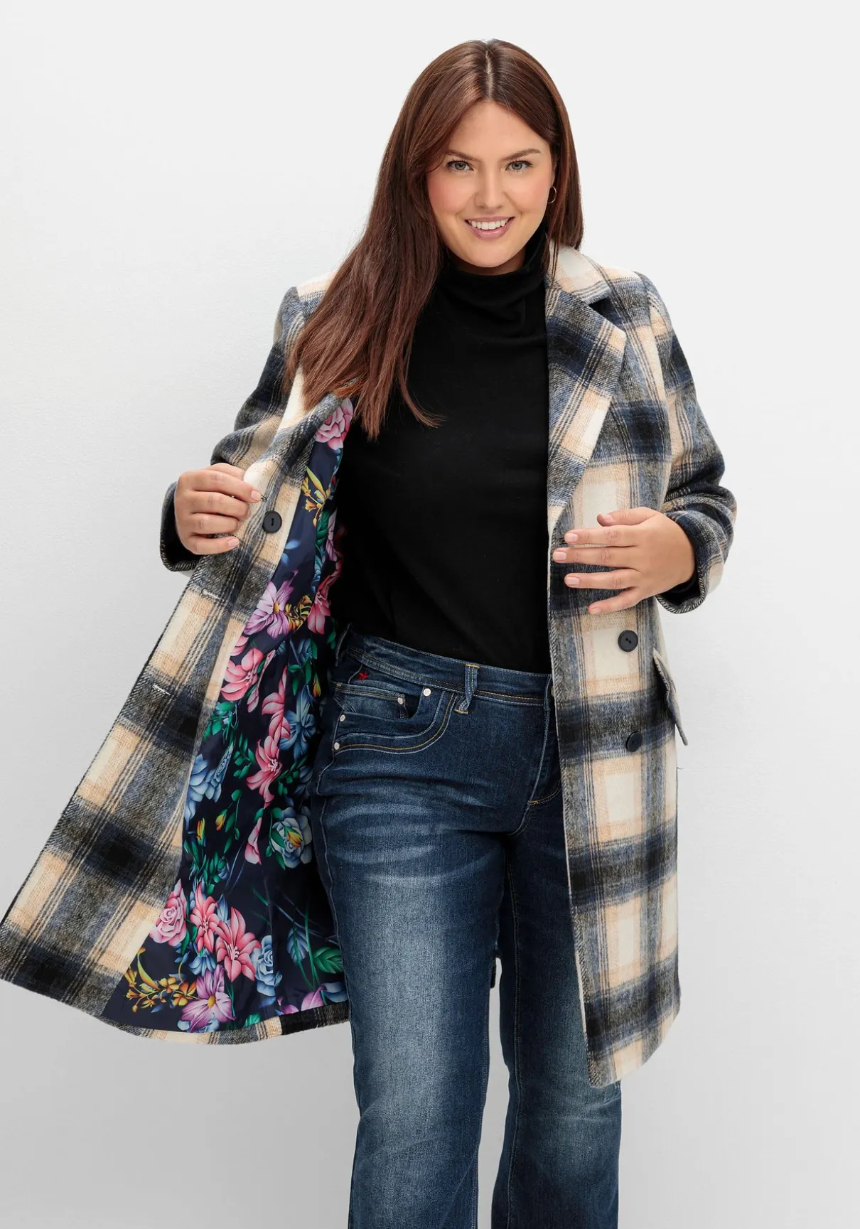 Kurzmantel mit Wolle von sheego by Joe Browns. Das ausdrucksstarke Karomuster wird durch einen klassischen Schnitt stilvoll ergänzt. So ist der Mantel mit großem Reverskragen und doppelreihiger Knopfleiste gearbeitet. Dazu kommen zwei schräge Pattentaschen und ein Gehschlitz hinten, der für Bewegungsfreiheit sorgt. Modischer Eyecatcher ist das mit Blumen bedruckte Satinfutter innen.