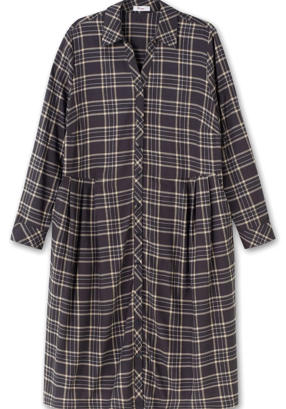 Blusenkleid im Karomuster. Für den charakteristischen Look sorgen Hemdkragen, durchgehende Knopfleiste und Manschettenärmel. Die mit angelegten Falten gearbeitete Taillennaht gibt der Silhouette Form. Praktisch sind die seitlichen Eingrifftaschen, die seitlichen Schlitze sorgen für Bewegungsfreiheit.